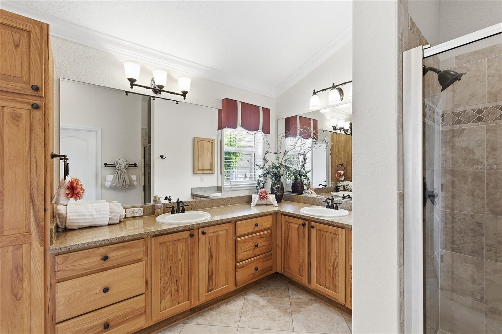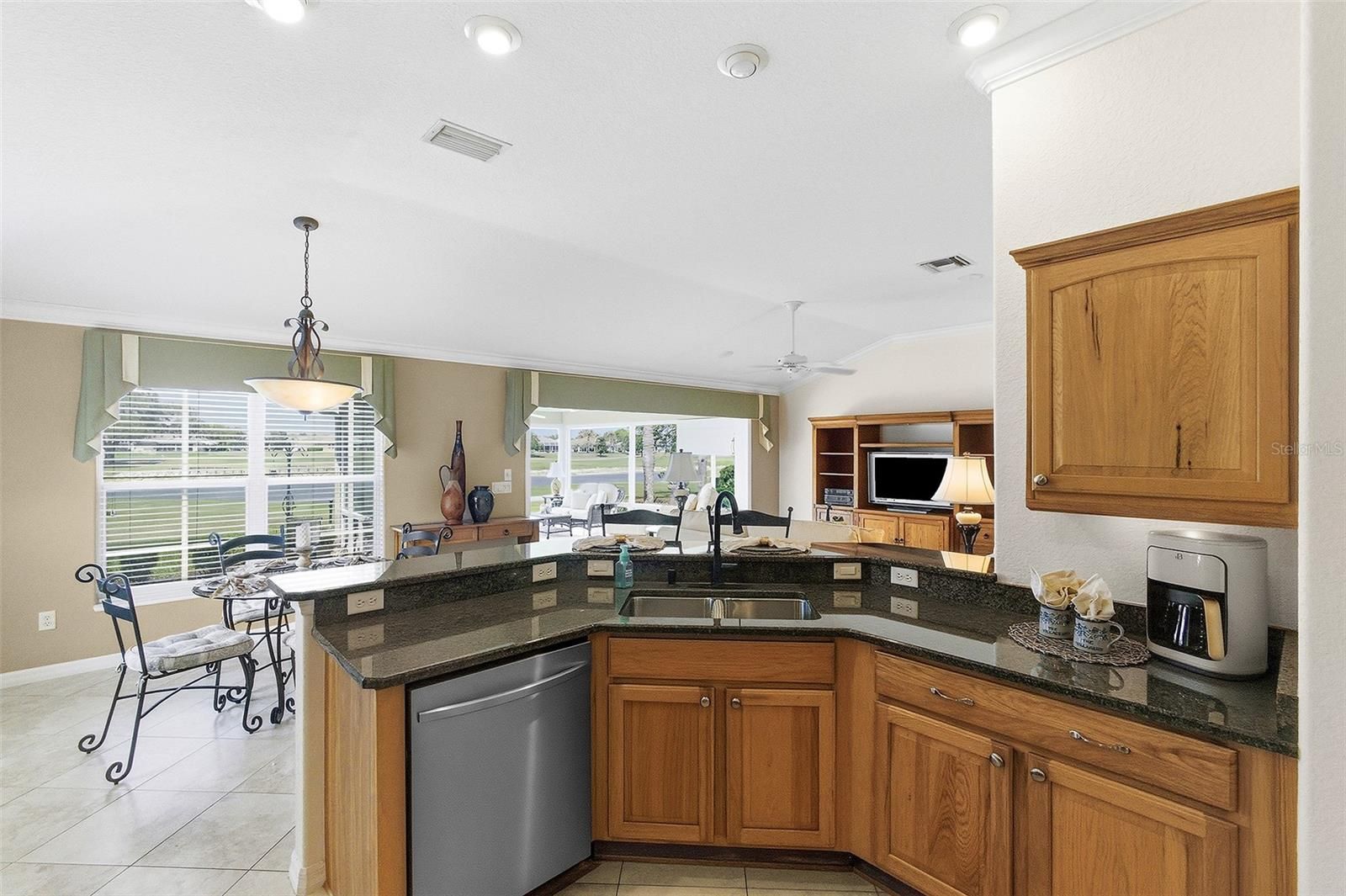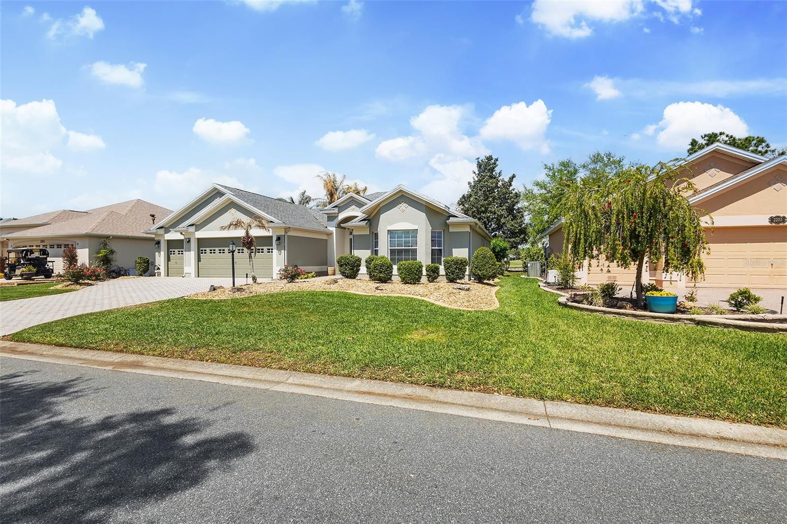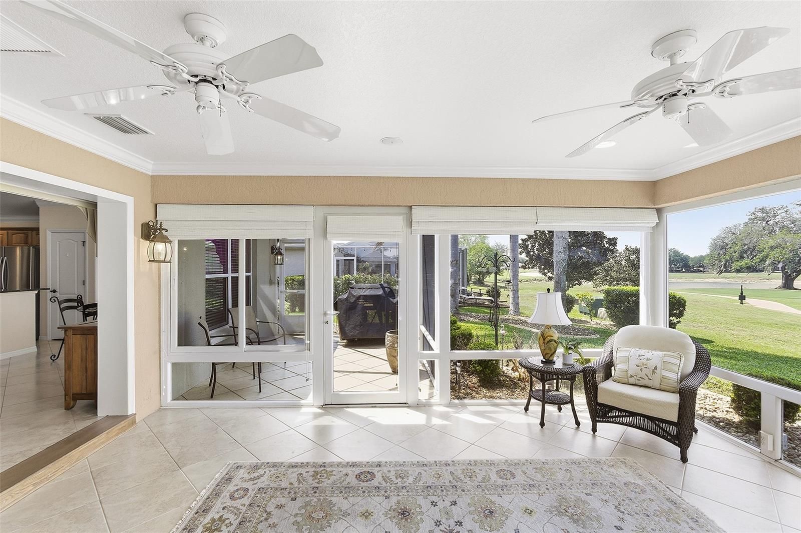 Panoramic Golf & Water Views | Turnkey Furnished | ROOF 2022 | HVAC 2021 | 2-Car + Golf Cart Garage with Carts Included * NO BOND Welcome Home to this beautifully expanded Lantana model in the highly desirable Village of Bonnybrook, where breathtaking panoramic views of the golf course and a shimmering pond create a truly unforgettable backdrop. From the moment you arrive, the pavered driveway, enhanced by low-maintenance landscaping, sets the tone for the care and quality found throughout this exceptional home. Step inside to discover a light-filled interior with VOLUME CEILINGS and CROWN MOLDING that elevate the space, while tile flooring flows seamlessly through the main living areas. The thoughtfully expanded layout offers additional living space, highlighted by an ENCLOSED GLASS LANAI that brings the outdoors in and allows you to enjoy the SPECTACULAR VIEWS year-round. Solar tubes add an abundance of natural light, creating a warm and inviting atmosphere throughout the home. The kitchen is both stylish and functional, featuring granite countertops, stainless steel appliances with gas stove, ample cabinetry, and a layout that opens effortlessly to the dining and living areas—perfect for entertaining or everyday living. The home is offered turnkey with TASTEFUL FURNISHINGS and home goods, making it truly move-in ready. The spacious primary suite serves as a private retreat, designed for both comfort and functionality. Enjoy a SPACIOUS custom walk-in closet outfitted with tailored shelving to maximize organization and storage. The en-suite bathroom is equally impressive, featuring dual vanities with granite countertops, abundant cabinetry, and a beautifully tiled shower complete with a built-in bench for added comfort and ease. Two additional guest bedrooms—each with closets—offer flexibility for visiting guests, a home office, or hobby space, while the guest bathroom is thoughtfully appointed with matching granite finishes and includes a solid surface tub/shower combination. Step out back to your private outdoor oasis where the BIRDCAGE and open patio space create the perfect setting for grilling, relaxing, and soaking in the sweeping golf and water views. Whether enjoying a quiet morning coffee or entertaining friends at sunset, this outdoor space is simply unmatched. The garage offers both functionality and convenience with a full two-car plus golf cart configuration, complete with windows for natural light and 2 GOLF CARTS INCLUDED for easy access to all The Villages has to offer. Perfectly positioned in Bonnybrook, you’re just minutes from Lake Sumter Landing, executive and championship golf courses, recreation centers, pools, shopping, and dining—placing the very best of The Villages lifestyle right at your fingertips. This is more than a home—it’s a front-row seat to some of the most stunning views in The Villages.