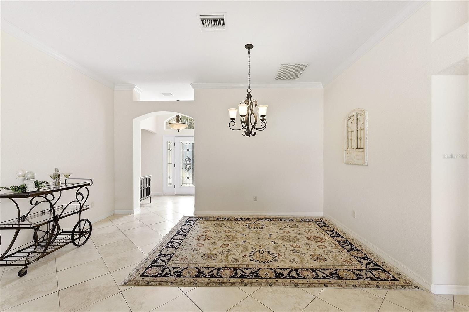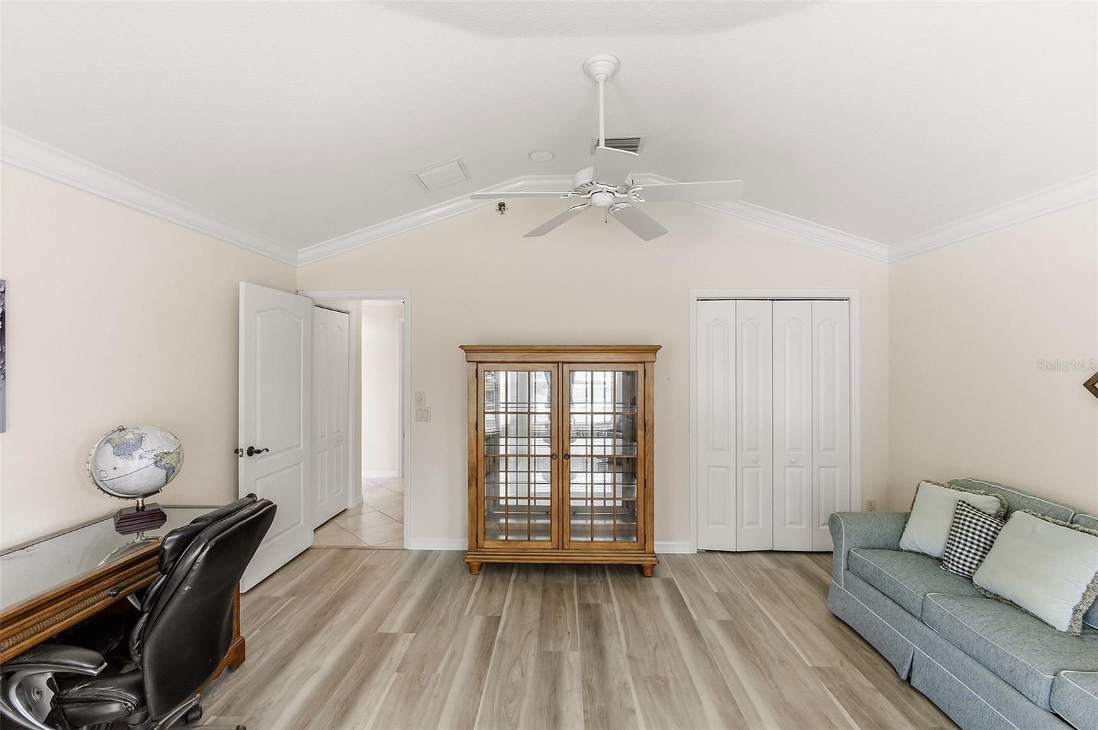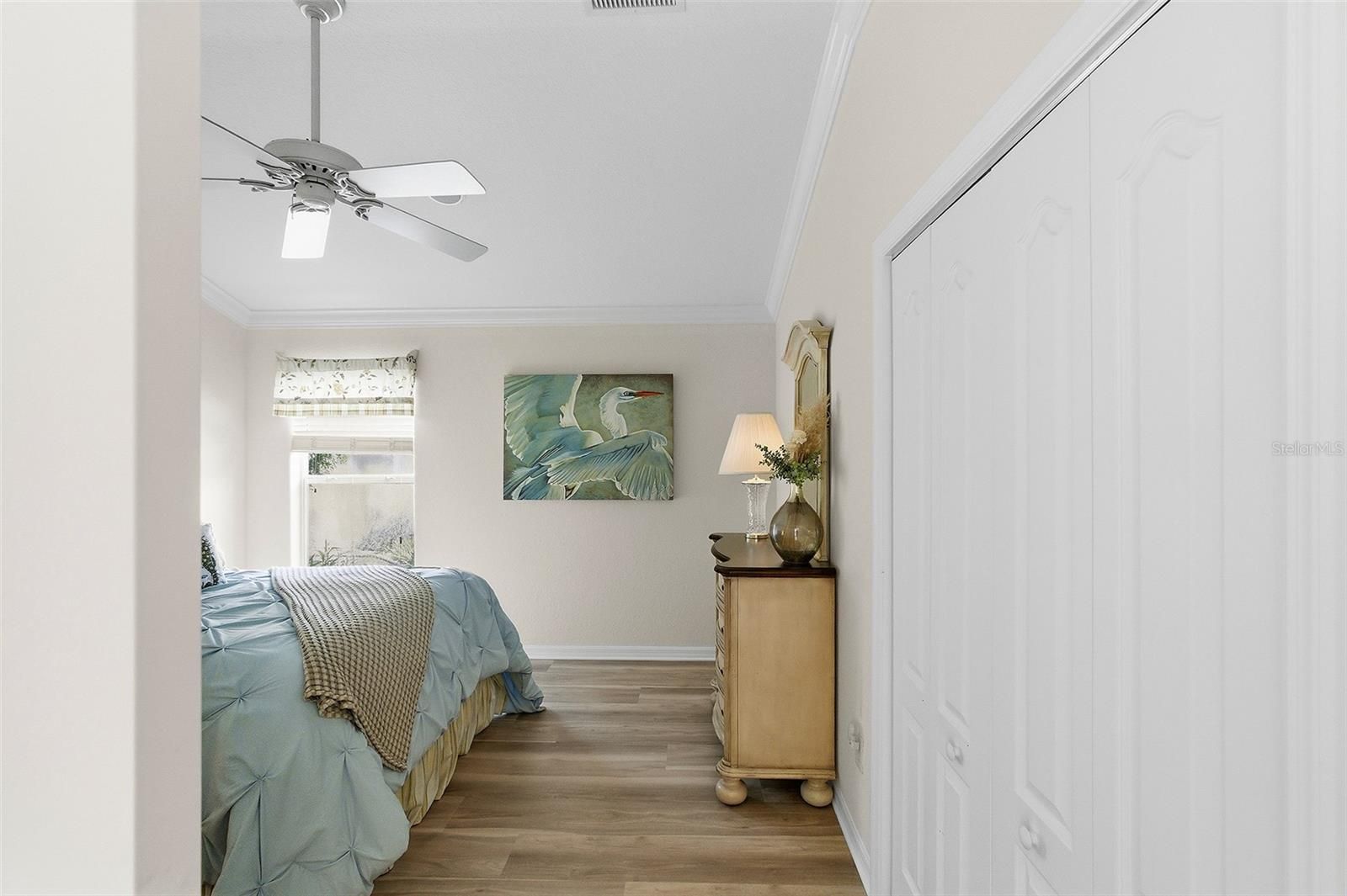 - Ceiling Fan(s), Crown Molding, Eat-in Kitchen, Living/Dining Room, Open Floorplan, Main Level Primary, Solid Surface Counters, Stone Counters, Tray Ceiling(s), Vaulted Ceiling(s), Walk-In Closet(s), Window Treatments