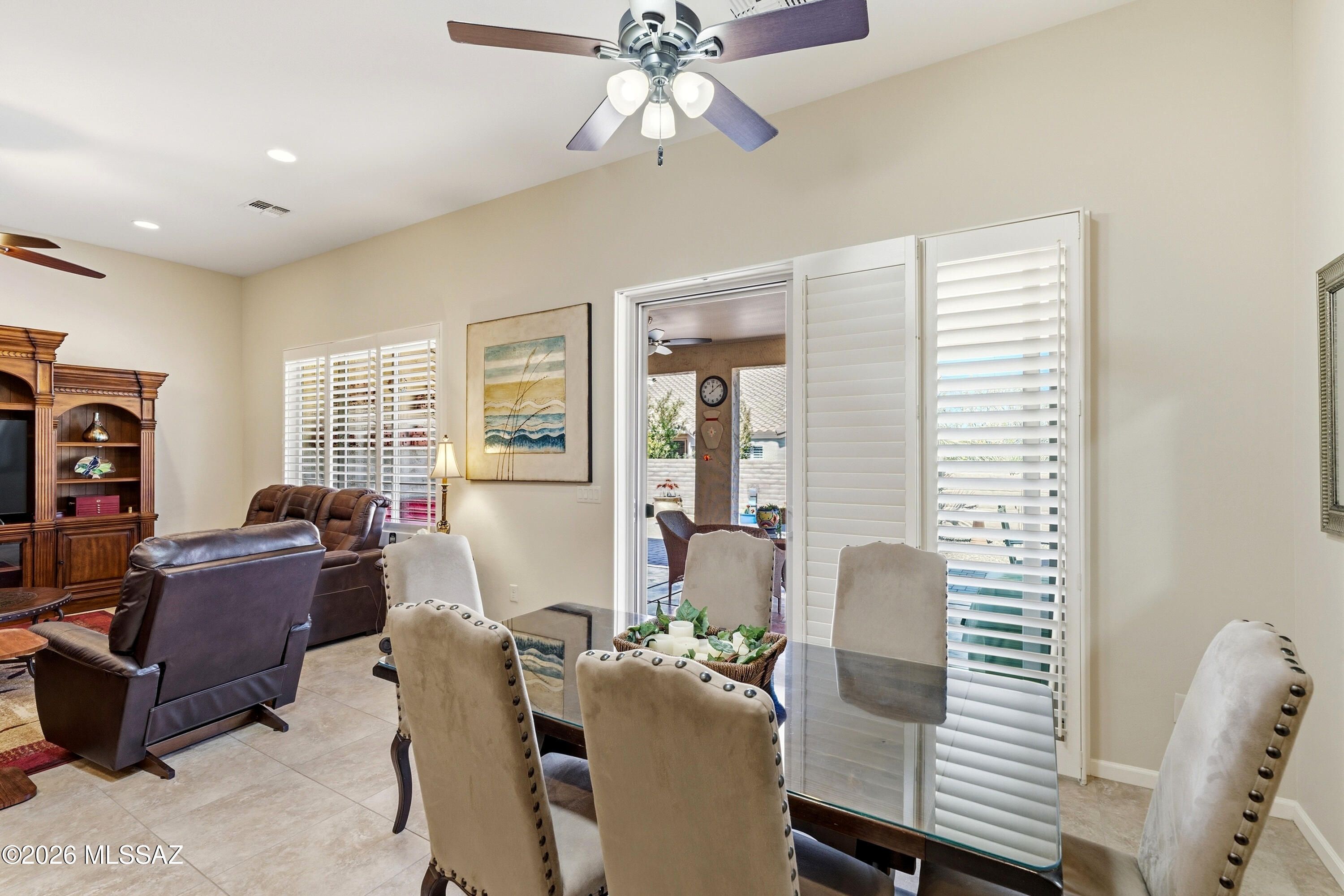 This beautifully maintained 2011 Agave model in Quail Creek offers 1,808 sq. ft., 2 BR, 2.5 BA, plus a versatile den, designed for both comfort and entertaining. A charming front paver courtyard welcomes you home and leads through the foyer into a spacious great room. Enjoy all-tile flooring, plantation shutters throughout, and upgraded fans and lighting that add style and comfort. The generous dining area comfortably seats six, perfect for hosting gatherings. The upgraded kitchen features granite countertops, abundant cabinetry with pull-out shelves in drawers and pantry, stainless steel appliances, a gas range, and an island with breakfast bar and pendant lighting. The extended owner's suite showcases a bay window, dual vanity bath with an all-tile shower, and a walk-in closet.