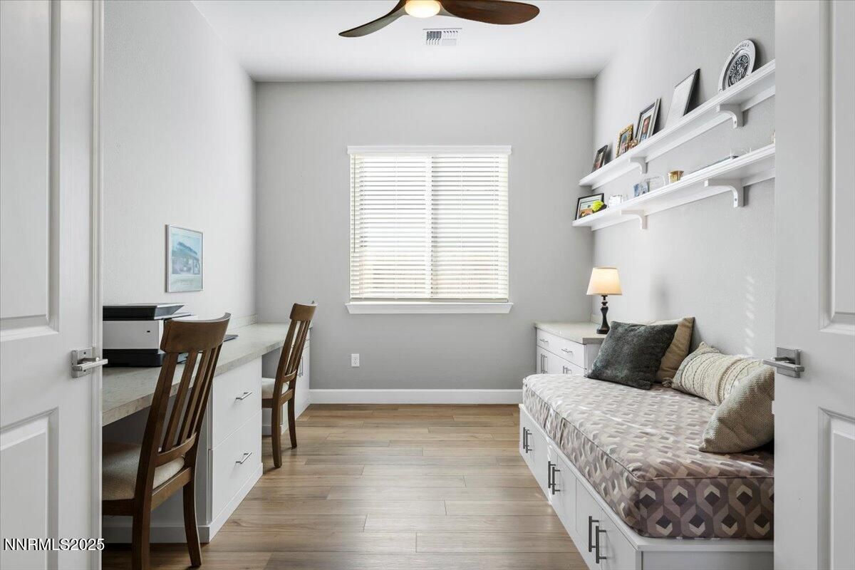 Stunning home in Regency at Caramella Ranch! Discover sophisticated single-level living in this immaculate 55+ residence offering over 2,200 sq. ft. of clean lines and modern elegance. The chef's kitchen showcases warm, rich natural wood toned cabinetry beautifully paired with granite countertops, stainless steel appliances, and a large island with ample bar seating—perfect for casual dining or entertaining. Enjoy abundant storage with a generous corner pantry and plenty of cabinets and counter space. A charming window above the sink overlooks the front of the home, adding natural light and charm. The open great room seamlessly extends to a spacious covered paver patio and low-maintenance landscaping featuring artificial turf and colorful plantings. An additional paver patio at the back provides the perfect spot to take in the stunning Sierra mountain views. A dedicated office with French doors offers built-in desks for two and a cozy built-in daybed—perfect for visiting grandkids or curling up with a good book. The serene primary suite features large windows, a luxurious bath with an oversized walk-in shower, and a thoughtfully designed closet with built-in organizers. A private guest suite is located at the front of the home, offering comfort and privacy for visitors. Luxury vinyl plank flooring flows through the main living areas, while the oversized laundry room offers a sink, plentiful cabinetry, and a bonus storage closet. The finished garage features an epoxy floor and overhead storage rack. Enjoy the best of resort-style living in this vibrant gated community with 24-hour staffed security, a full calendar of events, clubs, and activities, and exceptional amenities designed for an active adult lifestyle.