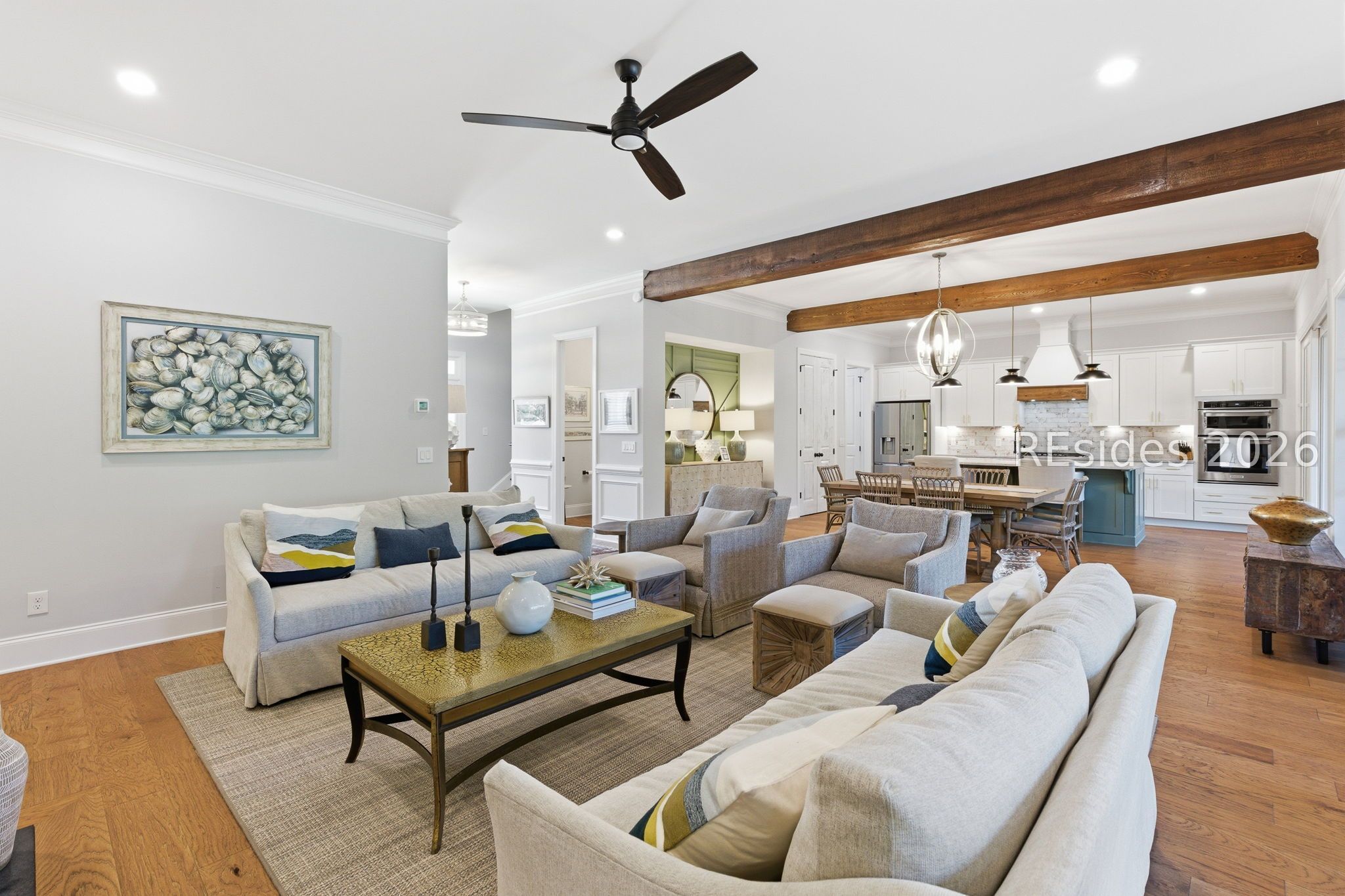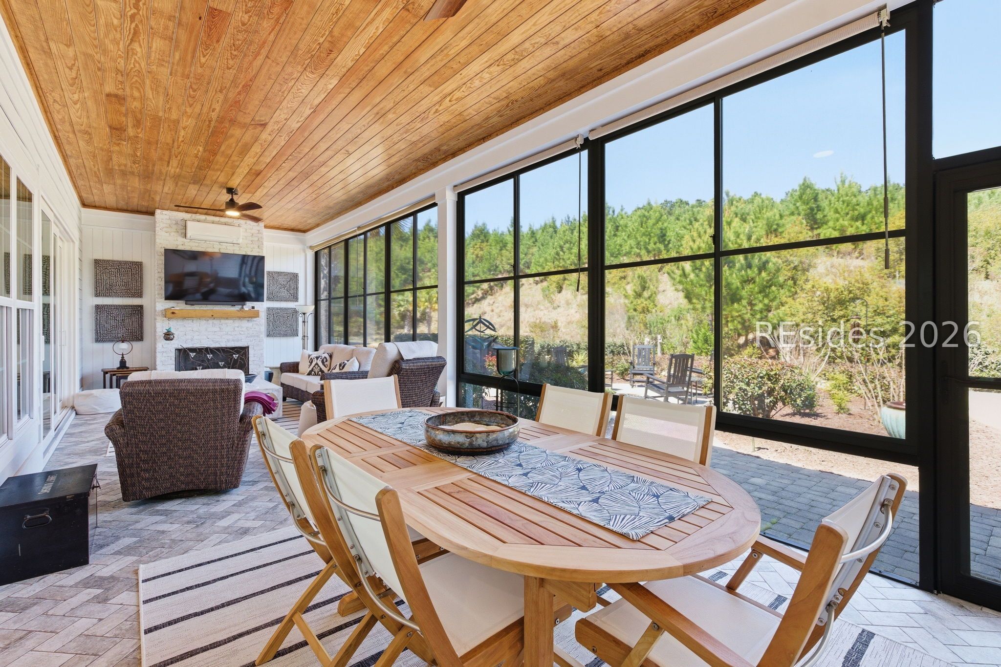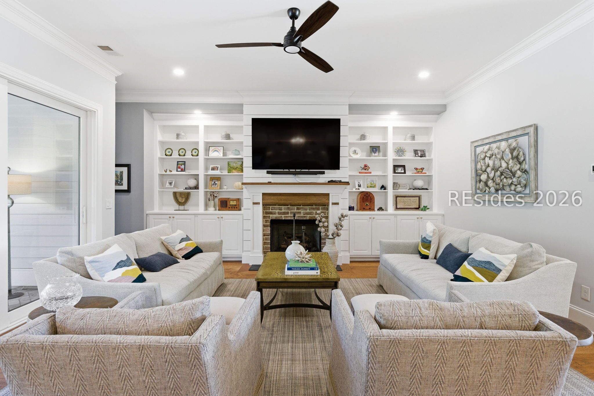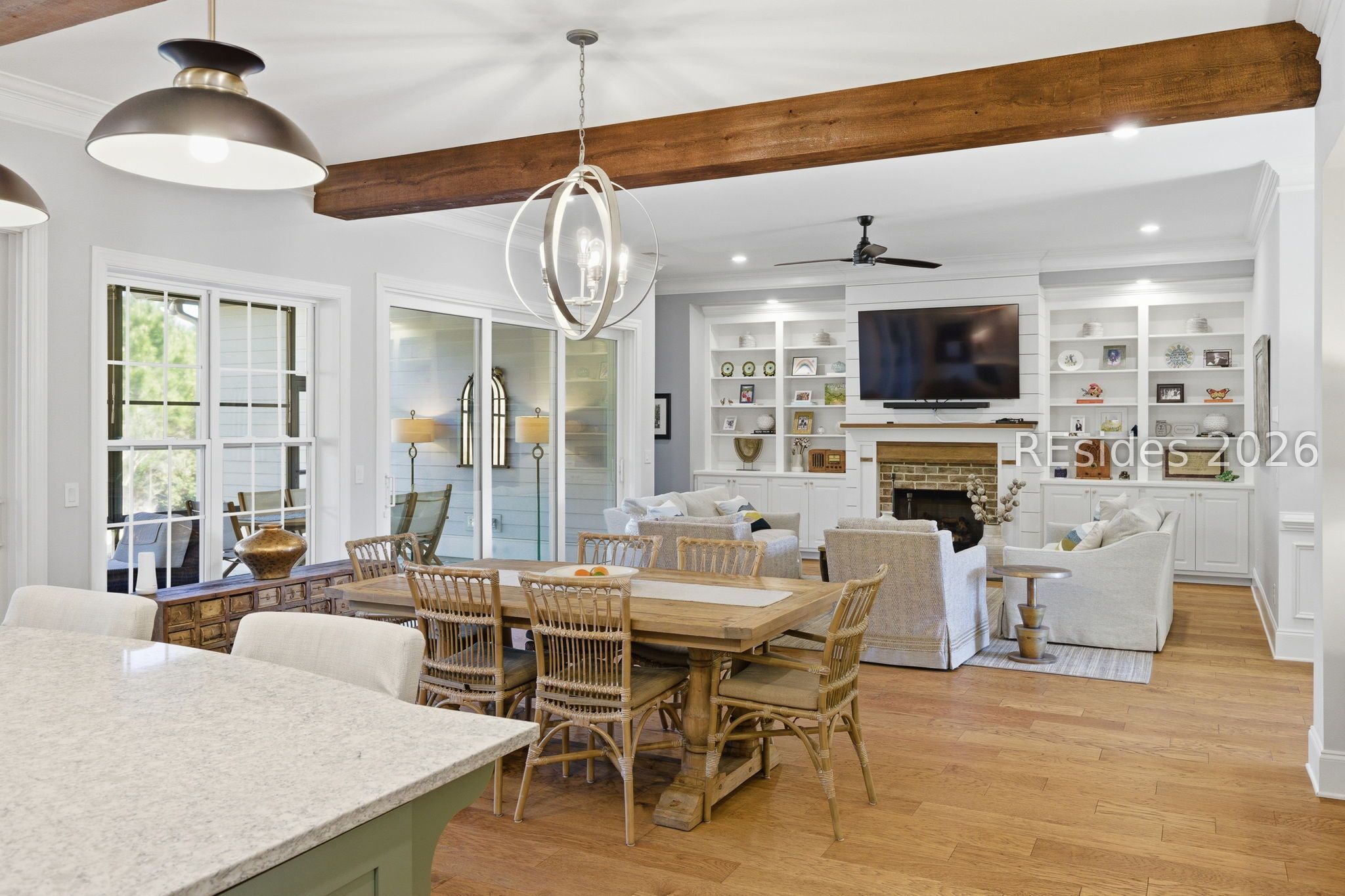 Stunning 4-bedroom residence in the award-winning Hampton Lake community-an exceptional opportunity to own a highly sought-after Logan-built Pearl model with extensive upgrades and premium finishes throughout. From the moment you enter, the open-concept design draws you in. The great room is a true focal point, featuring exposed Cypress beams, a custom wood accent wall, and a beautifully updated brick gas fireplace with shiplap detail-creating a warm, elevated space ideal for both everyday living and entertaining. The kitchen has been thoughtfully enhanced with refinished cabinetry, soft-close drawers, elegant gold hardware, and convenient roll-out shelving. A stylish dry bar with custom cabinetry adds both function and flair, making hosting effortless. The primary suite offers a private, spa-like retreat with designer tile work and a zero-entry walk-in shower. Plantation shutters throughout the home provide timeless character and privacy. The expansive 4-season lanai extends the living space year-round, complete with a Soho brick floor, fireplace, mini-split system, and updated ceiling fans-perfect for relaxing or entertaining in any season. The backyard is beautifully landscaped with vibrant flower beds and a private wooded conservation backdrop, offering both serenity and seclusion. Magnificent sunset views complete the setting. Additional highlights include custom garage cabinetry for optimal storage and organization. Homes of this caliber, condition, and level of upgrade in Hampton Lake are rarely available. Enjoy access to world-class amenities including dining, fitness, pools, and a true Lowcountry lifestyle-all within one of the area's most desirable gated communities.