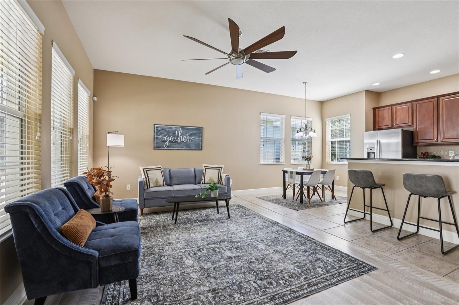 - Ceiling Fan(s), Eat-in Kitchen, High Ceilings, Kitchen/Family Room Combo, Open Floorplan, Main Level Primary, Solid Surface Counters, Split Bedrooms, Stone Counters, Thermostat, Walk-In Closet(s)