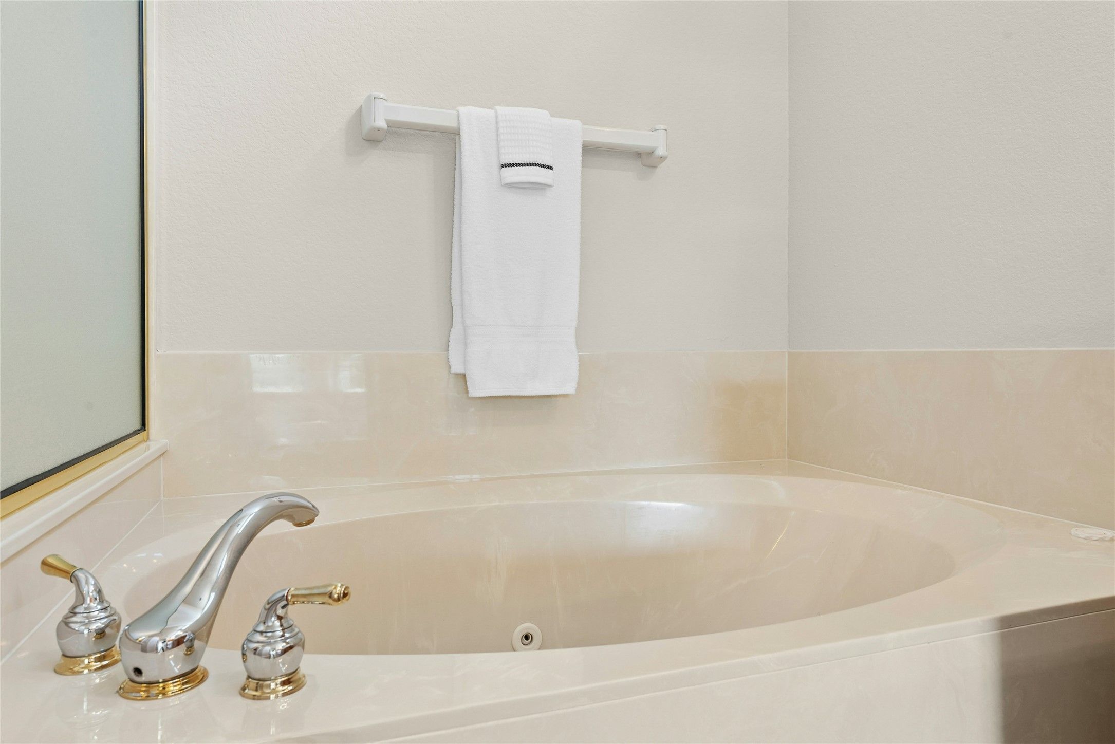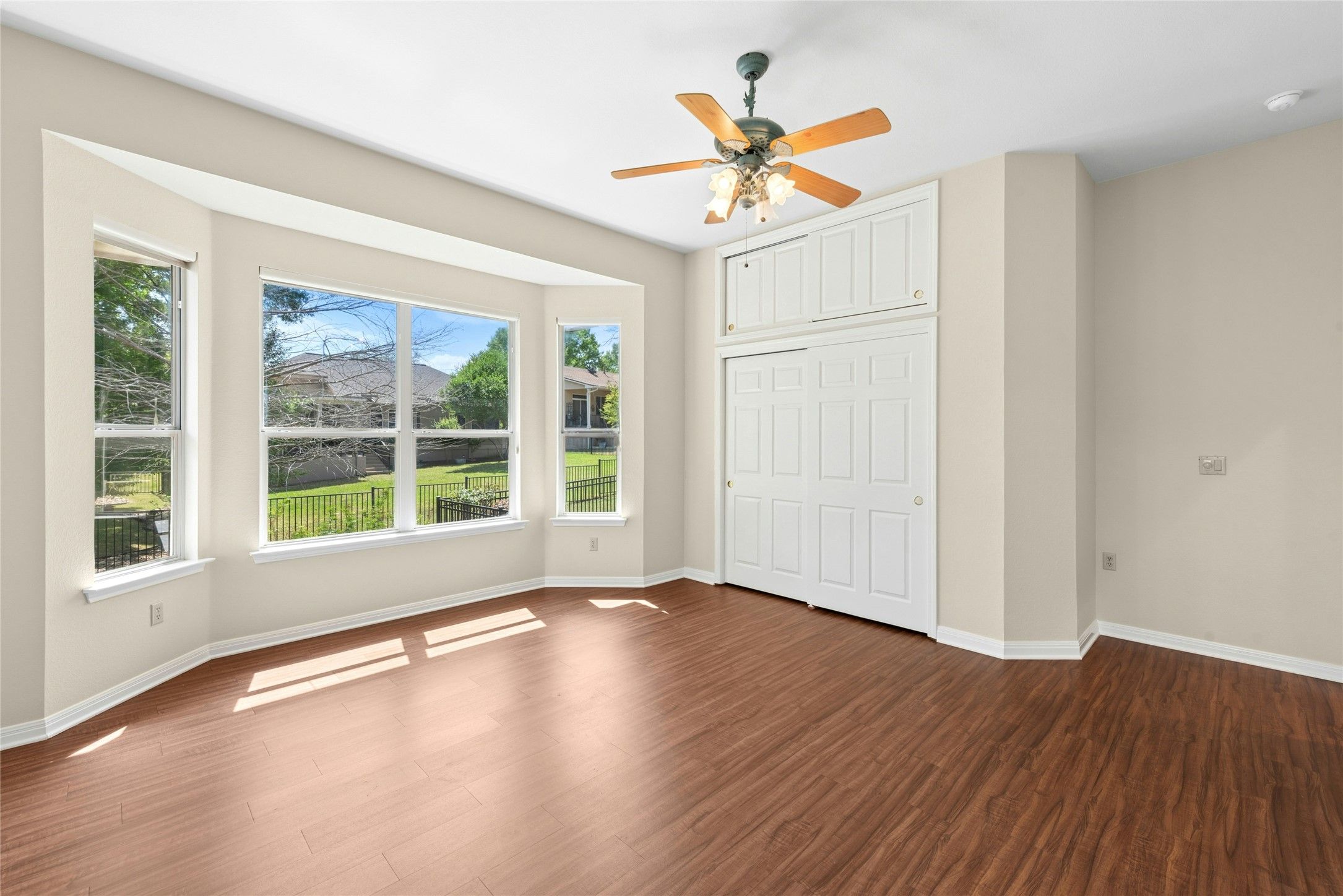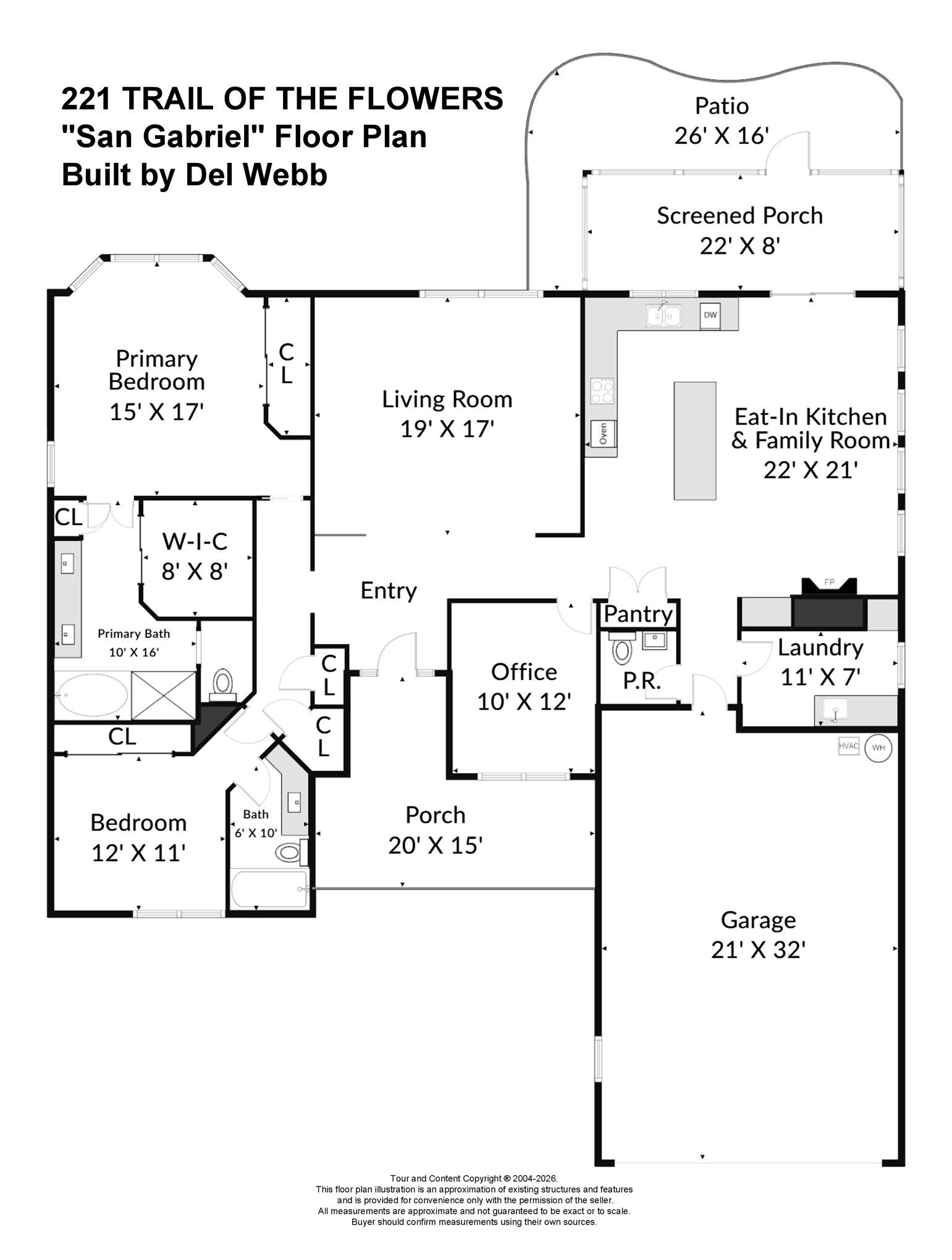 A charming Del Webb–built San Gabriel floor plan home offering 2 bedrooms and 2.5 baths, highlighted by classic brick-front curb appeal and a freshly painted interior in 2026. An 8’ wood and glass front entry door opens to formal living and dining space featuring hardwood floors, 10’ ceilings, plantation shutters, and elegant crown molding. A family room with gas log fireplace adjoins the kitchen and breakfast area, creating a comfortable space for everyday living and entertaining. The kitchen includes an electric cooktop that is pre-plumbed for gas, offering flexibility for future cooking preferences. A private office with a built-in corner desk provides a convenient workspace or hobby room. The guest bedroom features its own full private bath, while the spacious owner’s suite includes a bay window with relaxing backyard views and ensuite. The laundry room is well equipped with a useful wash basin and upper and lower cabinetry and an extended two-car garage offers built-in storage for added organization. Enjoy outdoor living on the screened back porch overlooking a south-facing, fenced backyard, complete with an extended limestone patio—perfect for relaxing or entertaining outdoors! 2021 Water Heater. 2018 Roof.