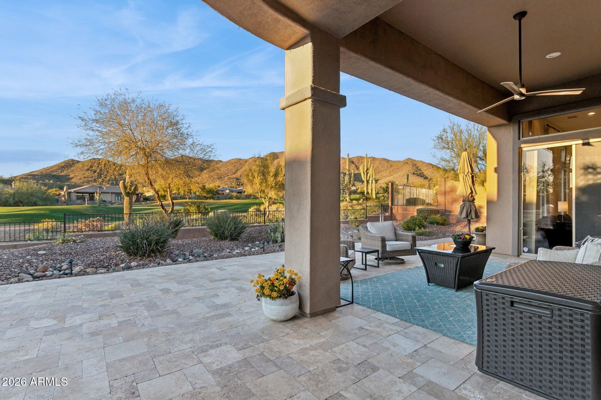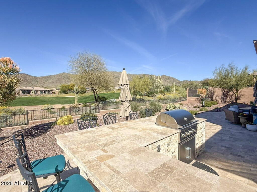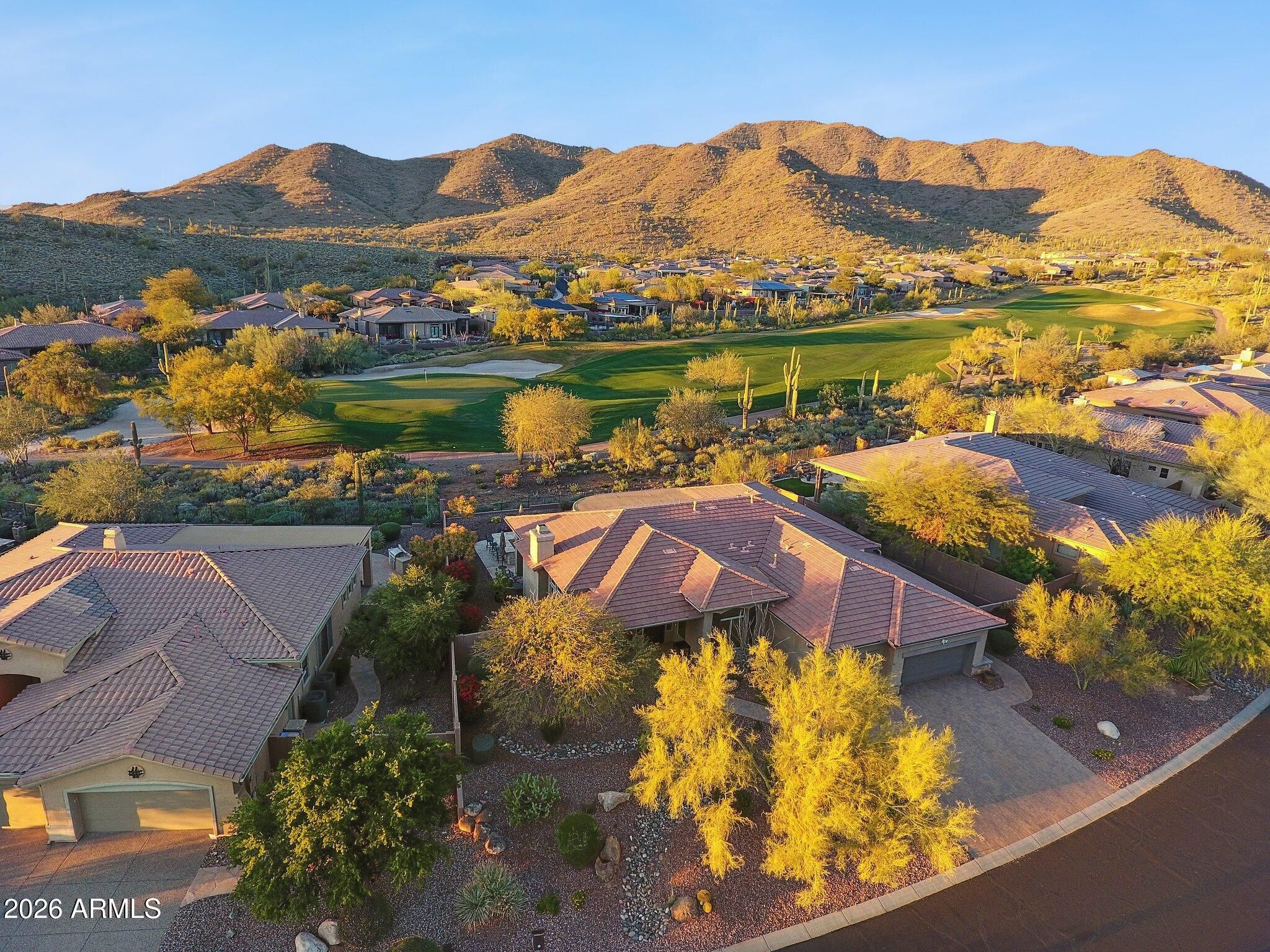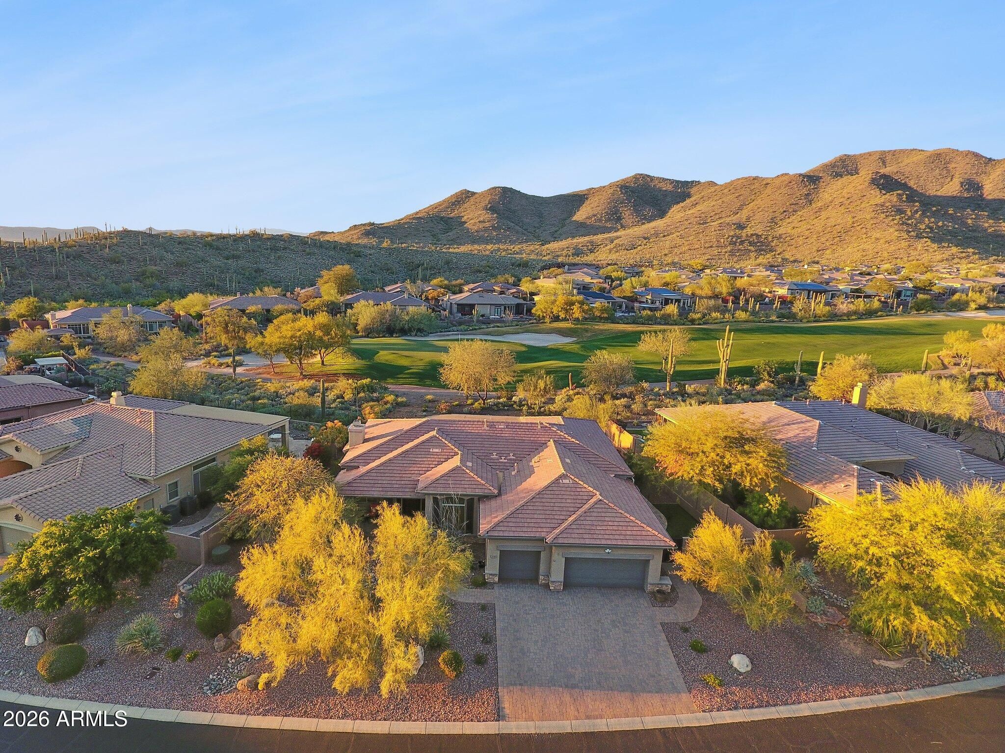 Meticulously updated 2-bedroom, Den, 2.5 bath executive home is set along the 16th fairway of the Persimmon Course at Anthem Golf & Country Club with STUNNING golf course and mountain views! Inside, wood floors lead to a large great room and updated kitchen with granite counters and stainless appliances. The primary suite opens to an extended covered patio with fairway and green views. The fully renovated primary bath features a large walk-in shower, dual sinks, and a custom walk-in closet. Second bedroom is en suite with remodeled bath. The backyard is designed for easy living with travertine pavers and an outdoor BBQ area. An oversized 3-car garage with epoxy floors, climate-control and built-in storage. This home has lots of extras!