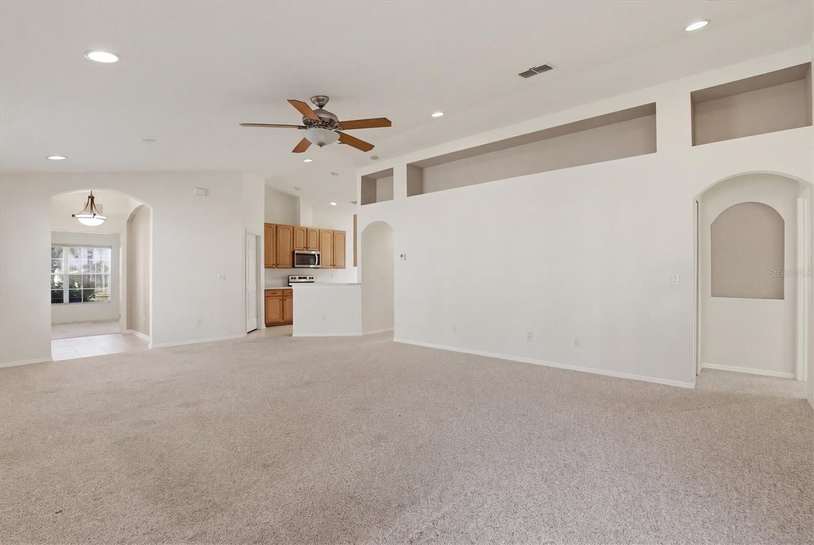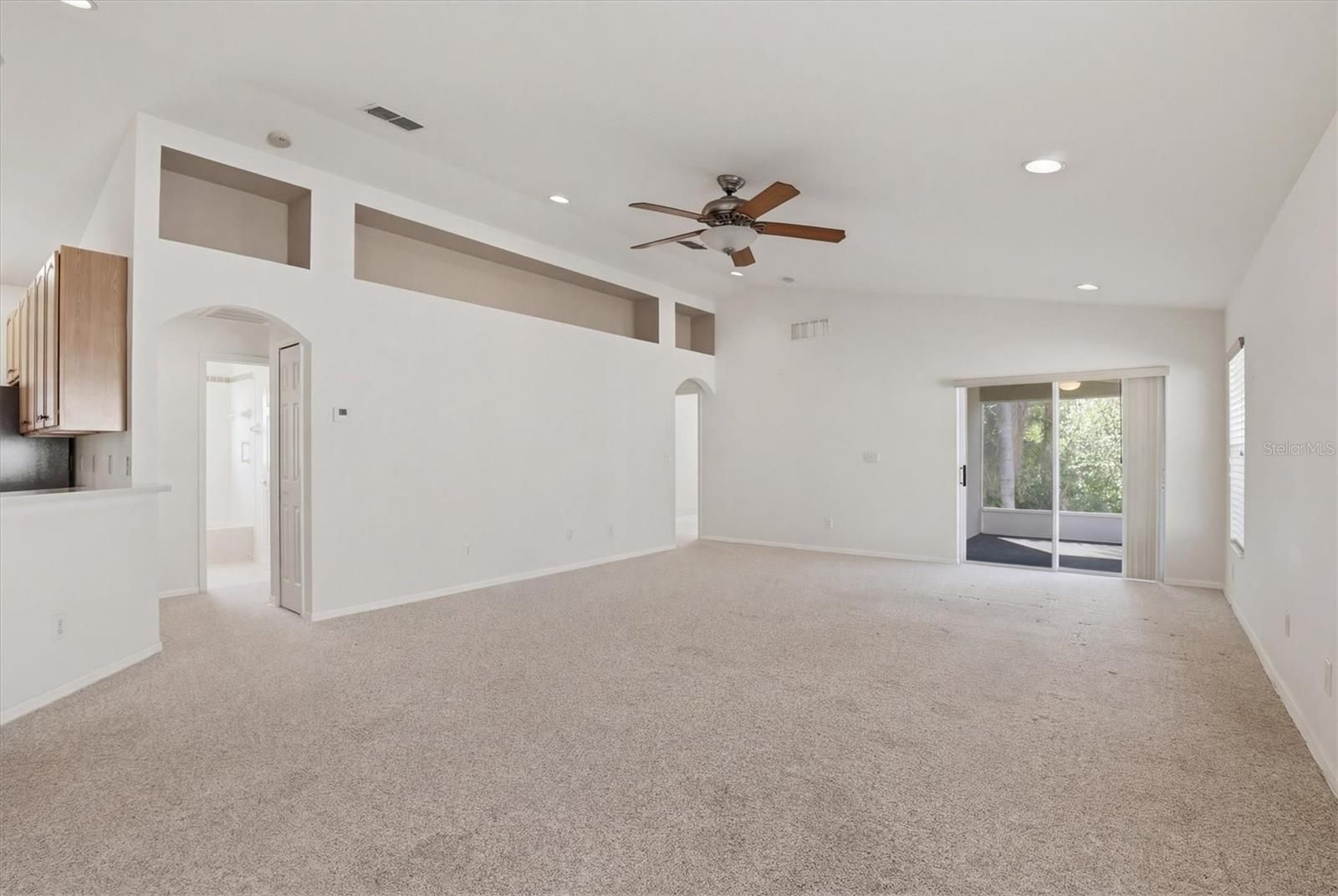 - Ceiling Fan(s), Eat-in Kitchen, High Ceilings, Kitchen/Family Room Combo, Living/Dining Room, Open Floorplan, Solid-Wood Cabinets, Thermostat, Vaulted Ceiling(s)