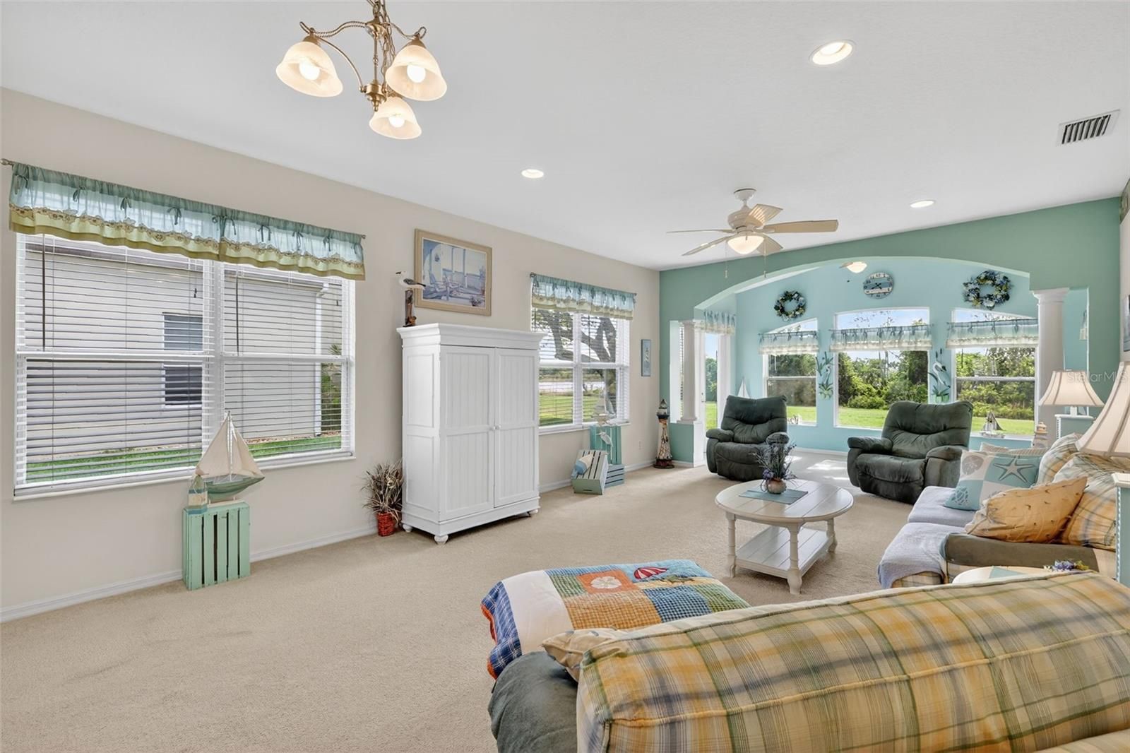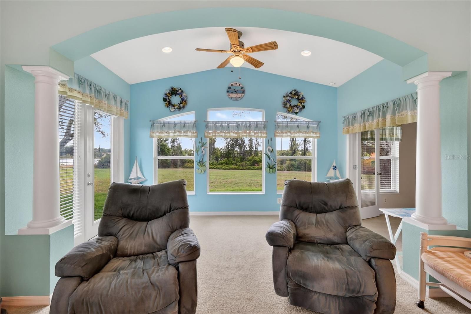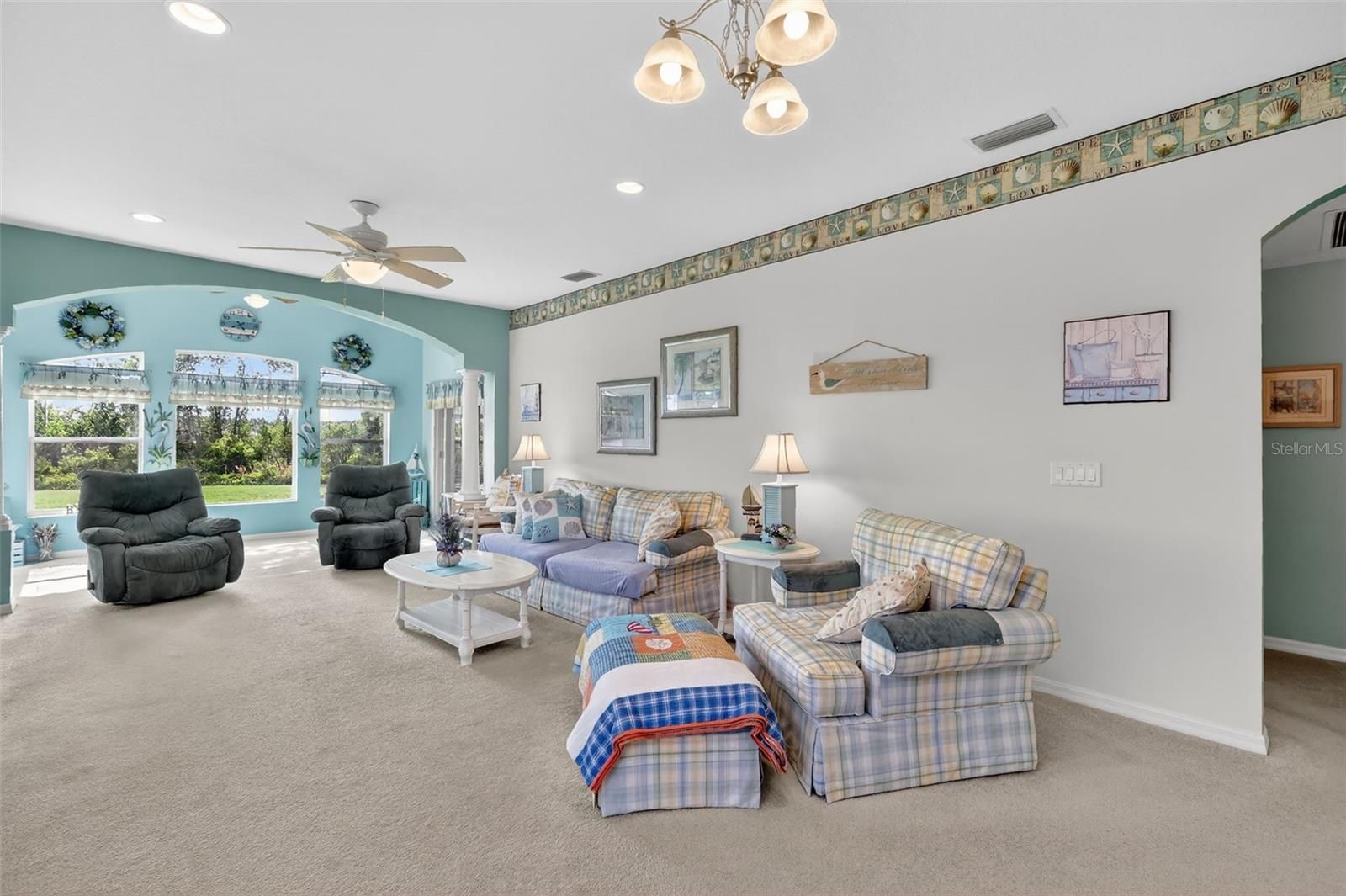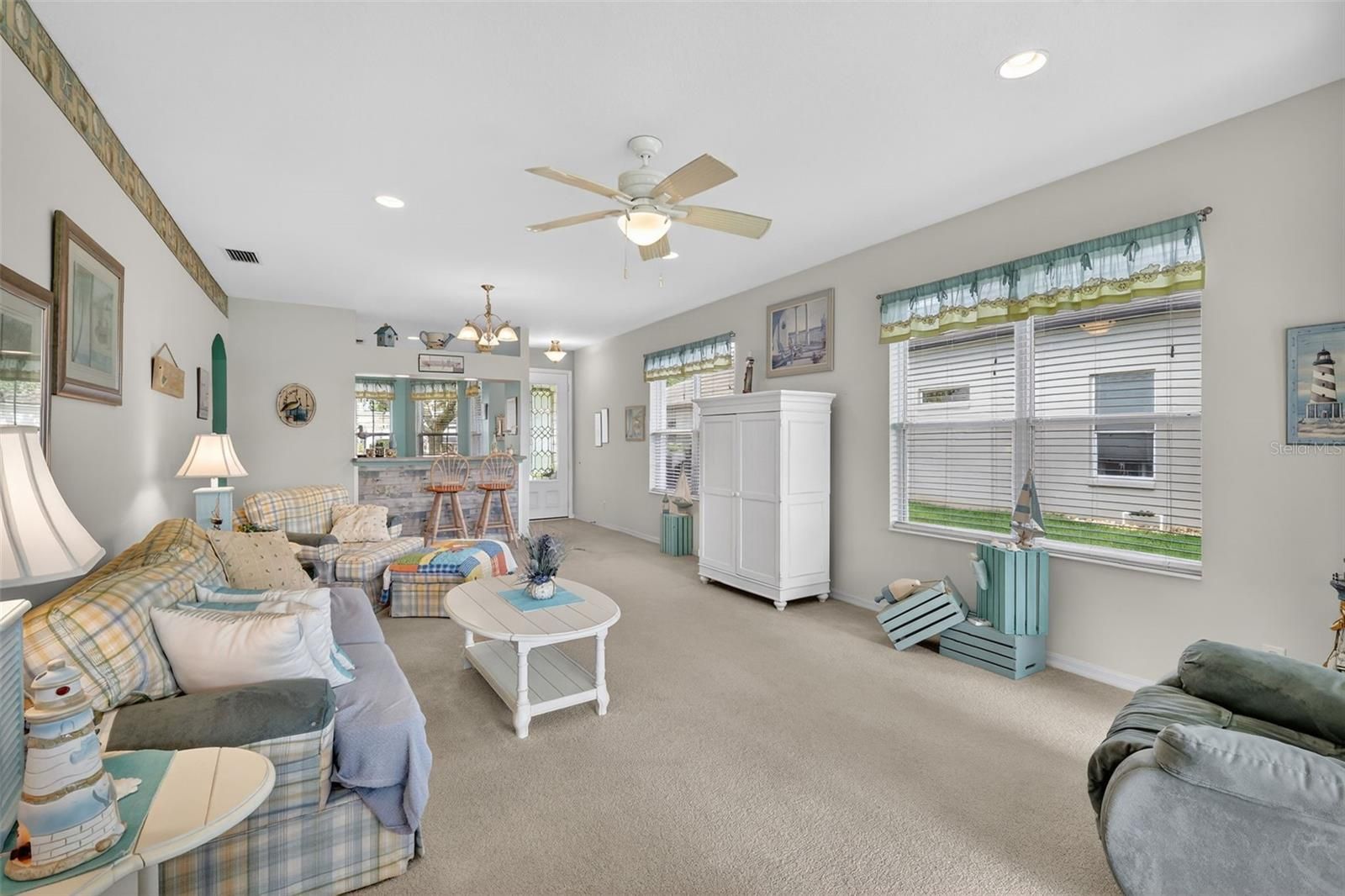 Welcome to this beautifully maintained, furnished/ turnkey Balmoral model, perfectly positioned to capture serene water and conservation views—offering both privacy and a peaceful natural backdrop that so many buyers are searching for today. From the moment you arrive, the covered front porch creates a warm and inviting entry, setting the tone for the light-filled interior that follows. Step inside to a bright and open great room where natural light pours in, seamlessly connecting the living and kitchen spaces for easy everyday living and effortless entertaining. The main living area opens to an extended living space with picture windows that overlook the view —an ideal setting to enjoy morning coffee or unwind in the evenings. The eat-in kitchen features a cozy breakfast nook and is conveniently located next to the indoor laundry room with pantry storage and direct access to the garage, creating a layout that is both functional and comfortable. The primary suite offers a relaxing retreat with a generous walk-in closet, while the en-suite bath includes a jetted tub, step-in shower and linen closet for added convenience. A flexible guest wing provides two additional bedrooms and a guest bath, perfect for visiting family or easily adapting one room into a home office or hobby space. Additional features include a 2024 water heater, 2023 roof, 2018 HVAC system, a termite bond with Florida Pest and a whole-home water filtration and softening system, offering peace of mind for years to come. Located in the highly sought-after Royal Highlands, this resident-owned, guard-gated 55+ community offers an exceptional lifestyle. Residents enjoy an 18-hole golf course with restaurant and pro shop, two pools (indoor and outdoor), lighted tennis and pickleball courts, shuffleboard and bocce ball, a softball field, billiards, a fitness center, card rooms, and a library. The Grand Hall serves as the heart of the community, hosting social events, fitness classes, concerts, and more. The HOA also includes cable, high-speed internet, and secure RV and boat storage. This is more than just a home—it’s a place where comfort, connection, and natural beauty come together in one of Lake County’s most desirable 55+ communities.