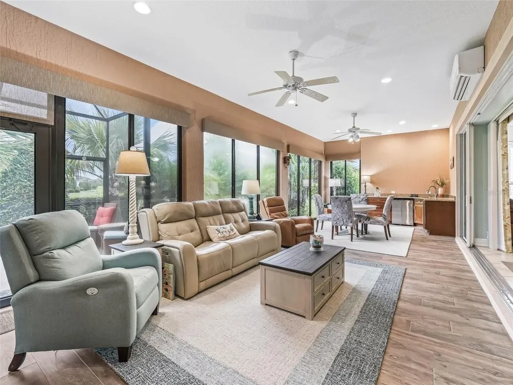 Located in the desirable Villages of Pinellas, this beautiful Premier Williamsburg home has 2683 square feet. This home puts you in the middle between Brownwood Square and Lake Sumter Landing. Step into luxury at its best from the moment you enter this indoor/outdoor entertainer's paradise with spacious rooms and crown molding throughout. The kitchen includes a breakfast nook, granite countertops, beautiful wood cabinets with numerous rollouts, and an instant hot water faucet. The primary bedroom is oversized with tray ceilings. The dining room, living room, and enclosed lanai with remote control blinds and mini bar with ice maker are an entertainer's dream. There is room for a pool outside the very large, screened patio. If you're looking for that oversized garage it is here. There is a Home Warranty, Choice Warranty that is transferrable and good until May 2030. There is no carpet in the home, and it has beautiful wood flooring and tile. Don't miss this gorgeous home! It is exactly what you've been looking for.