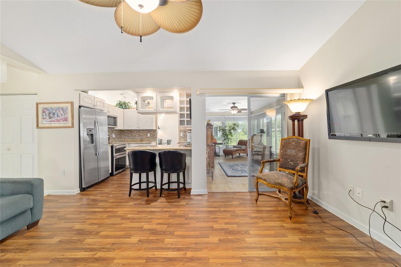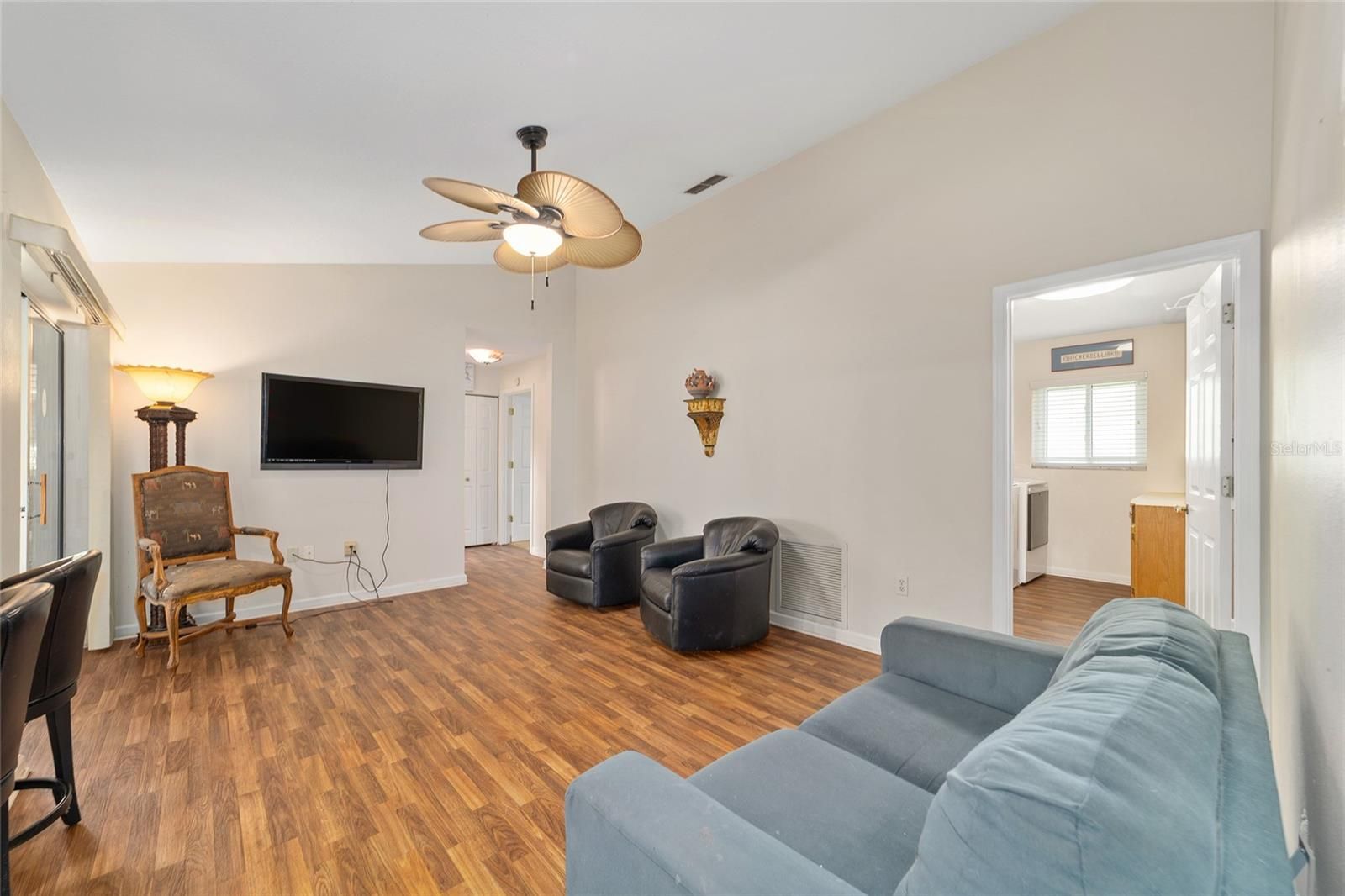 GATED 55+ COMMUNITY: This 2 bedroom/ 2 bathroom home has new kitchen appliances. There is a chain link fence enclosing the back yard. At the back of the house is the glass enclosed Lanai with split unit A/C with heat system. The rest of the house has central HVAC. New heat pump installed 2021. Two sliding glass doors enter the Lanai. The Kitchen has a pass through window opening to the Lanai. Living room/dining room combination is to the left of the entrance. The primary bedroom and bathroom are to the left of the dinning room. Straight ahead of the entrance is the kitchen and sitting room. Pass the sitting room is the second bedroom and bathroom. Inside laundry has newer washer/dryer. Ocala Palms community has 2 pools and a jacuzzi, includes common area maintenance, gated entry, pristine Golf course, Fitness center and a public restaurant.