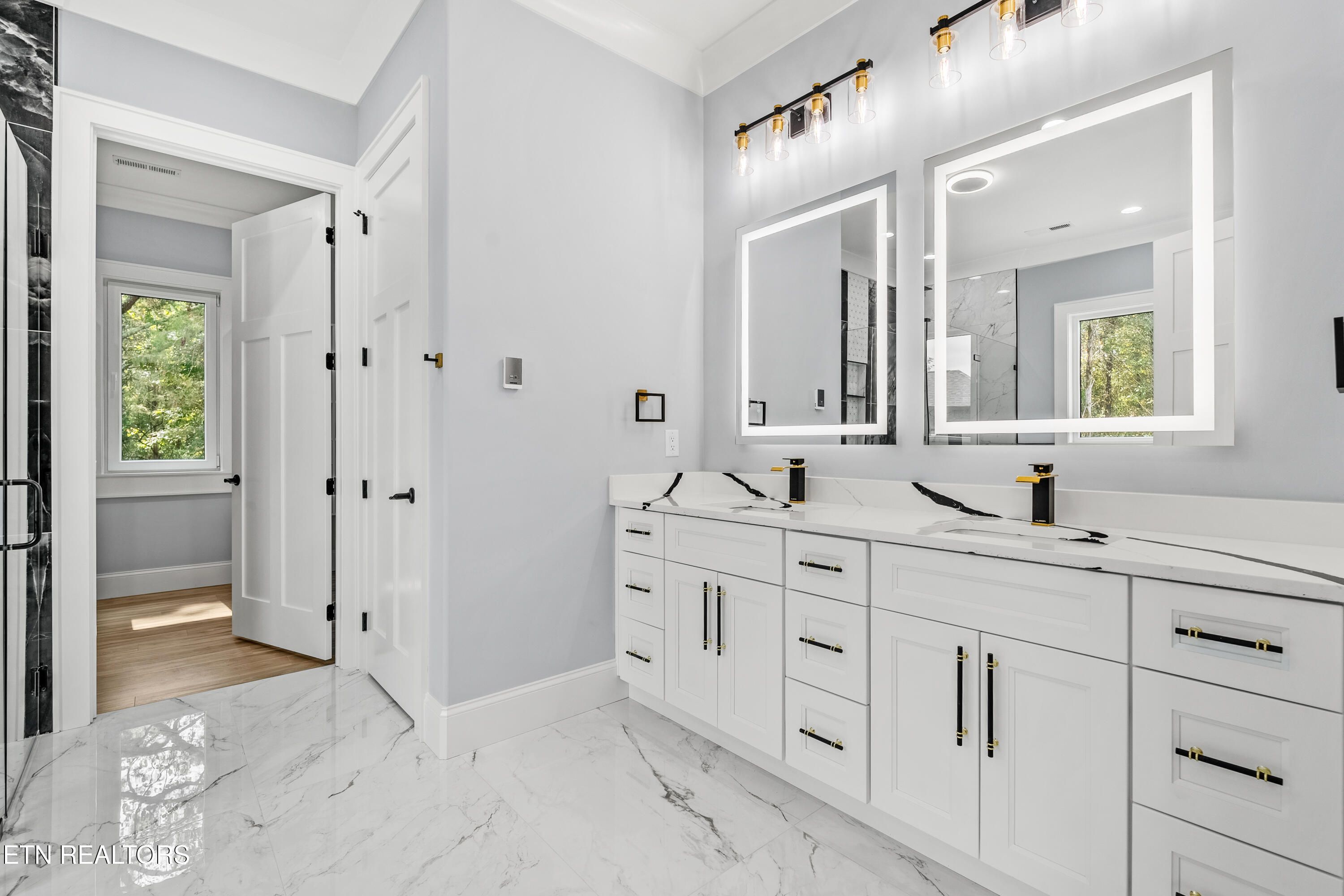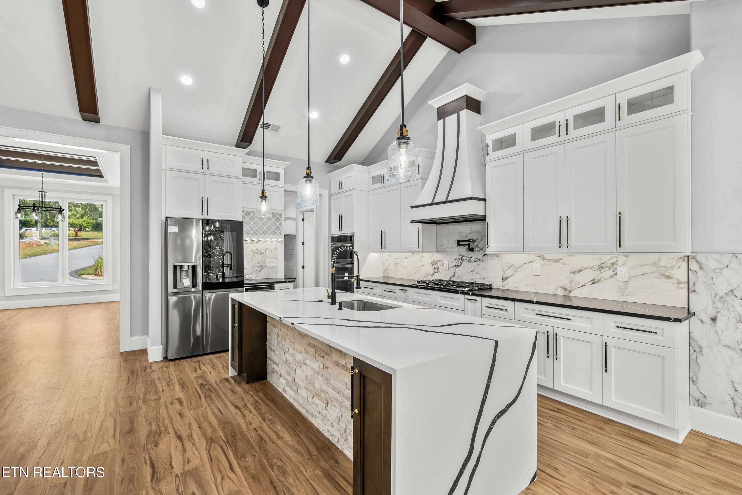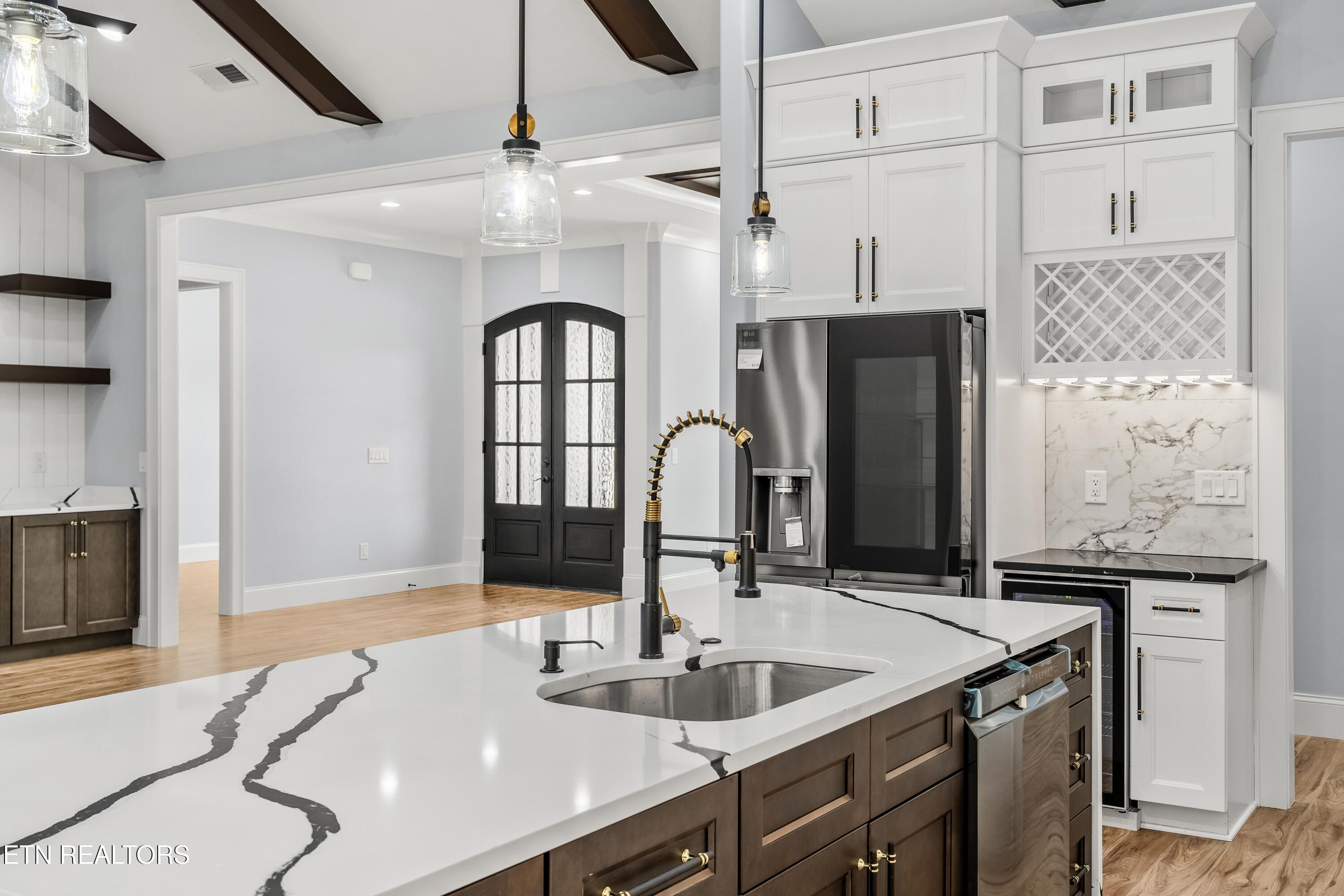 Luxury awaits in this meticulously designed home, packed with builder upgrades throughout! Featuring 3 bedrooms, 3 full baths, 1 half bath, and a true bonus room, this home is a standout. The exterior showcases a charming blend of brick, stone, and vinyl siding that enhances curb appeal, complemented by a long driveway and beautifully landscaped front yard. Builder upgrades are evident from the moment you step through the double natural wood doors. Cozy up in the living area, which boasts a large floor-to-ceiling vented stone gas fireplace with shiplap and floating shelves, vaulted ceiling with decorative beams, and premium Tilt & Turn European windows that flood the space with natural light. Luxurious kitchen features stylish finishes, abundant cabinetry, custom hood, pot filler, and SS appliances, including refrigerator, double oven, gas cooktop, wine rack, beverage cooler, and under-cabinet lighting. Oversized waterfall island provides workspace and seating. Formal dining room, with its trey ceiling, decorative wall, and beams, is perfect for hosting. Spacious master suite features trey ceiling with accent mood lighting and accent wall, along with a spa-like bathroom complete with Bluetooth speaker, LED vanity mirrors, soaking tub, heated floors (in both bath and shower), elegant tiled walk-in shower, and an enclosed water closet. The large walk-in master closet and additional rooms offer custom built-in shelving. Two large guest bedrooms share a beautifully appointed bathroom with double vanities, LED vanity mirror and beautiful tile shower. Large laundry room provides ample cabinetry. A true bonus room can serve as a 4th bedroom and includes its own full bath with walk-in shower and large vanity. A dry bar and additional beverage cooler make the space even more versatile. With all main living on the first floor, this open, comfortable floor plan offers smart storage throughout. No carpet anywhere, professionally installed waterproof laminate flooring ensures low maintenance and a clean, modern look. Step outside to the large covered screened deck, complete with a gas ventless fireplace and tongue-and-groove ceiling. Large 2-car garage with a mop sink, cabinetry, and an additional beverage refrigerator and an additional separate 3rd garage with an exterior entrance only. Encapsulated crawlspace. Professional landscaping, including irrigation system. This beautifully crafted home combines timeless design with modern comfort. Don't miss this incredible opportunity, move in and enjoy everything it has to offer! Buyer to reimburse Seller at closing the one-time Loudon County Impact tax $1.00 per finished sq.