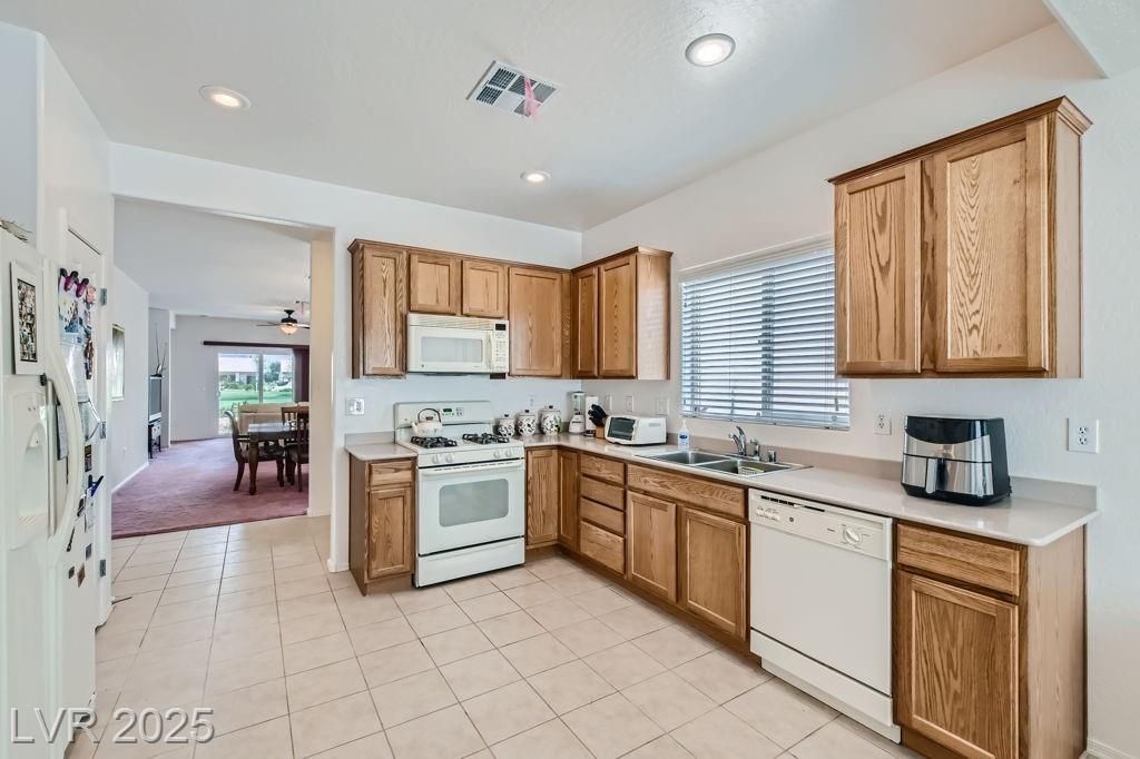Check out this lovely home in the desirable 55 plus Sun City Aliante Community with majestic mountain views and located on the 12thh hole of the golf course. Features include a large dining/ living room, kitchen with a sunny breakfast nook, Corian counters, tile floors and pull out cabinet shelves. The primary bedroom is separate from the other 2 bedrooms and offers a walk in closet, primary bath with double sinks and step in shower. Original owners second home. New HVAC installed three years ago. Amenities include community activities, public transportaion, Aliante Casino, shopping, dining and more.