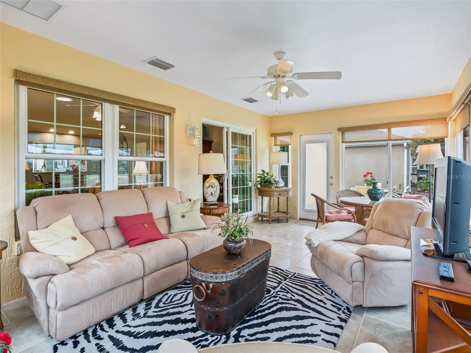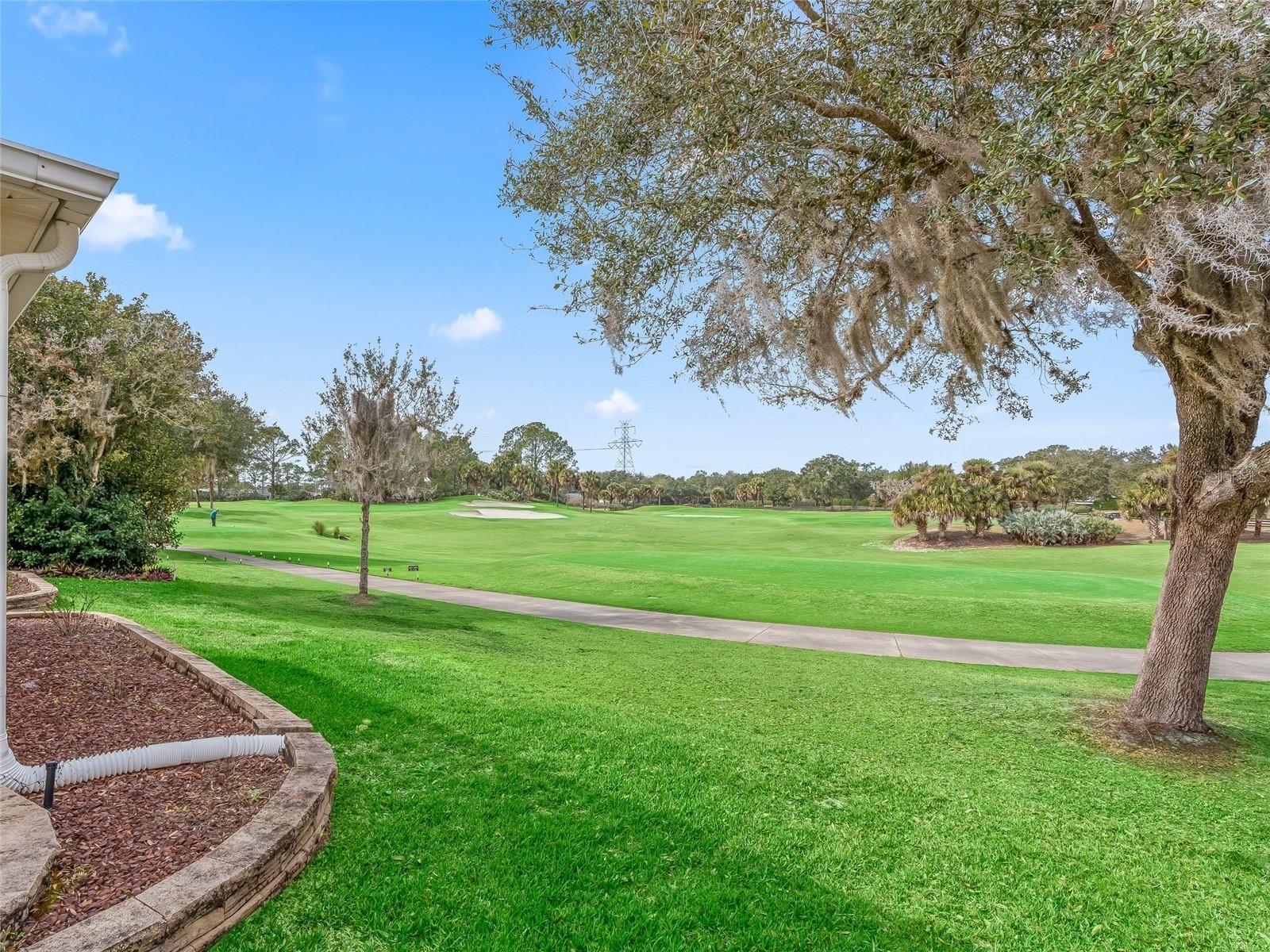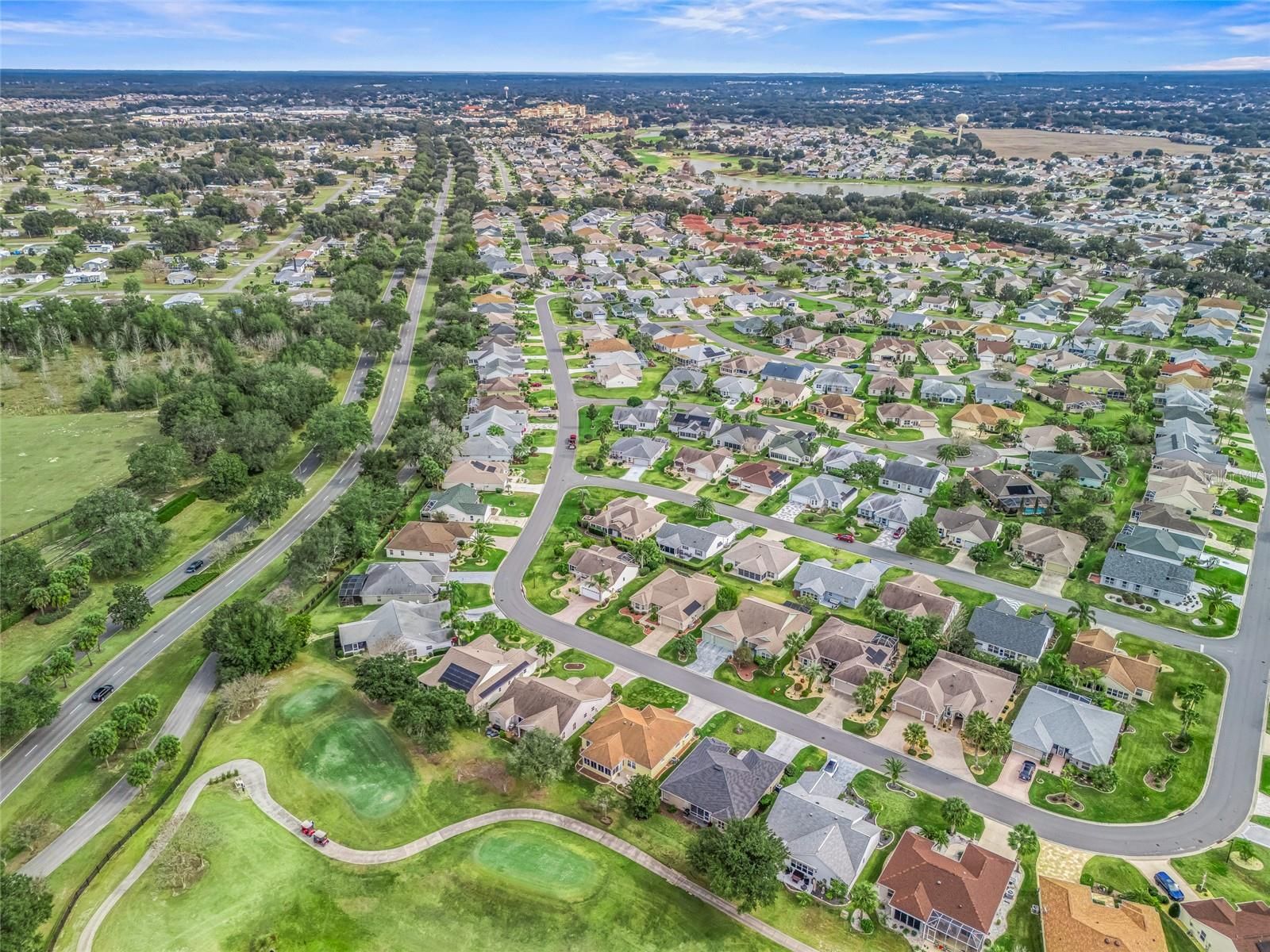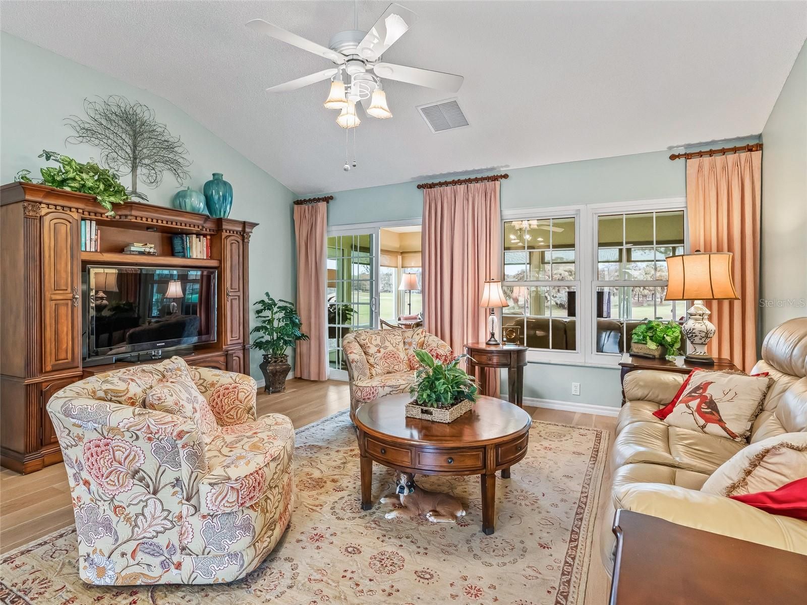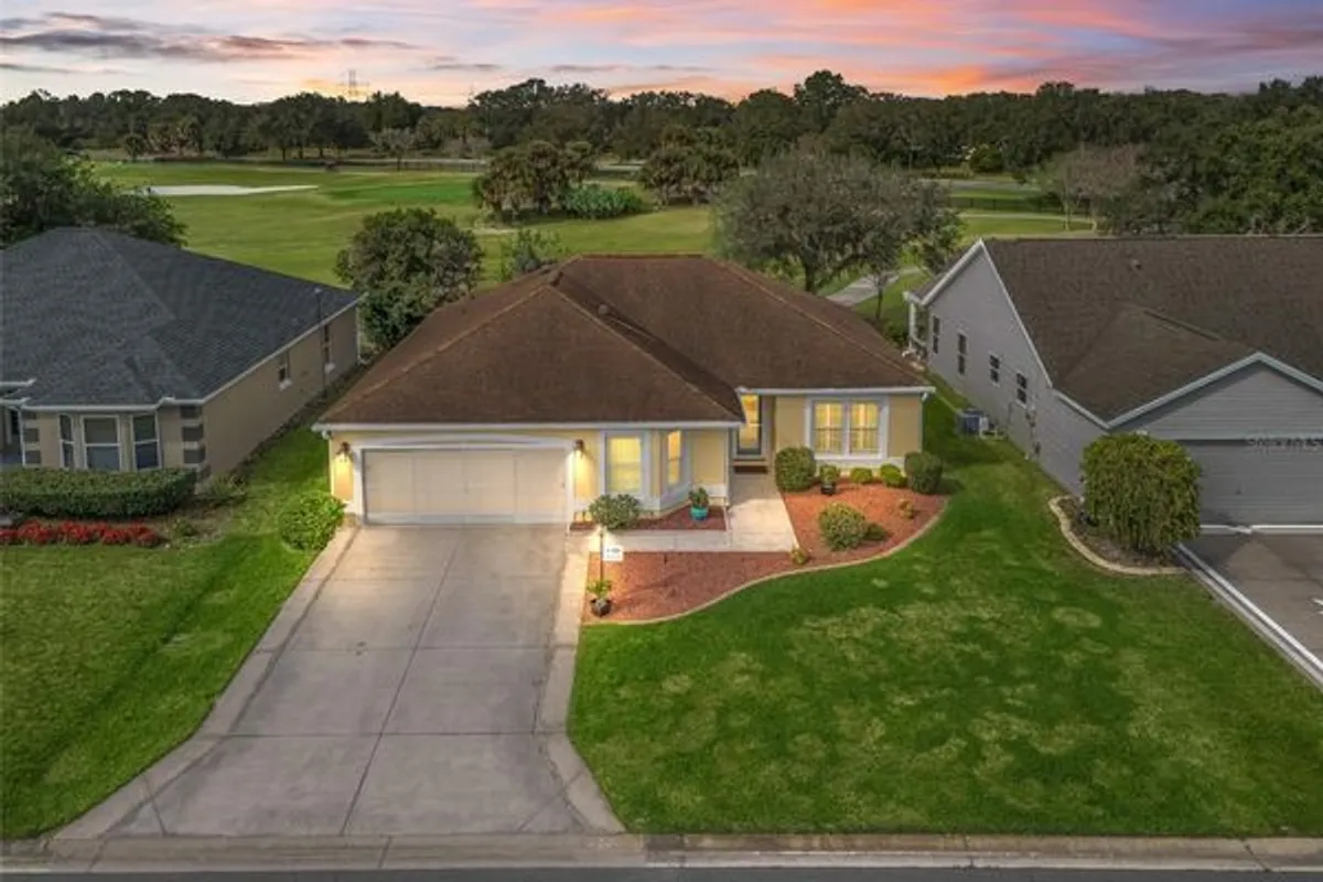 Appealing Golf-Front Jasmine Designer Home ideally located in the highly sought-after Village of Santo Domingo, within the area known as 'The Entertainment Center' of The Villages. This well-maintained home offers scenic golf course views, mature trees and professionally landscaped surroundings. A smart glass entry door opens to a welcoming foyer, leading into the comfortable living and dining area that flow seamlessly together, showcasing tranquil greenbelt views. Vaulted ceilings, solar lighting, ceiling fans and engineered hardwood flooring create a bright, inviting atmosphere. Sliding glass doors open to a spacious lanai overlooking the golf course. The home features engineered hardwood, laminate and ceramic tile throughout - no carpet anywhere. The thoughtfully designed kitchen offers generous cabinetry, a small pantry with pull-out shelving, ceramic tile flooring, double sink, breakfast bar and a cozy dinette with plantation shutters - all with lovely golf course views. The privately positioned primary suite features vaulted ceilings, engineered hardwood flooring, ceiling fan, plantation shutters, walk-in closet and peaceful golf course views. The en-suite bath includes ceramic tile flooring, single vanity, step-in glass shower, linen closet, cosmetic seating area, vaulted ceilings and a bright solar tube. Two spacious guest bedrooms are accessed through a private hallway with a linen closet plus a pocket door for added privacy. The front guest bedroom offers laminate flooring, plantation shutters, ceiling fan and closet. The back guest bedroom is generously sized, overlooks the golf course and includes laminate flooring, ceiling fan and closet. The guest bathroom features ceramic tile flooring and a shower/tub combination. Enjoy the enclosed Florida Room with ceramic tile flooring, ceiling fan, solar shades and serene views - perfect for year-round relaxation. Step outside to the generous patio area, ideal for entertaining, BBQs, or simply enjoying Florida living, surrounded by mature trees and landscaped beds. Additional highlights include a separate laundry room with sink, storage and attractive tile floor. The organized garage features epoxy flooring, built-in cabinetry, workbench, attic access, water filtration system and garage screens. A unique climate-controlled storage room within the garage offers built-in A/C and heat, window, vinyl flooring and excellent lighting - ideal for storing valuables or could be used as a private office or studi/hobby space. The extended driveway comfortably accommodates up to four vehicles, while the garage currently allows for one car and one golf cart. Roof: 2018 | HVAC: 2010 | NO BOND The Village of Santo Domingo is ideally located just minutes from Spanish Springs Town Square, Golf courses, Community Pools, Santiago and Hacienda Recreation Centers, medical facilities, restaurants, shopping, theatres and entertainment - this home is highly desirable and a convenient choice for a discerning buyer.