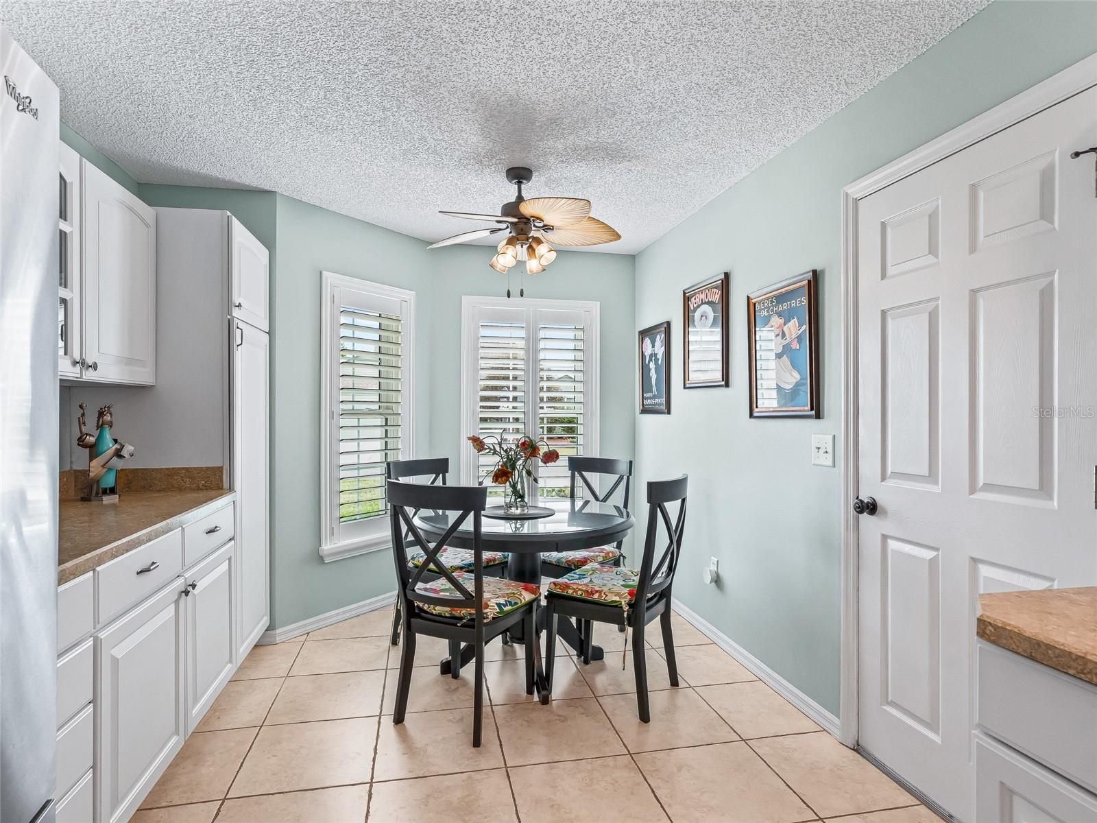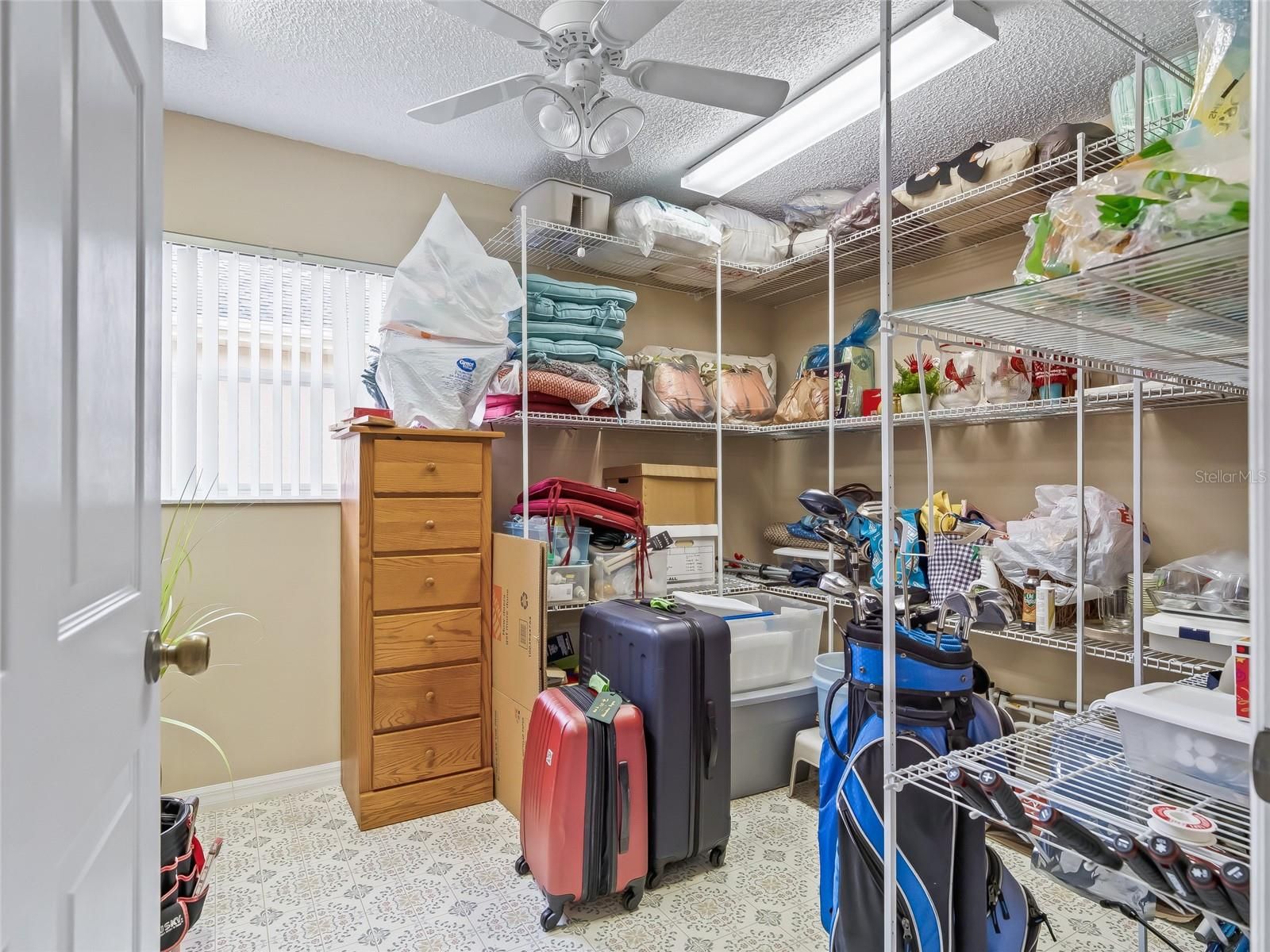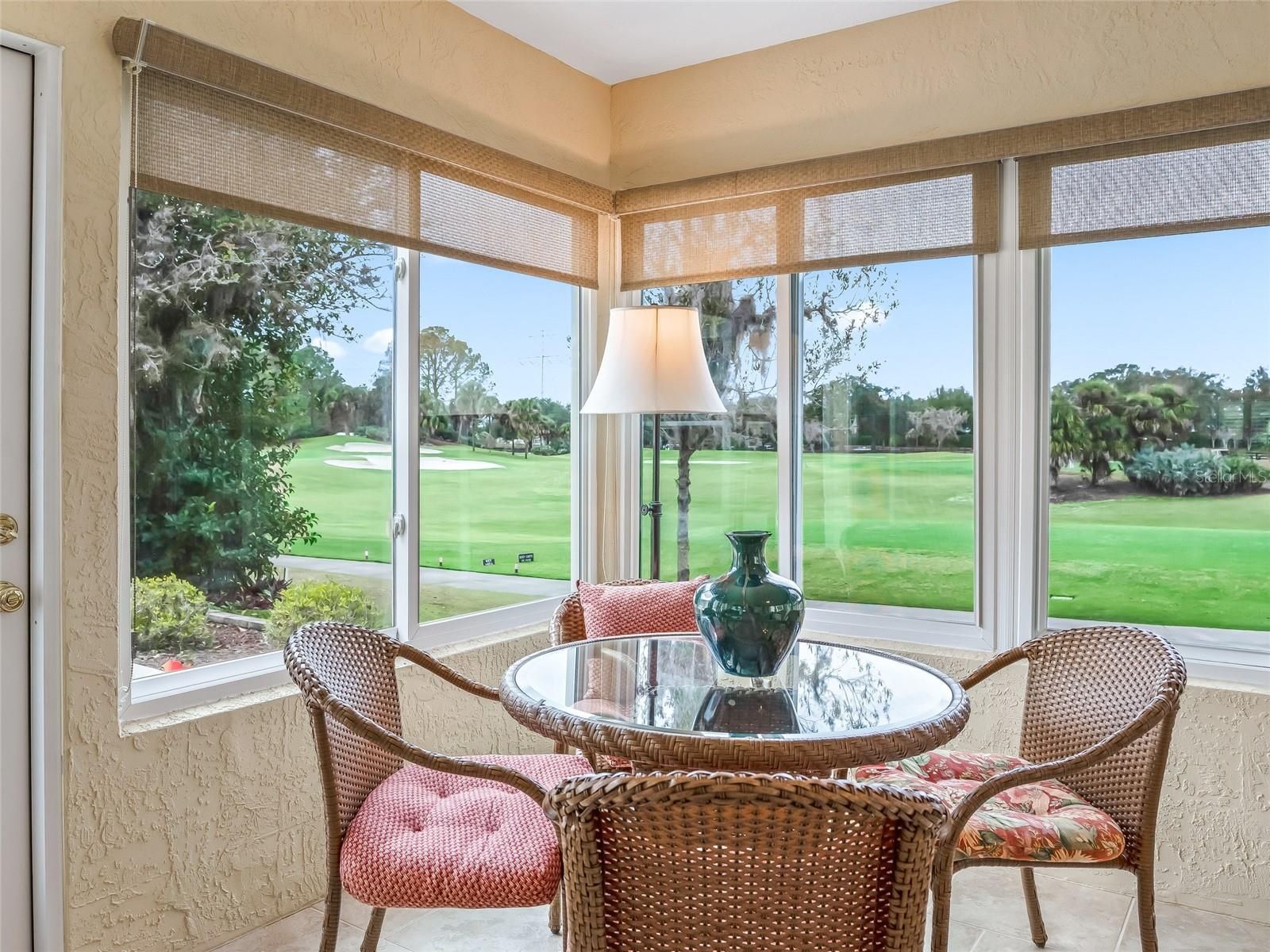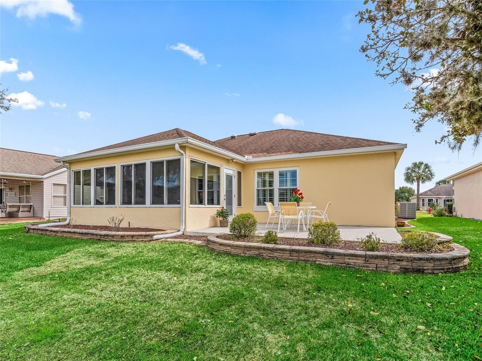Appealing Golf-Front Jasmine Designer Home ideally located in the highly sought-after Village of Santo Domingo, within the area known as 'The Entertainment Center' of The Villages. This well-maintained home offers scenic golf course views, mature trees and professionally landscaped surroundings. A smart glass entry door opens to a welcoming foyer, leading into the comfortable living and dining area that flow seamlessly together, showcasing tranquil greenbelt views. Vaulted ceilings, solar lighting, ceiling fans and engineered hardwood flooring create a bright, inviting atmosphere. Sliding glass doors open to a spacious lanai overlooking the golf course. The home features engineered hardwood, laminate and ceramic tile throughout - no carpet anywhere. The thoughtfully designed kitchen offers generous cabinetry, a small pantry with pull-out shelving, ceramic tile flooring, double sink, breakfast bar and a cozy dinette with plantation shutters - all with lovely golf course views. The privately positioned primary suite features vaulted ceilings, engineered hardwood flooring, ceiling fan, plantation shutters, walk-in closet and peaceful golf course views. The en-suite bath includes ceramic tile flooring, single vanity, step-in glass shower, linen closet, cosmetic seating area, vaulted ceilings and a bright solar tube. Two spacious guest bedrooms are accessed through a private hallway with a linen closet plus a pocket door for added privacy. The front guest bedroom offers laminate flooring, plantation shutters, ceiling fan and closet. The back guest bedroom is generously sized, overlooks the golf course and includes laminate flooring, ceiling fan and closet. The guest bathroom features ceramic tile flooring and a shower/tub combination. Enjoy the enclosed Florida Room with ceramic tile flooring, ceiling fan, solar shades and serene views - perfect for year-round relaxation. Step outside to the generous patio area, ideal for entertaining, BBQs, or simply enjoying Florida living, surrounded by mature trees and landscaped beds. Additional highlights include a separate laundry room with sink, storage and attractive tile floor. The organized garage features epoxy flooring, built-in cabinetry, workbench, attic access, water filtration system and garage screens. A unique climate-controlled storage room within the garage offers built-in A/C and heat, window, vinyl flooring and excellent lighting - ideal for storing valuables or could be used as a private office or studi/hobby space. The extended driveway comfortably accommodates up to four vehicles, while the garage currently allows for one car and one golf cart. Roof: 2018 | HVAC: 2010 | NO BOND The Village of Santo Domingo is ideally located just minutes from Spanish Springs Town Square, Golf courses, Community Pools, Santiago and Hacienda Recreation Centers, medical facilities, restaurants, shopping, theatres and entertainment - this home is highly desirable and a convenient choice for a discerning buyer.