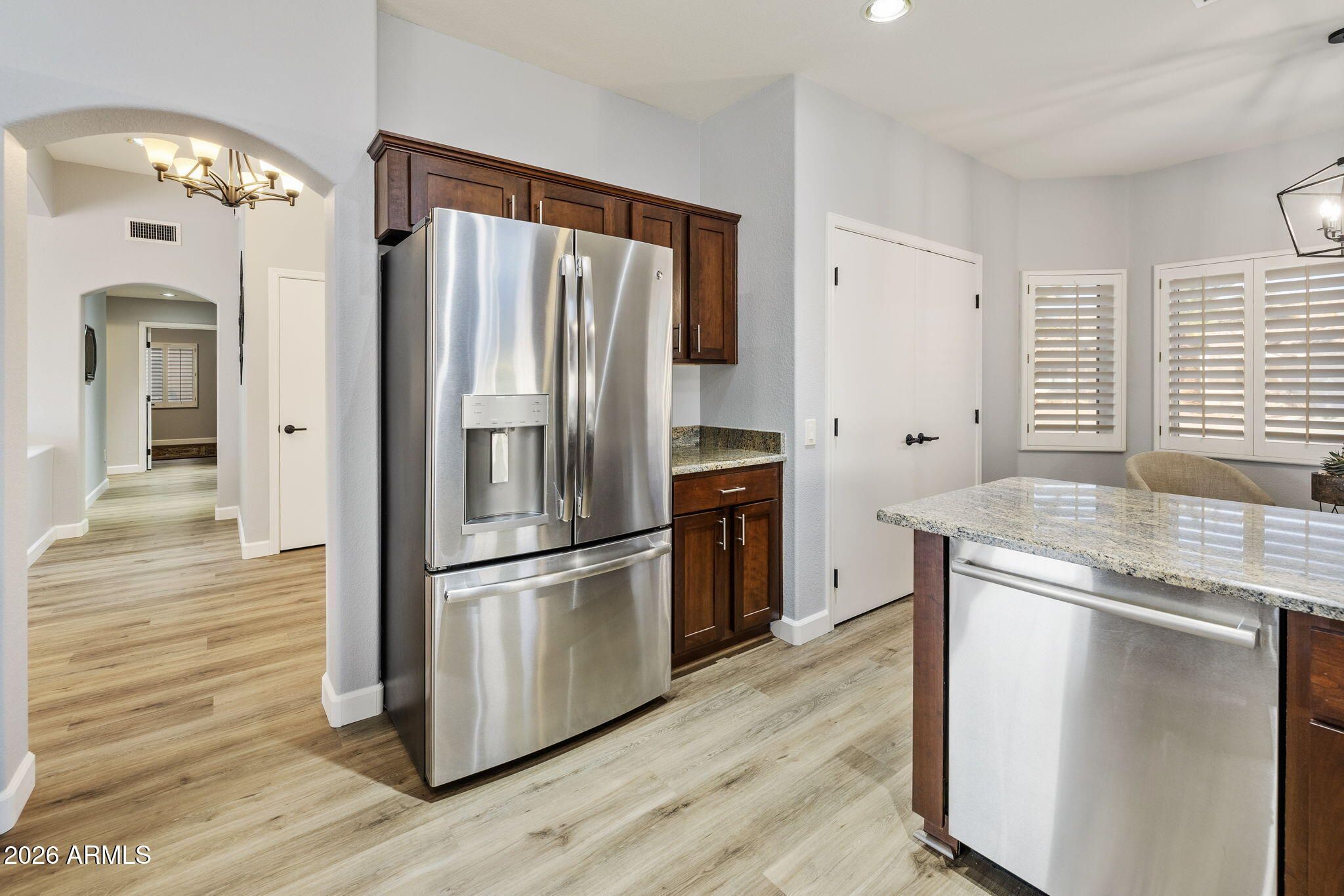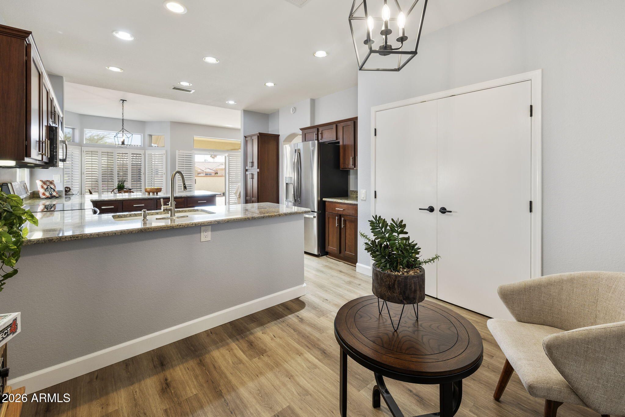 Tucked into a quiet pocket neighborhood off Williams, near Deer Valley Golf Course in Sun City West, this light-filled Chandler H2604 has been beautifully updated and is truly move-in ready—perfect for enjoying the active, resort-style lifestyle this community is known for. Welcoming double doors open to high ceilings and a fresh, calming interior palette that instantly feels like home. Recent updates include a NEW roof, NEW HVAC, updated kitchen, updated primary bathroom, hallway bathroom has Updated cabinetry/counters, and luxury vinyl plank flooring throughout interior. Plantation shutters, updated ceiling fans, and modern lighting complete the clean, comfortable feel. The bright living room features soaring ceilings and a sliding door leading to the backyard. The remodeled kitchen The remodeled kitchen offers recessed lighting, new cabinetry and counters, stainless steel appliances, and an electric range. Multiple eating and flex spaces include bar seating, a cozy kitchen nook perfect for reading or games, and a formal dining area. An oversized double-door pantry provides excellent storage. The spacious primary suite is comfortable and inviting, with a fully updated bath featuring a walk-in shower with glass enclosure, dual sinks, quartz counters, generous cabinetry, a large walk-in closet, and extra linen storage. An inside laundry room includes a utility sink, storage cabinets, and washer/dryer. The second bedroom offers flexibility as a guest room, den, or home officeideal for hobbies or visiting family. Outside, enjoy easy-care desert landscaping with a charming front patio and a private backyard complete with pony wall, covered patio, pavers, and gated access to an extended yard areaperfect for relaxing at sunset or entertaining friends. The garage is well-equipped with epoxy flooring, storage cabinets, newer door opener, NEW water softener, and an additional hobby or storage room with workbench. Sun City West offers an unmatched active-adult lifestyle with multiple recreation centers, championship golf courses, fitness centers, swimming pools, pickleball and tennis courts, walking paths, and hundreds of social clubs and activities. This home is ideally located to enjoy everything from golf and fitness classes to arts, crafts, and community events, all in a welcoming 55+ environment designed for easy, carefree living.