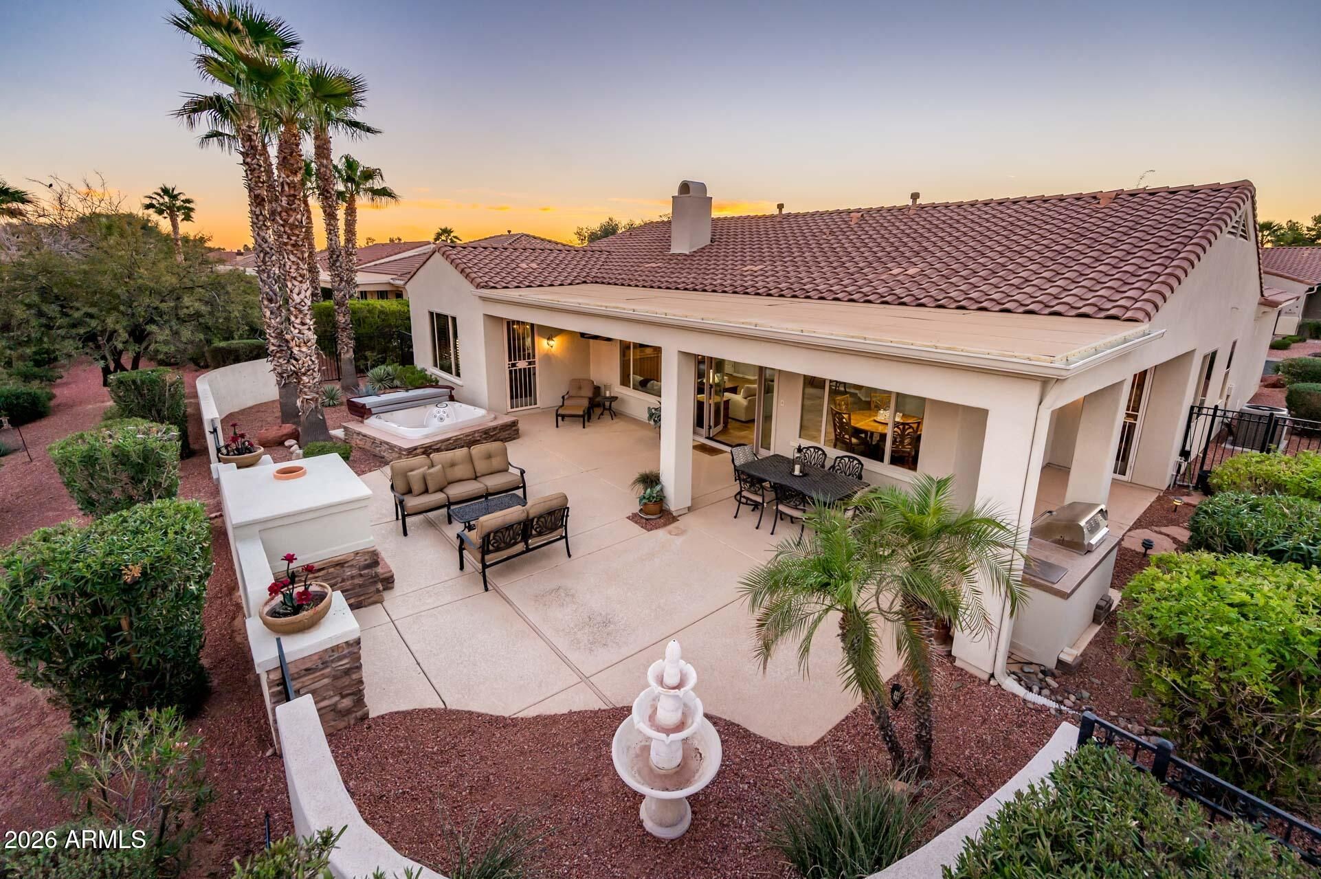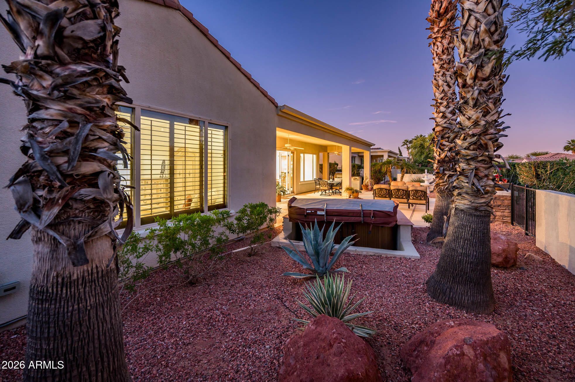 Discover an extraordinary Mirada Model residence, gracefully positioned behind the gates of Corte Bella and introduced by a private front courtyard and charming casita. Passing through the garden gate, the home reveals itself with a sense of arrival reserved for truly distinguished properties. The signature Grand Foyer sets the tone, unfolding into an expansive Great Room, elegant Dining Room, and an impressive Wet Bar appointed with rain glass cabinetry—an entertainer's dream. Thoughtful custom enhancements elevate the home throughout, including French doors that open to a resort‑inspired outdoor retreat. Here, an inviting fireplace, built‑in hot tub, BBQ island, and extended patio spaces create a luxurious setting for gatherings both intimate and grand. Inside, the kitchen nook has been refined with additional cabinetry and countertop space, blending beauty with everyday convenience. The Primary Suite, among one of the largest offered in Corte Bella, provides a serene sanctuary with private patio access. Its spa like bath features dual sinks, a private toilet room, soaking tub, walk-in shower, and an expansive custom designed closet with upgraded shelving and drawers. A separate wing hosts a stylish Powder Room and a generous Guest Suite complete with its own full bath and walk-in closet, ensuring comfort and privacy. The Casita is a standout luxury amenity perfectly appointed for guests with its own coffee bar, sink, refrigerator, full bathroom, and abundant closet space, creating an upscale, self contained retreat. Additional value comes with paid solar, enhancing efficiency without compromising elegance. A standout property that promises to impress at every turn.