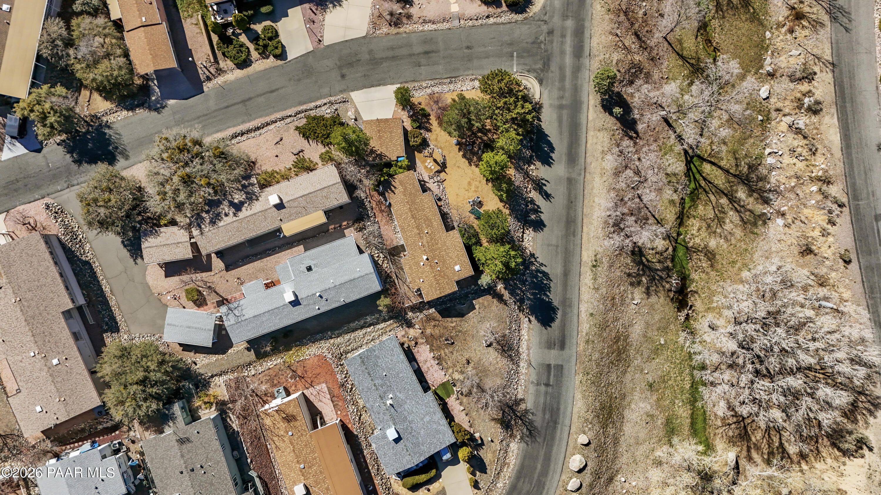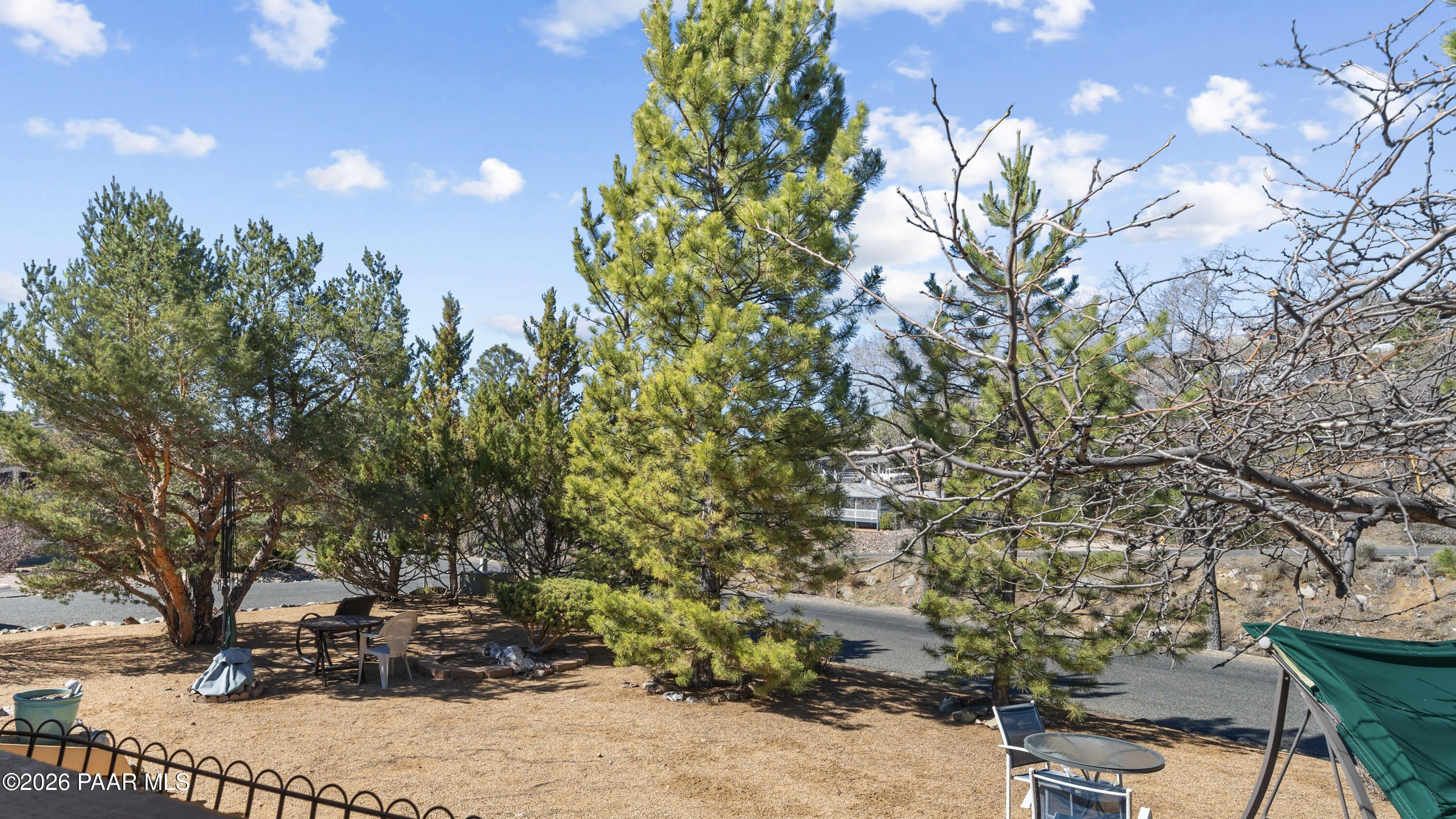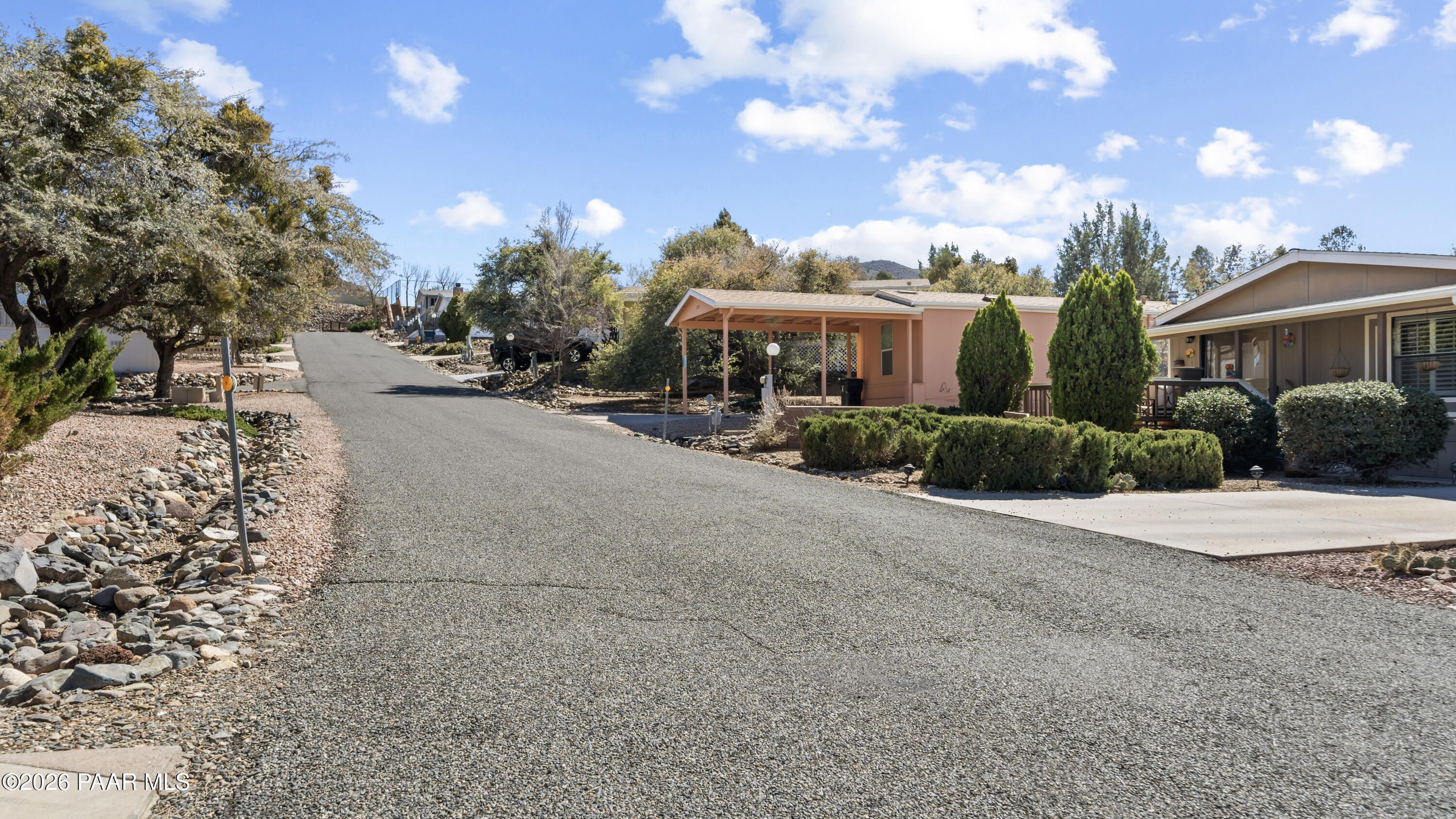 3 Bedroom Prescott Canyon Estates Home Backing to HOA Land with Detached Garage, Privacy, and Seasonal Creek Views. This 828 sq ft home is ideally positioned next to HOA open space, giving the property a rare feeling of extra privacy and elbow room while still being part of a welcoming 55+ community. Just across the street, a seasonal creek brings beautiful spring blooms, cool summer shade from mature trees, and vibrant fall color that adds to the peaceful setting.The home is move-in ready while also offering a great opportunity for buyers who want to update or personalize to their own style. Inside you'll find a bright living room with vaulted ceilings, large windows, and a cozy electric fireplace that creates a warm and comfortable gathering space. The kitchen offers ample cabinetry and an adjacent dining area perfect for everyday meals.The third bedroom located just off the deck offers flexible use and would make an excellent reading room, art studio, hobby space, or quiet retreat for visiting family and guests.Outside, enjoy a landscaped yard with mature pines, rock features, and multiple outdoor sitting areas perfect for relaxing and enjoying Prescott's mild four-season climate. A detached garage and extended driveway provide space for parking, storage, or workshop use.Located in Prescott Canyon Estates, residents enjoy HOA amenities including a clubhouse, indoor heated pool and spa, fitness center, and community activities. The home is conveniently located near shopping, restaurants, medical offices, hospitals, downtown Prescott, and the area's beautiful lakes and outdoor recreation.This property offers privacy, natural surroundings, and convenient access to everything Prescott has to offer.