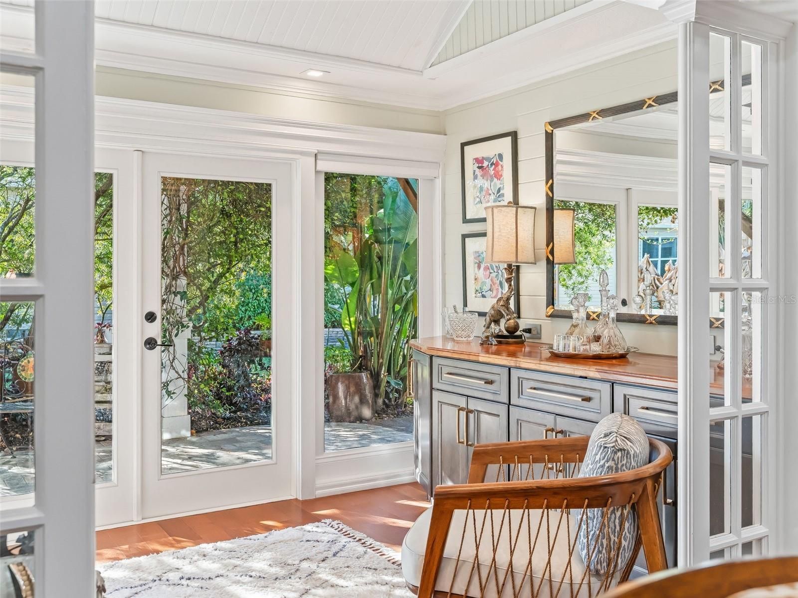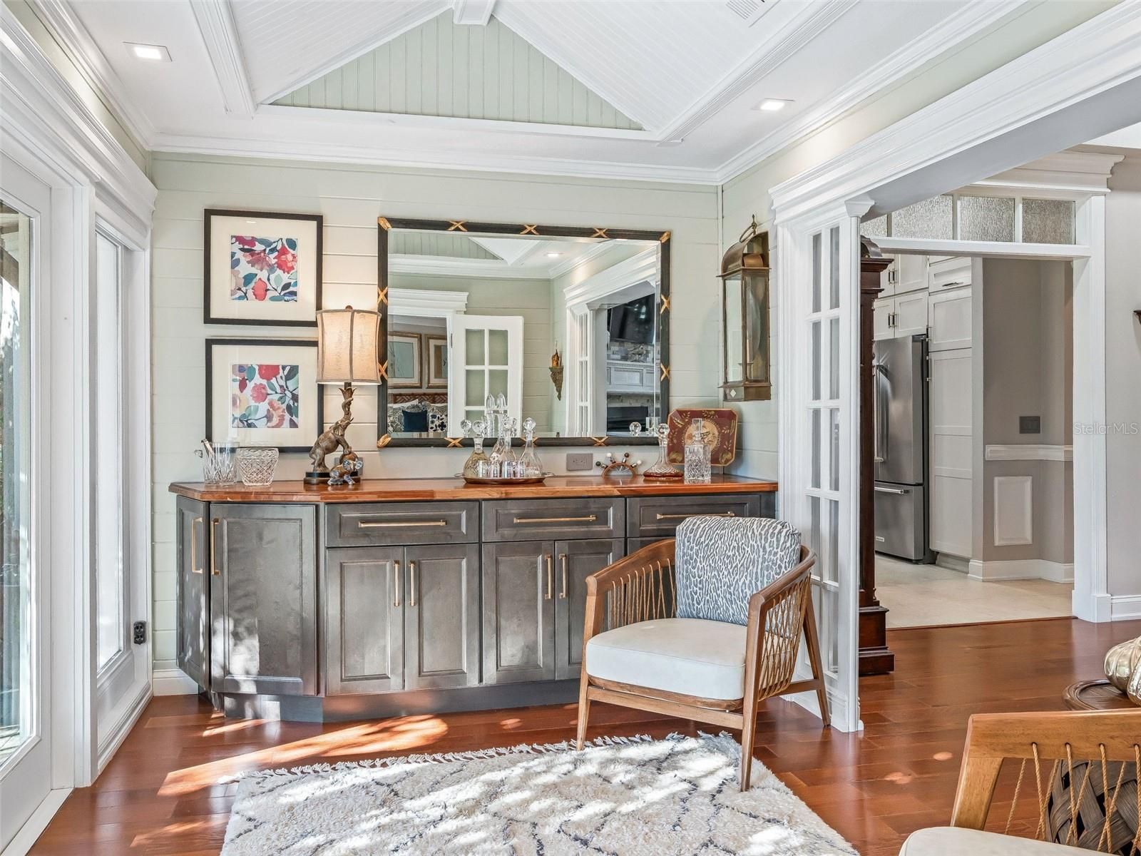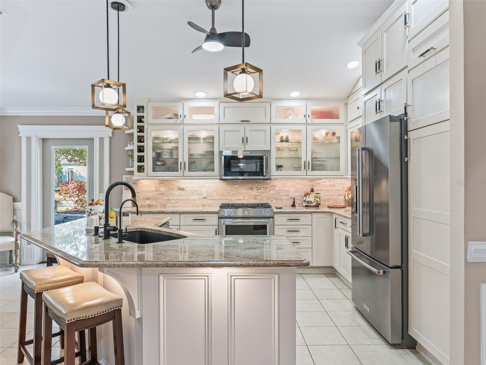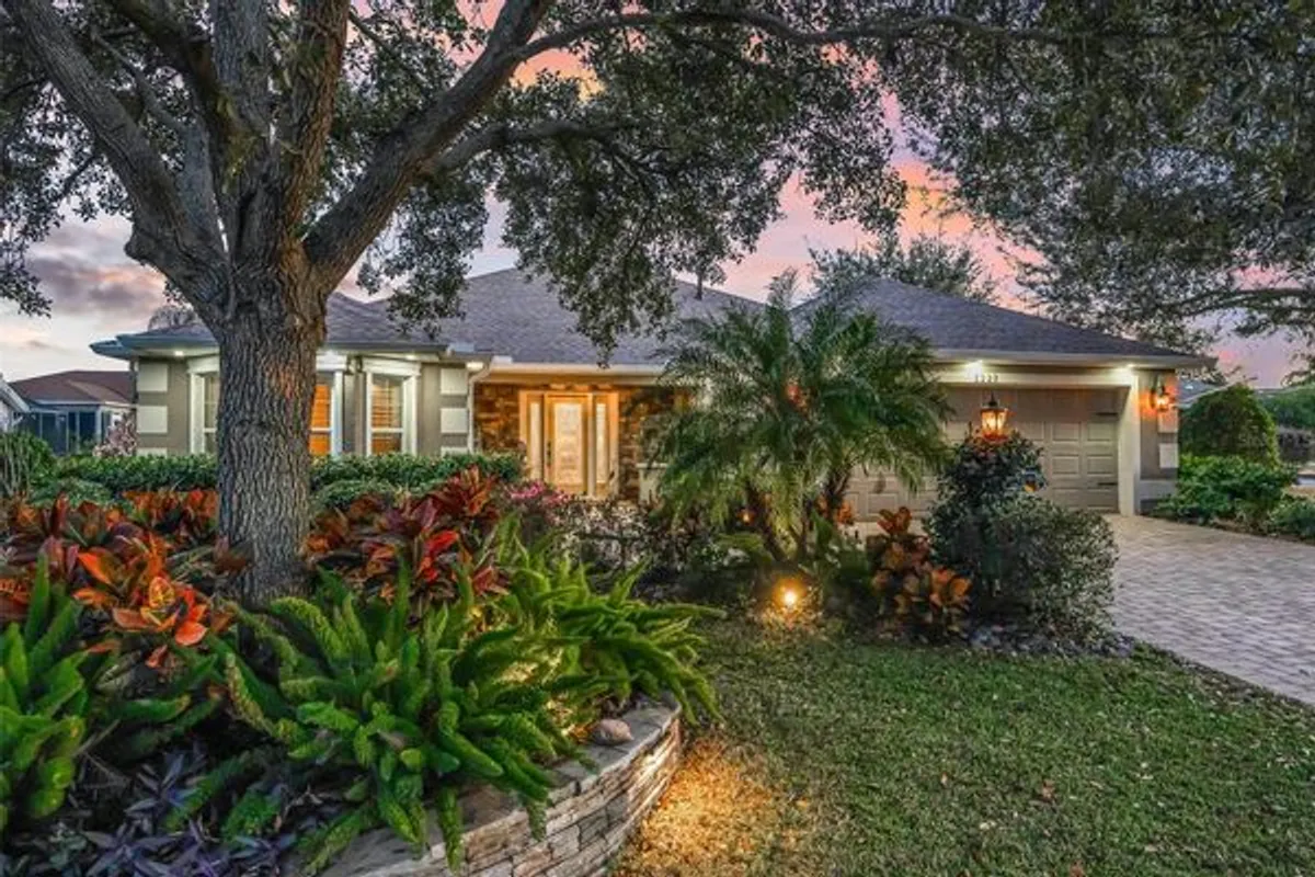 Exquisite Custom Luxury Home on a Prime Corner Lot in an extremely desirable location! This one-of-a-kind residence has been completely customized with high-end finishes and artisan craftsmanship throughout. Situated on a desirable corner lot, the home makes an immediate impression with a stone paver driveway, leaded glass entry with sliding screened door, layered stone facade, stone dividers and lush, mature landscaping. The elegant foyer welcomes you with tile flooring, custom-built entry columns, rich wainscoting, decorative sconces, and a convenient coat closet. Every detail inside reflects superior design, including transom windows throughout, custom shiplap, crown molding, handcrafted wood cornices, built-in cabinetry and shelving, plantation shutters, French doors with Tiffany handles, solar tubes, and oversized 6” baseboards with rounded kick plates. All windows and doorways are fully custom framed, enhancing the architectural character of the home. A beautiful blend of hardwood flooring and tile flows seamlessly throughout.The great room is a stunning focal point, featuring a floor-to-ceiling stone gas fireplace with a granite hearth—perfect for both entertaining and relaxed living. The chef’s kitchen has been completely renovated and is nothing short of exceptional. Highlights include counter-to-ceiling cabinetry with rain glass, Ogee granite countertops, stone backsplash, designer pendant lighting, a Brizo luxury faucet, and a full stainless appliance package with gas range. Thoughtful details abound with pull-out shelving, LED lighting, under/above cabinet lighting, lighting beneath the breakfast bar, a reverse osmosis water system, a pantry with pull-out shelving, and dedicated wine storage. The spacious eat-in dining area features a bay window and easily accommodates a large table with additional room to spare. The den offers incredible flexibility as a bedroom or office and has been fully customized with built-in cabinetry, drawers, shelving, a striking accent wall, and glass French doors. Through another set of French doors, the luxurious primary suite offers a private retreat with architectural features and a spa-like en-suite bath featuring a tiled and Carrera marble shower with dual shower heads, quartz countertops with his-and-her square sinks, a bidet, stone backsplash, tower cabinetry, and additional storage cabinetry/counter. The oversized walk-in closet includes a floor-to-ceiling custom organization system. The guest suite is entered through rare 150-year-old French doors with Tiffany handles, to a spacious bedroom with a bumped-out bay window. The guest bath is equally impressive, showcasing refined upgrades and elegant finishes. The raised, finished sunroom is a showpiece, highlighted by side lights, a vaulted ceiling, custom built-in cabinetry with drawers and butcher block top, shiplap accents, a beautiful ceiling fan, and recessed lighting, all overlooking the private patio with pergola covered in Jasmine! Outdoor living is expansive and private, featuring a second stunning paver patio with a stone Waterfall and fully equipped outdoor kitchen including pizza oven, ice maker, grill and all the amenities needed for unforgettable relaxation or entertaining. This extraordinary home blends timeless craftsmanship with modern luxury—truly a rare offering for the most discerning buyer. This incredible home offers the upmost in high-end finishes. Schedule your private viewing. Room for golf cart garage to be added!