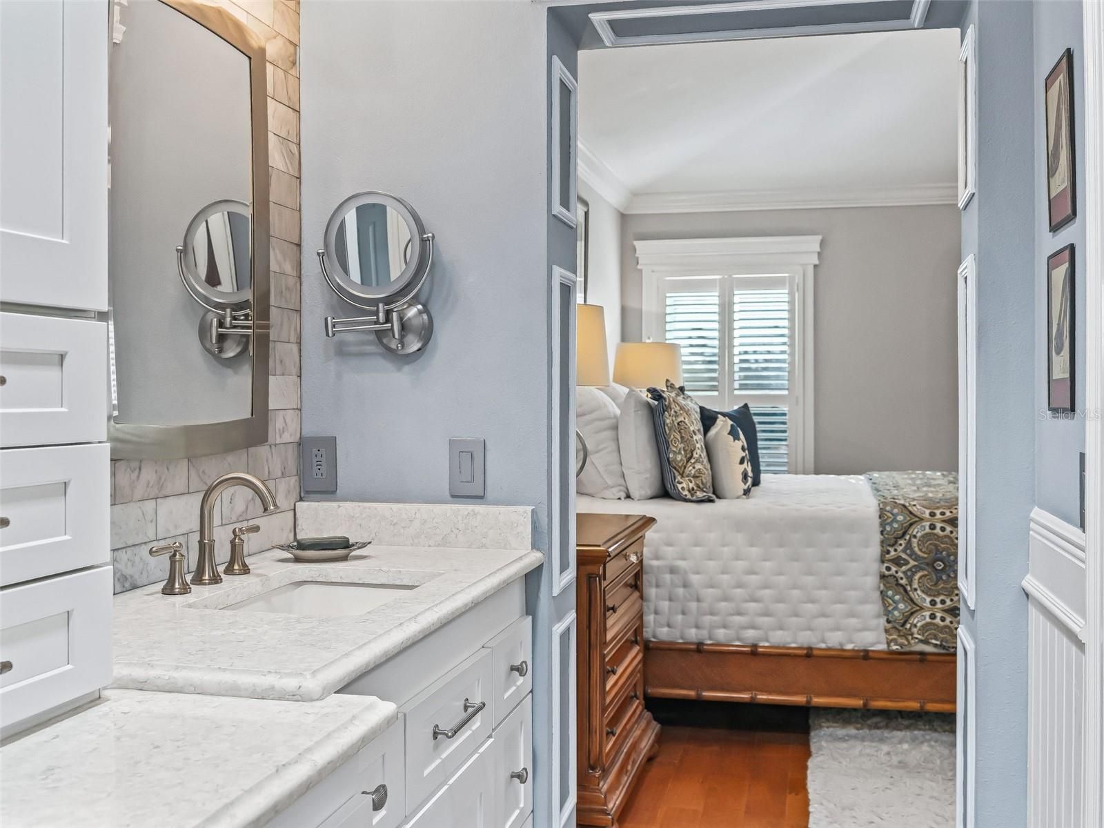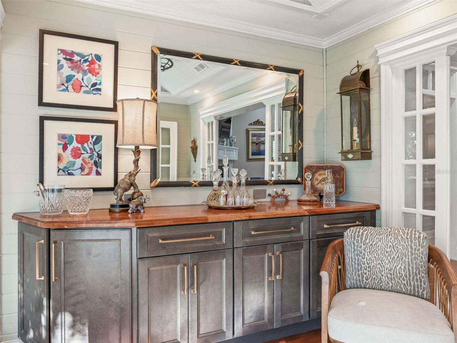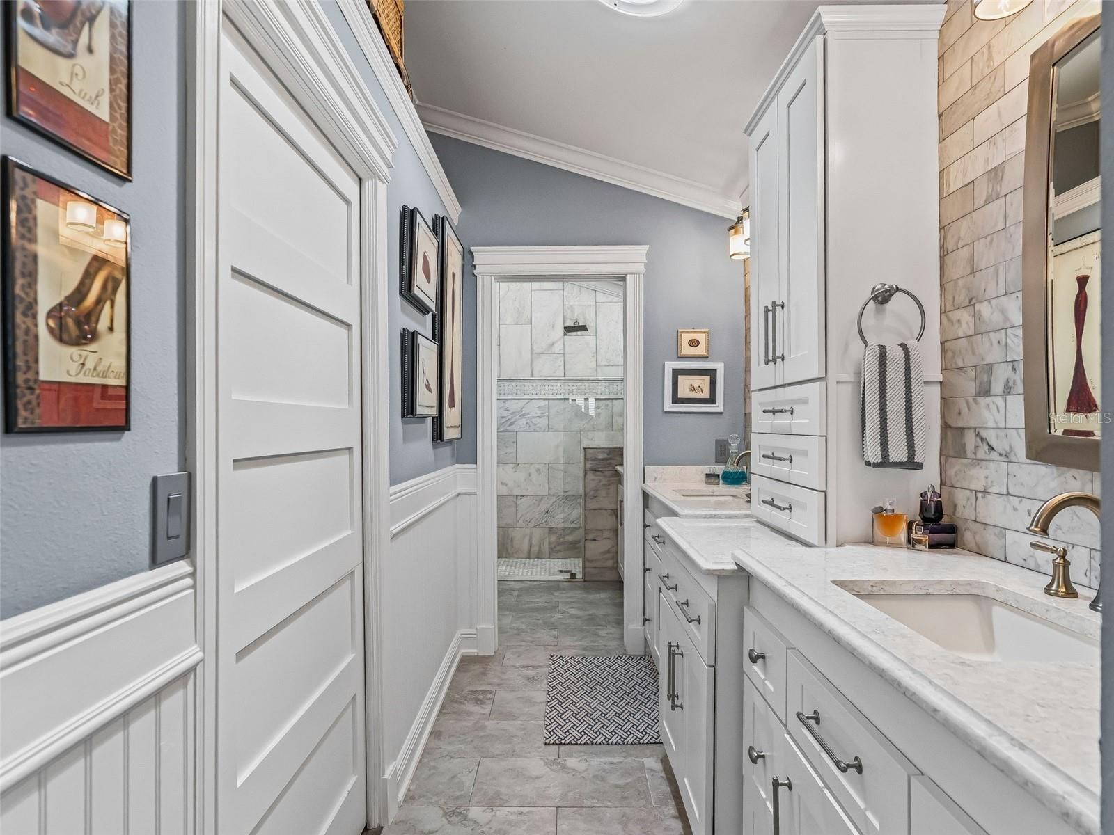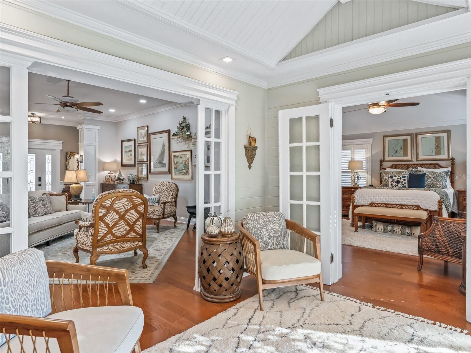Exquisite Custom Luxury Home on a Prime Corner Lot in an extremely desirable location! This one-of-a-kind residence has been completely customized with high-end finishes and artisan craftsmanship throughout. Situated on a desirable corner lot, the home makes an immediate impression with a stone paver driveway, leaded glass entry with sliding screened door, layered stone facade, stone dividers and lush, mature landscaping. The elegant foyer welcomes you with tile flooring, custom-built entry columns, rich wainscoting, decorative sconces, and a convenient coat closet. Every detail inside reflects superior design, including transom windows throughout, custom shiplap, crown molding, handcrafted wood cornices, built-in cabinetry and shelving, plantation shutters, French doors with Tiffany handles, solar tubes, and oversized 6” baseboards with rounded kick plates. All windows and doorways are fully custom framed, enhancing the architectural character of the home. A beautiful blend of hardwood flooring and tile flows seamlessly throughout.The great room is a stunning focal point, featuring a floor-to-ceiling stone gas fireplace with a granite hearth—perfect for both entertaining and relaxed living. The chef’s kitchen has been completely renovated and is nothing short of exceptional. Highlights include counter-to-ceiling cabinetry with rain glass, Ogee granite countertops, stone backsplash, designer pendant lighting, a Brizo luxury faucet, and a full stainless appliance package with gas range. Thoughtful details abound with pull-out shelving, LED lighting, under/above cabinet lighting, lighting beneath the breakfast bar, a reverse osmosis water system, a pantry with pull-out shelving, and dedicated wine storage. The spacious eat-in dining area features a bay window and easily accommodates a large table with additional room to spare. The den offers incredible flexibility as a bedroom or office and has been fully customized with built-in cabinetry, drawers, shelving, a striking accent wall, and glass French doors. Through another set of French doors, the luxurious primary suite offers a private retreat with architectural features and a spa-like en-suite bath featuring a tiled and Carrera marble shower with dual shower heads, quartz countertops with his-and-her square sinks, a bidet, stone backsplash, tower cabinetry, and additional storage cabinetry/counter. The oversized walk-in closet includes a floor-to-ceiling custom organization system. The guest suite is entered through rare 150-year-old French doors with Tiffany handles, to a spacious bedroom with a bumped-out bay window. The guest bath is equally impressive, showcasing refined upgrades and elegant finishes. The raised, finished sunroom is a showpiece, highlighted by side lights, a vaulted ceiling, custom built-in cabinetry with drawers and butcher block top, shiplap accents, a beautiful ceiling fan, and recessed lighting, all overlooking the private patio with pergola covered in Jasmine! Outdoor living is expansive and private, featuring a second stunning paver patio with a stone Waterfall and fully equipped outdoor kitchen including pizza oven, ice maker, grill and all the amenities needed for unforgettable relaxation or entertaining. This extraordinary home blends timeless craftsmanship with modern luxury—truly a rare offering for the most discerning buyer. This incredible home offers the upmost in high-end finishes. Schedule your private viewing. Room for golf cart garage to be added!