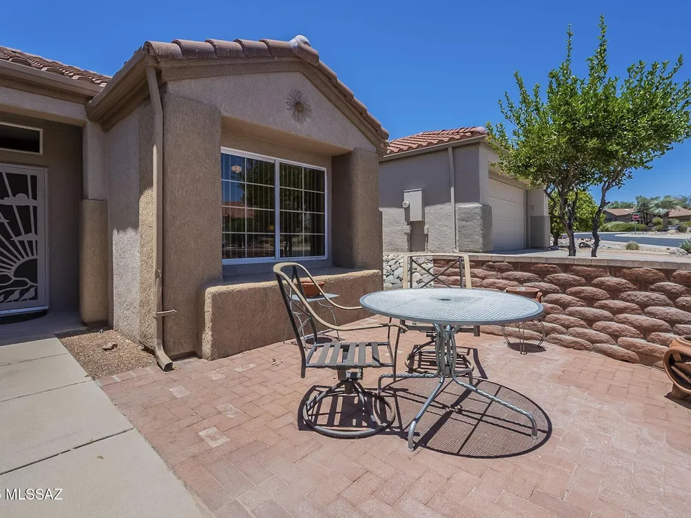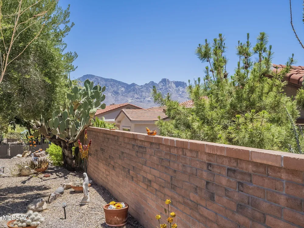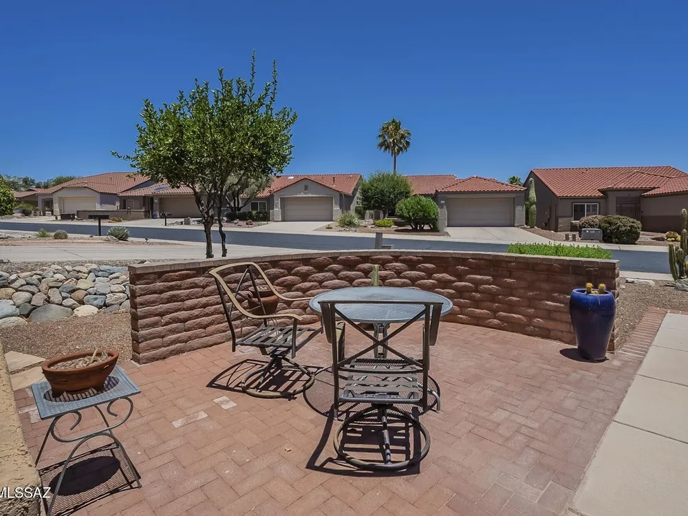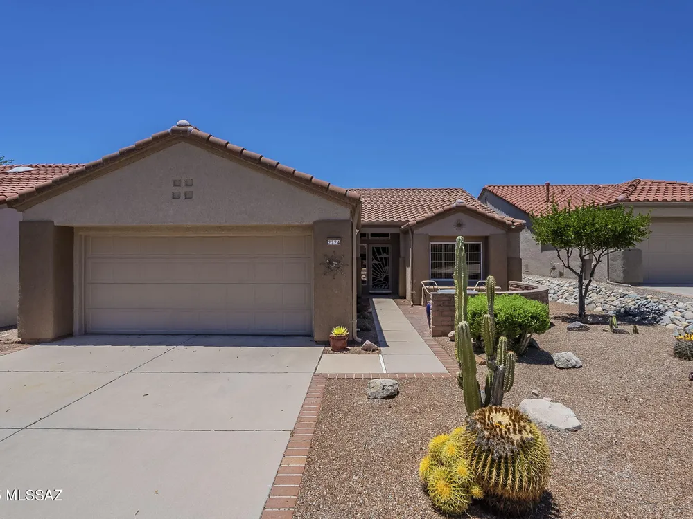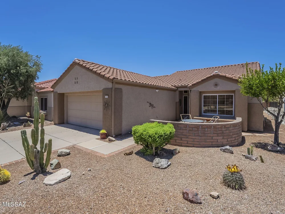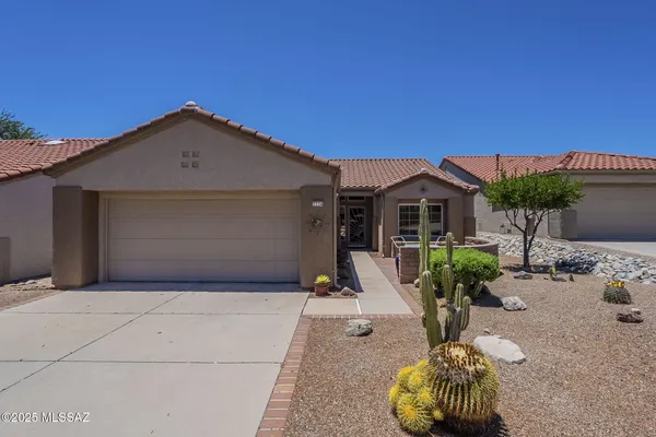 Charming 2BD/2BA (1,221 sq ft) home greets you with a front paver patio offering peeks of the Catalinas. Newer roof/HVAC/water heater. Enter to find a formal living room with architectural media wall. Beyond lies a Great room with dining area off patio and chef's kitchen with breakfast bar. Split bedroom plan features primary suite with spacious vanity, shower/tub and walk-in closet with built-ins. Front guest room offers front patio views and adjacent hall bath. Additional amenities include clerestory windows, laundry & garage storage cabinets, plus front/rear security doors. Retreat to a covered rear patio with outer flagstone pavers, rear brick fence, easy care landscape and peeks of the Catalinas. All home furnishings available for purchase. Sun City Active Adult Community.
