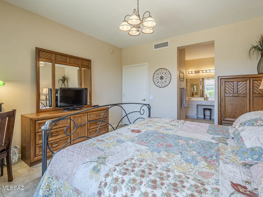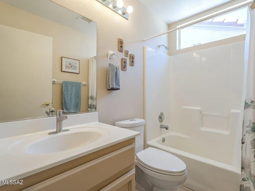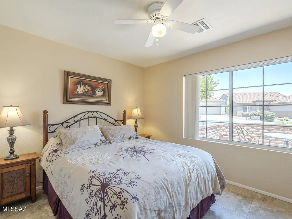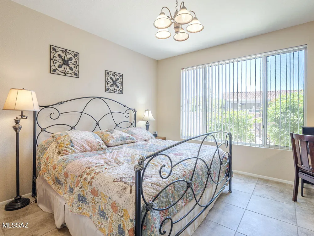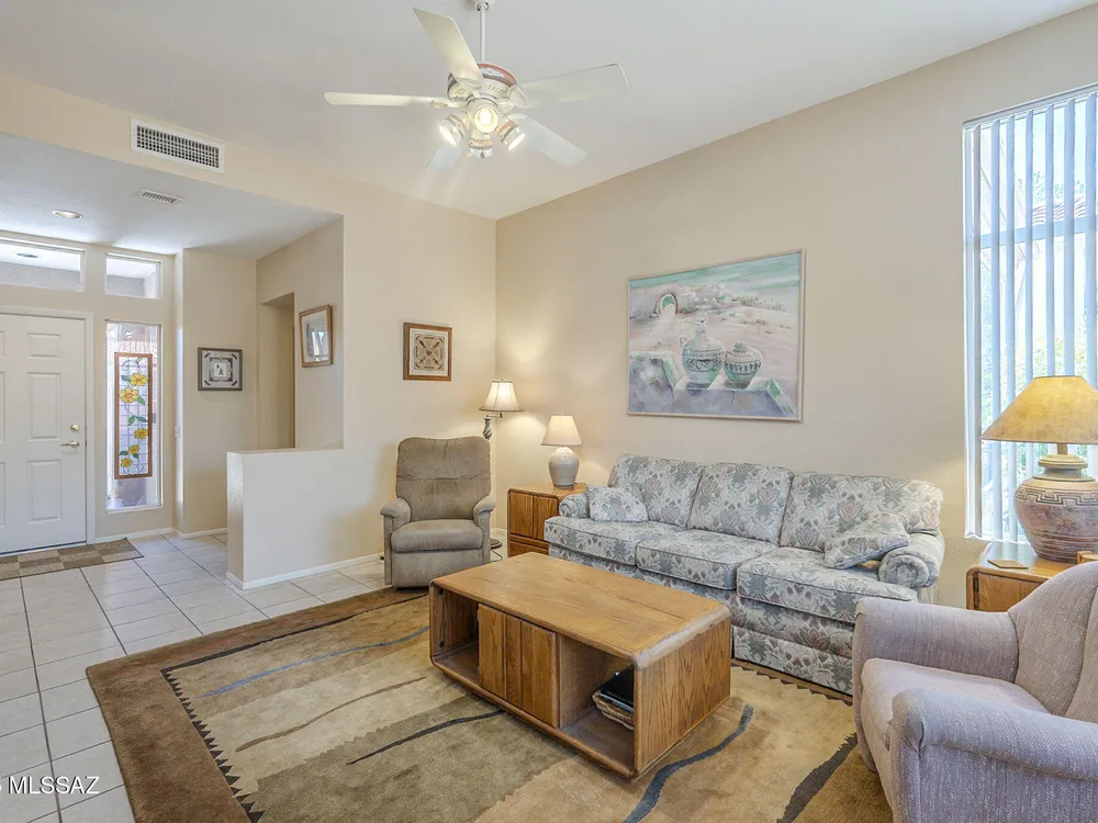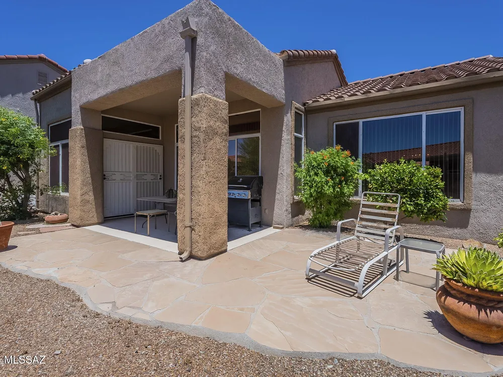 Charming 2BD/2BA (1,221 sq ft) home greets you with a front paver patio offering peeks of the Catalinas. Newer roof/HVAC/water heater. Enter to find a formal living room with architectural media wall. Beyond lies a Great room with dining area off patio and chef's kitchen with breakfast bar. Split bedroom plan features primary suite with spacious vanity, shower/tub and walk-in closet with built-ins. Front guest room offers front patio views and adjacent hall bath. Additional amenities include clerestory windows, laundry & garage storage cabinets, plus front/rear security doors. Retreat to a covered rear patio with outer flagstone pavers, rear brick fence, easy care landscape and peeks of the Catalinas. All home furnishings available for purchase. Sun City Active Adult Community.