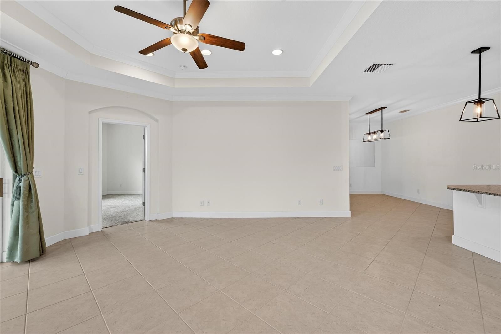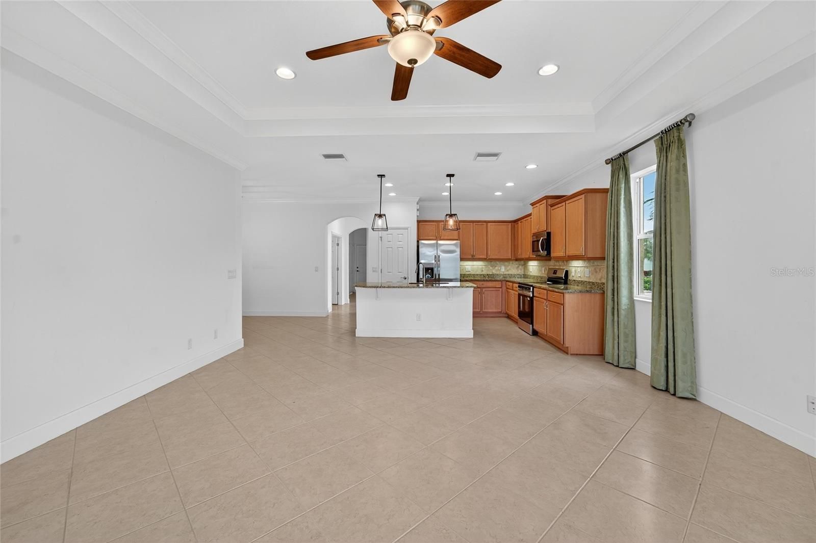 - Ceiling Fan(s), Coffered Ceiling(s), Crown Molding, Eat-in Kitchen, High Ceilings, Kitchen/Family Room Combo, Open Floorplan, Main Level Primary, Solid Surface Counters, Stone Counters, Thermostat, Walk-In Closet(s), Window Treatments