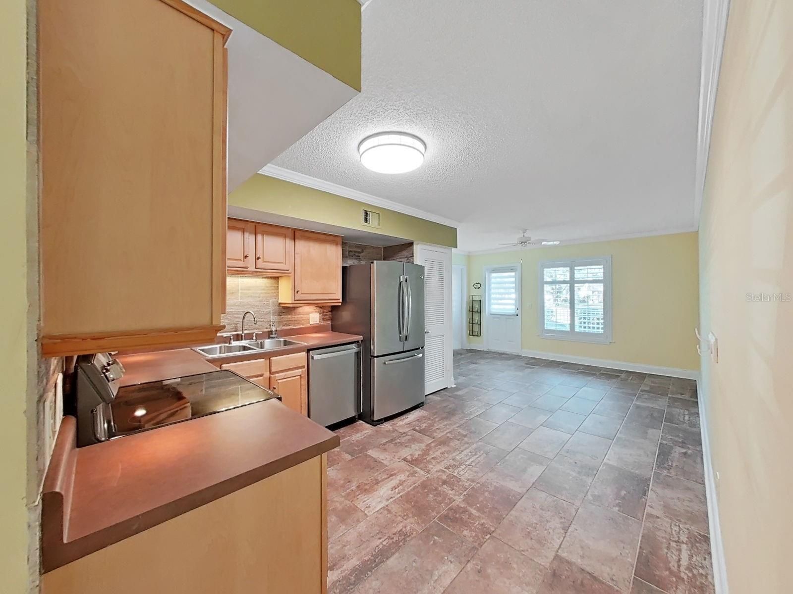 Welcome to an 1100 sq.ft., 2 Bedroom/2 Bathroom condo #4 in the "Flamenco Building". OLE!! Located on the ground floor with a covered front patio. This beautifully updated condo is on the desirable West Side of "On Top of the World", Florida's premier 55+ Active Community. On Top of the World is a non-flood and non-evacuation zone, so no need for special flood insurance. This inviting condo showcases Key West colors, consistent porcelain tile flooring throughout the Living-Dining areas, Kitchen and each Bedroom. Take notice of 5-inch Baseboards and wonderful Crown Moldings. Quality and Charm abound with PVC Plantation Shutters on every window! These are insulated/impact vinyl clad windows (2015), and an insulated back door. (2018). The mechanicals are an International Comfort Systems HVAC (installed 3/2016), with UV light and a Rheem Classic HWH (2014). The attractive, remodeled, eat-in kitchen features wood cabinetry, a stunning tile backsplash, Formica countertops and stainless-steel appliances. Inside Laundry is conveniently located in the entry to the primary Bedroom. Both Bathrooms have been thoughtfully updated with modern cabinetry, tile flooring and newer fixtures. Enjoy the convenience of your own assigned parking space right in front of your door. No steps until you enter, plus ample guest parking! The fenced-in back patio is ready for your grill and your doggie. There are no size restrictions for your pet. Ample green space exists just beyond the fence and offers lots of grass to walk. Life here is more than a beautiful condo, it’s about a vibrant, 55+ active lifestyle! There is so much to do, if you choose. Walk to the Westside Recreation Building where you can swim year-round in the Heated Pool, or soak in the Hot Tub. Play Billiards or competitive Ping-Pong. Residents enjoy two private Golf Courses (9 and 18 holes) – FREE for owners. Two heated swimming pools, Tennis and Pickleball courts, a modern cardio Gym, a pet-friendly Dog Park with covered seating, a Jewelry Design Studio, a full Wood Shop, Fitness Classes, Dancing, and so much more! The Good Karma Café offers convenient "grab & go" snacks and a morning coffee clutch. All this, just minutes from the best beaches in the country! You will certainly appreciate nearby shopping, dining and entertainment. This community is centrally located for easy commutes to Tampa, St. Petersburg and many small towns like Dunedin, Tarpon Springs and Safety Habor. Each have their own flavors and are fun day trips. Don’t miss your chance to own this move-in-ready condo in one of Florida’s most sought-after active adult communities! Quality Medical facilities are close by. If financing, a 35% down payment is required.