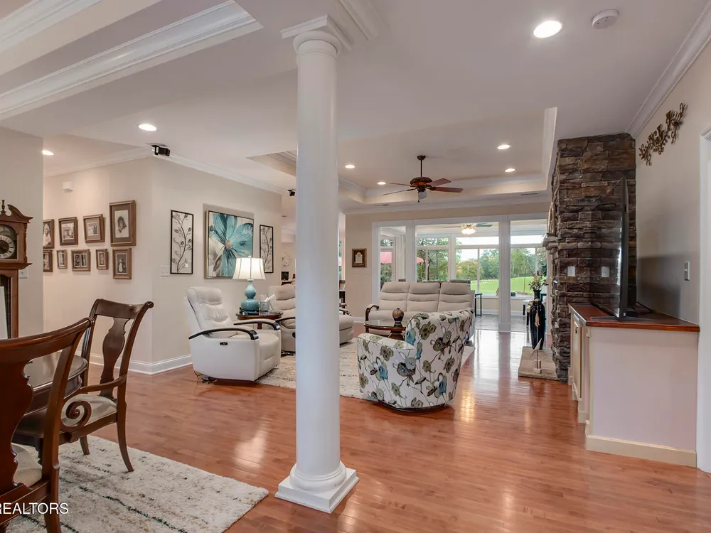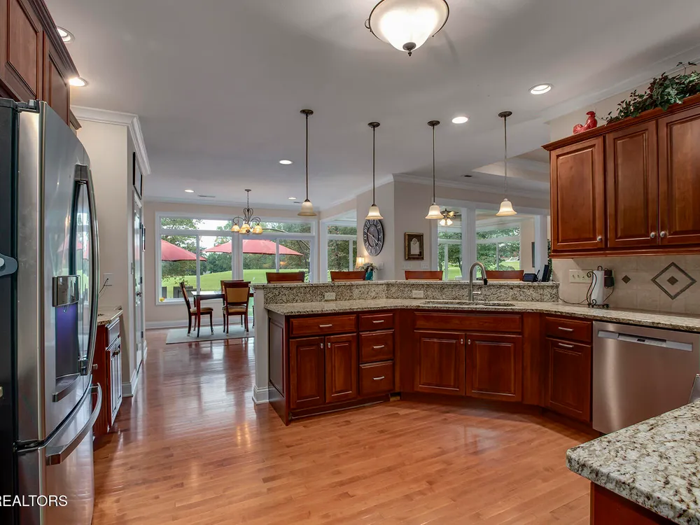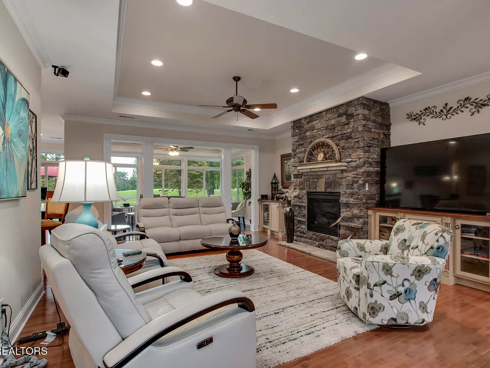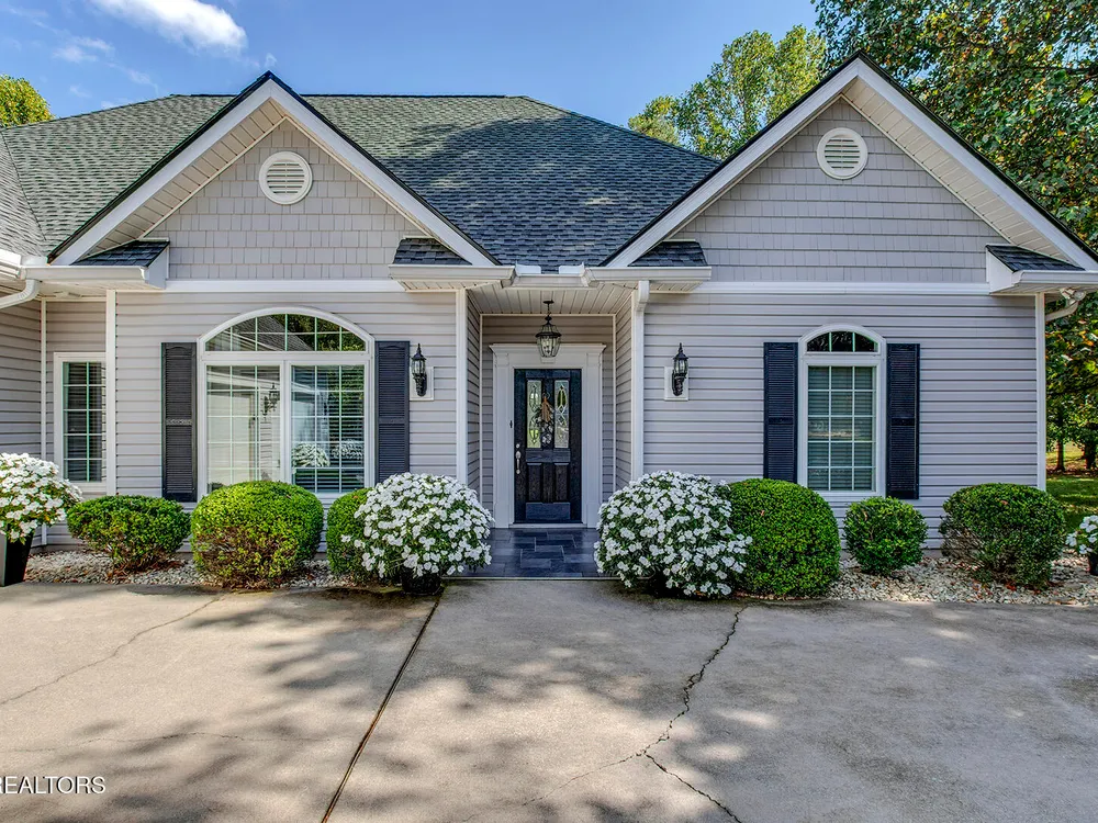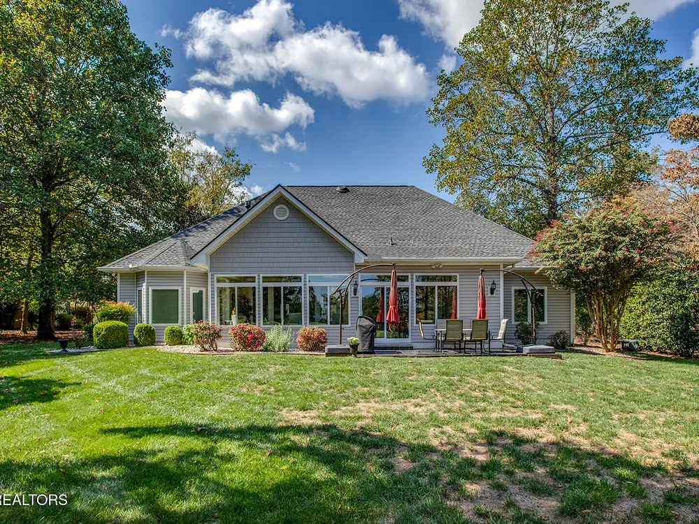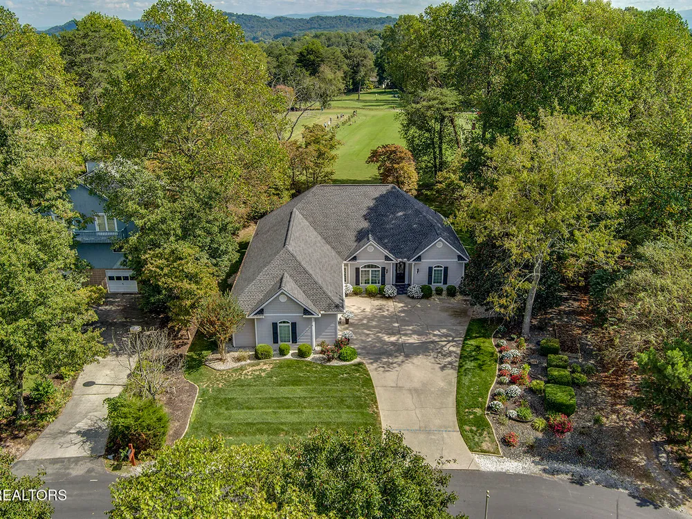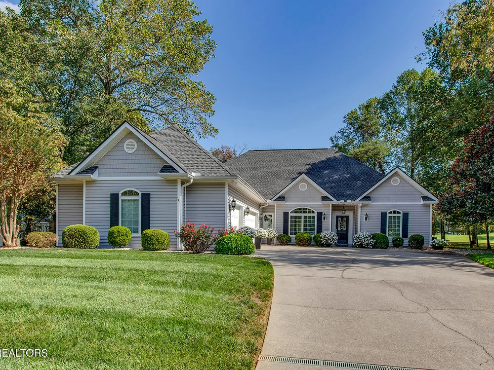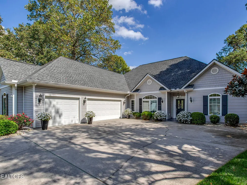 Location, location, location! This beautiful custom-built home is on the market for the first time in Tellico Village. Offering 2,700 square feet of living space, it's ideally situated on the Toqua golf course with easy access to putting greens, the driving range, Toqua restaurant, and Toqua Pavilion—where plenty of music and activities take place. If you'd rather drive your golf cart, there's convenient access on the right side of the home. The property features a large three-car garage with ample room for a workshop, golf cart, and vehicles. Inside, hardwood floors grace the entryway, dining room, and kitchen, while tray ceilings enhance the dining room and master bedroom. Crown molding runs throughout the home, complementing a great open floor plan that includes a stunning floor-to-ceiling stone fireplace flanked by custom cabinets on both sides. The custom kitchen boasts cabinetry with soft-close drawers, a raised bar area with plenty of room for stools, a wet bar with wine cooler, extra built-in cabinets, stainless steel appliances, and a spacious pantry. The eat-in area provides awesome views of the golf course. Off the living room, a lovely sunroom with tile floors offers even more scenic vistas, and a patio extends from both the sunroom and breakfast area. With three bedrooms in a split plan for guest privacy, plus two and a half baths, the home is designed for comfort. The nice large laundry room includes space for an office and a laundry tub. The master suite features tray ceilings, double vanities with a makeup area, a jetted tub, walk-in shower, and a very large closet. Outside, enjoy a sprinkler system and professional landscaping. Buyer to verify square footage.