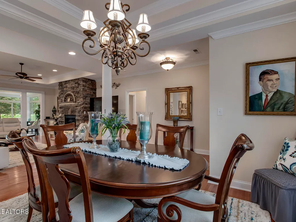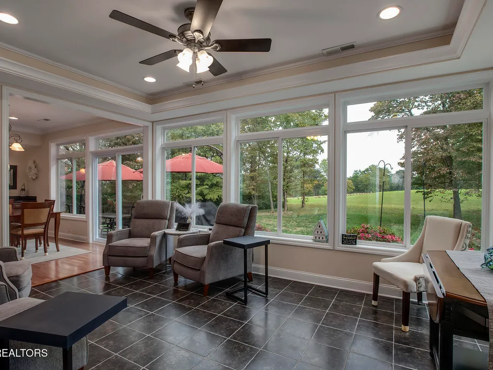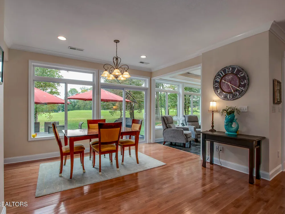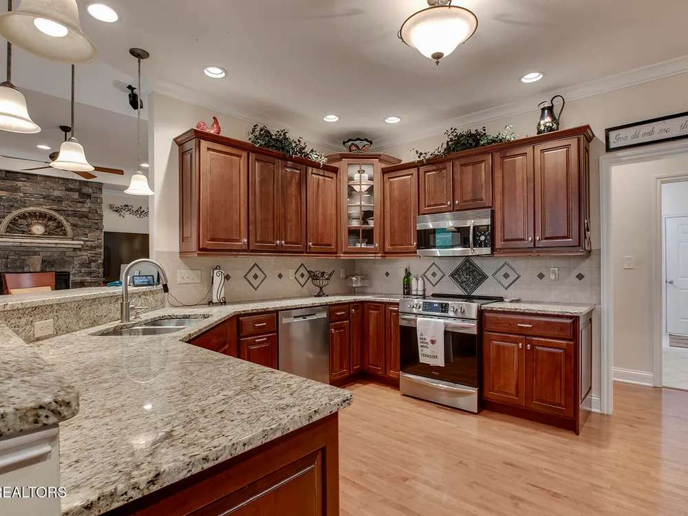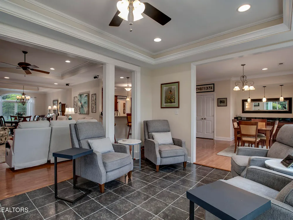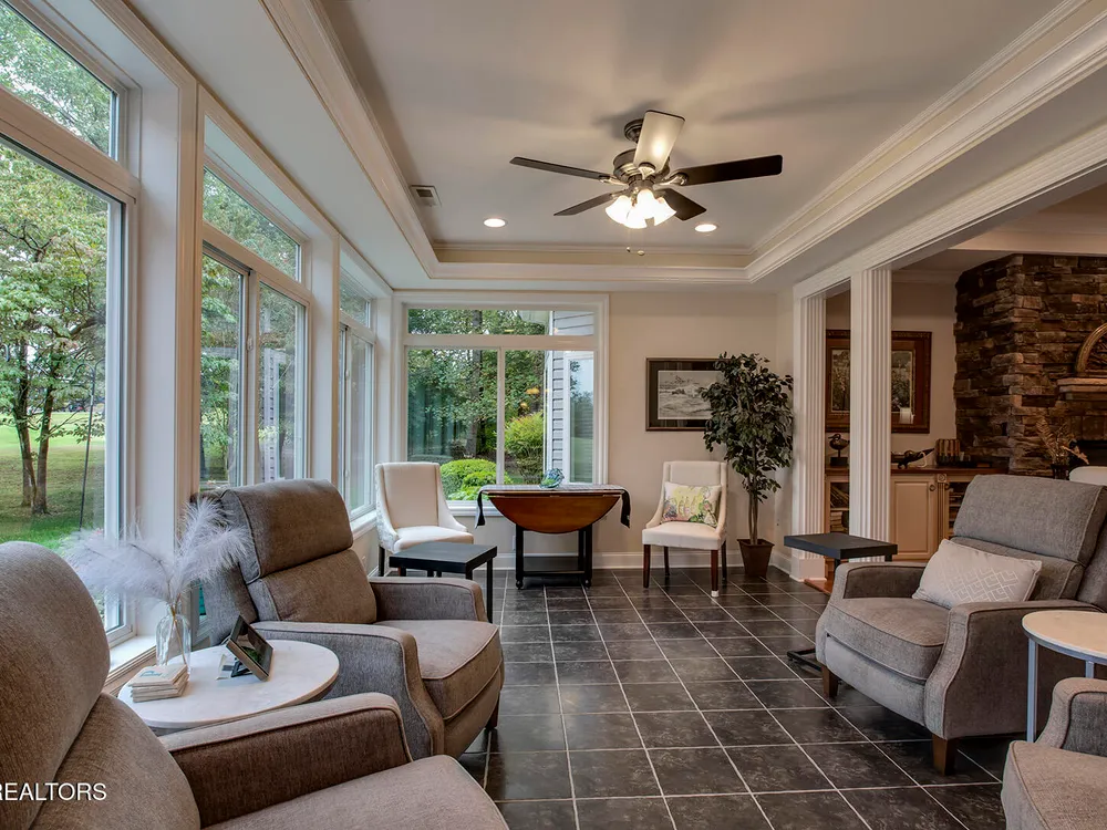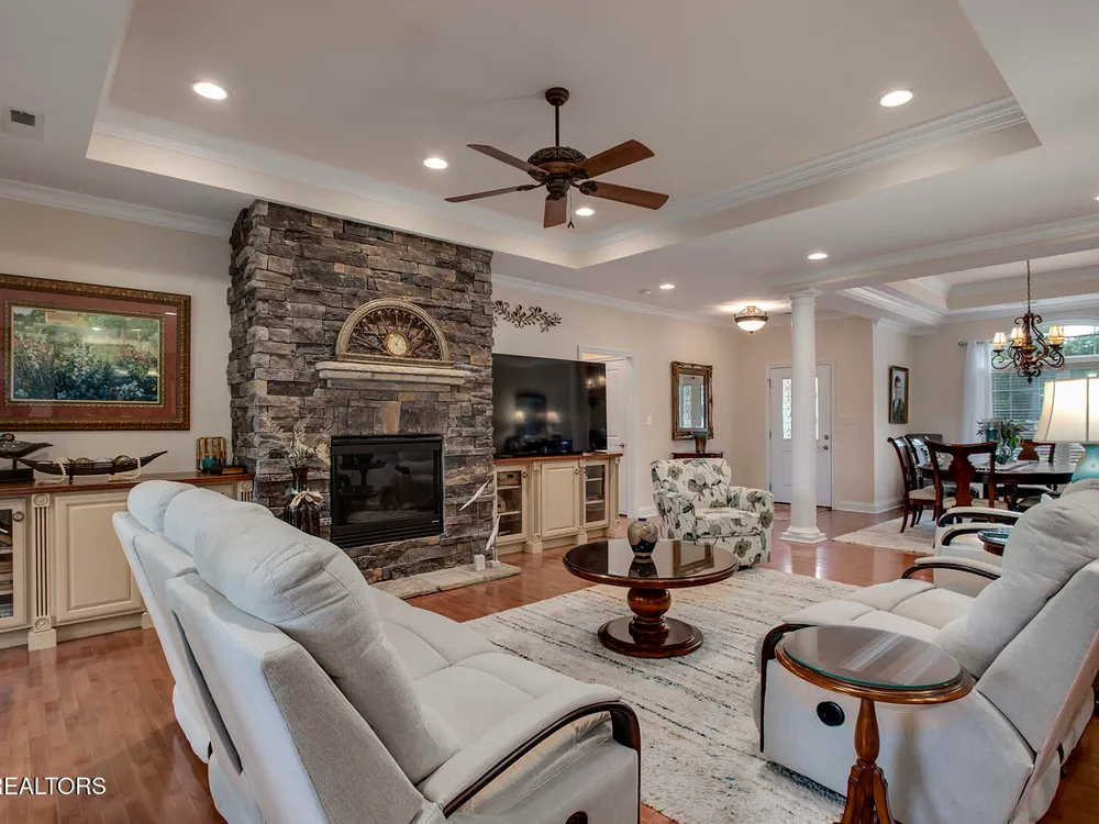 Location, location, location! This beautiful custom-built home is on the market for the first time in Tellico Village. Offering 2,700 square feet of living space, it's ideally situated on the Toqua golf course with easy access to putting greens, the driving range, Toqua restaurant, and Toqua Pavilion—where plenty of music and activities take place. If you'd rather drive your golf cart, there's convenient access on the right side of the home. The property features a large three-car garage with ample room for a workshop, golf cart, and vehicles. Inside, hardwood floors grace the entryway, dining room, and kitchen, while tray ceilings enhance the dining room and master bedroom. Crown molding runs throughout the home, complementing a great open floor plan that includes a stunning floor-to-ceiling stone fireplace flanked by custom cabinets on both sides. The custom kitchen boasts cabinetry with soft-close drawers, a raised bar area with plenty of room for stools, a wet bar with wine cooler, extra built-in cabinets, stainless steel appliances, and a spacious pantry. The eat-in area provides awesome views of the golf course. Off the living room, a lovely sunroom with tile floors offers even more scenic vistas, and a patio extends from both the sunroom and breakfast area. With three bedrooms in a split plan for guest privacy, plus two and a half baths, the home is designed for comfort. The nice large laundry room includes space for an office and a laundry tub. The master suite features tray ceilings, double vanities with a makeup area, a jetted tub, walk-in shower, and a very large closet. Outside, enjoy a sprinkler system and professional landscaping. Buyer to verify square footage.