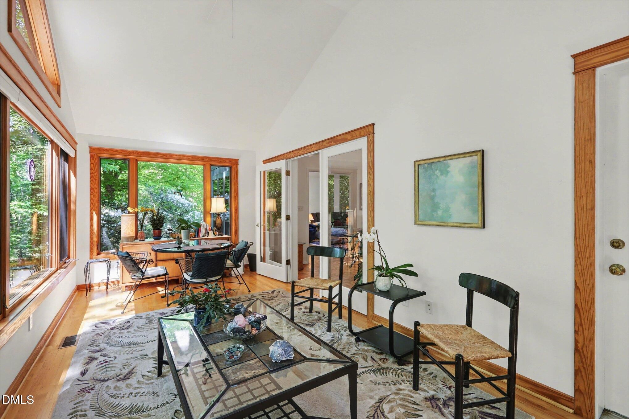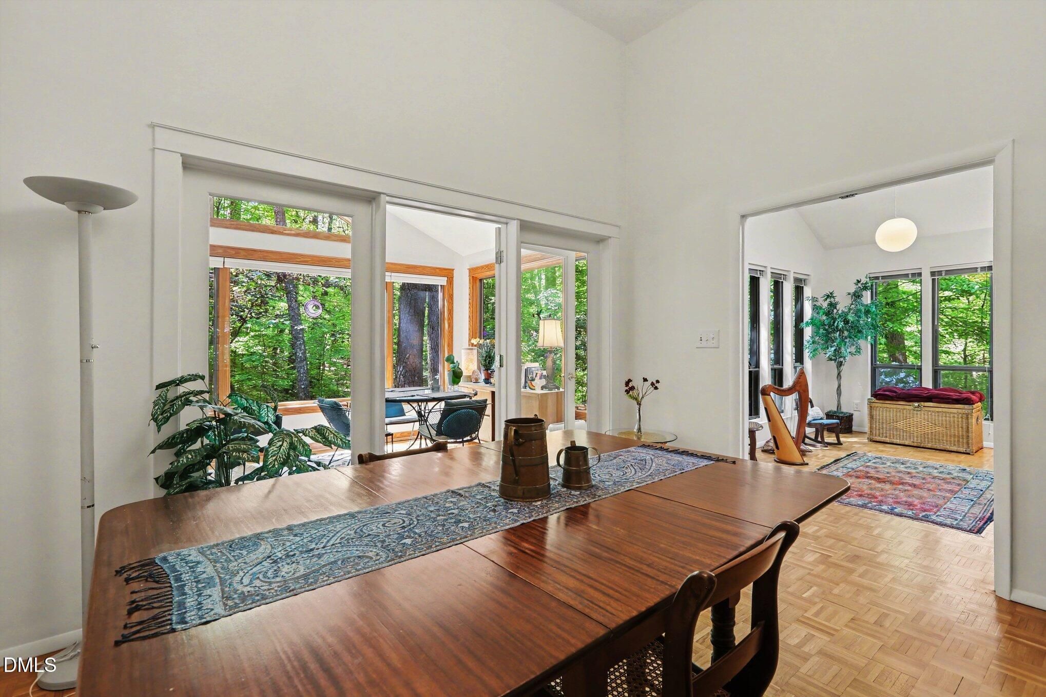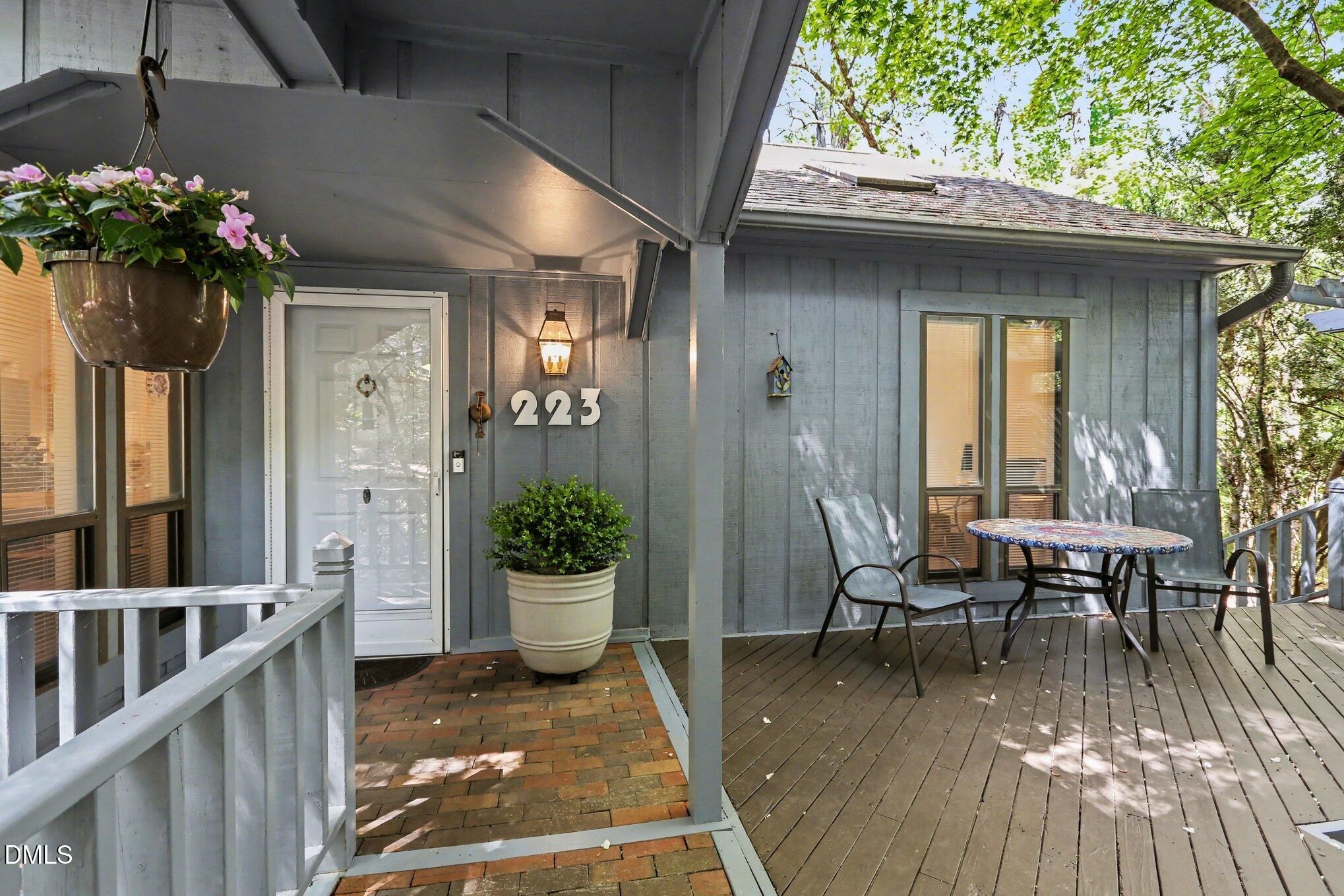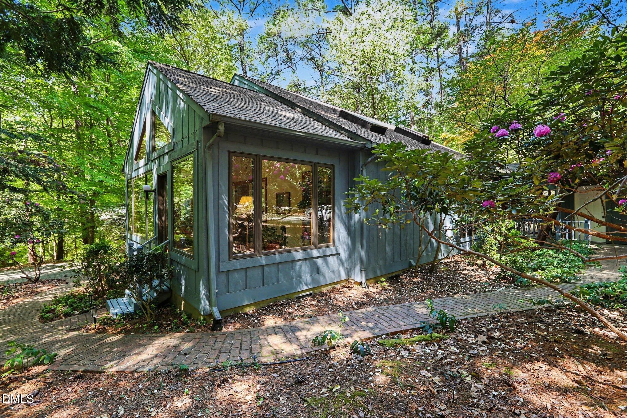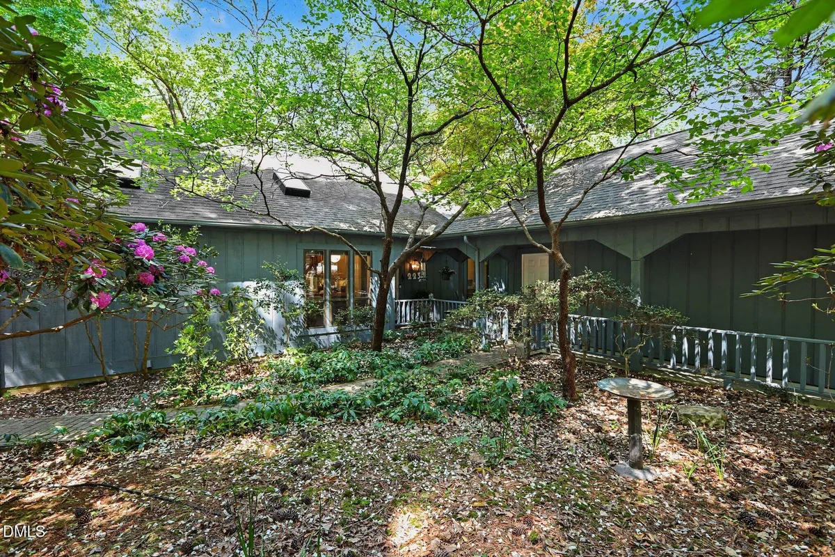 223 Windlestraw sits on a deep, wooded lot offering exceptional privacy and scenic views in the Fearrington Village Historic District. This one-level contemporary home features high ceilings, abundant natural light from expansive windows, and parquet wood floors. A front walkway leads to a deck with seating and a welcoming foyer that opens to a spacious living room with a fireplace, along with a separate dining room. The remodeled kitchen includes stainless-steel appliances, a breakfast area, and adjacent laundry room with ample pantry storage. The primary suite, located at the rear of the home, offers a private bath and two walk-in closets, complemented by two additional bedrooms and a full bath. A sunroom with three walls of windows overlooks the natural landscape. An oversized two-car garage with workshop space is connected by a covered walkway, and a lower-level workshop/storage area opens to the backyard. The mature landscaping - featuring rhododendrons, camellias, azaleas, dogwoods, and a cherry tree - ensures seasonable color from late winter through summer, with brick walkways and a patio completing the setting.