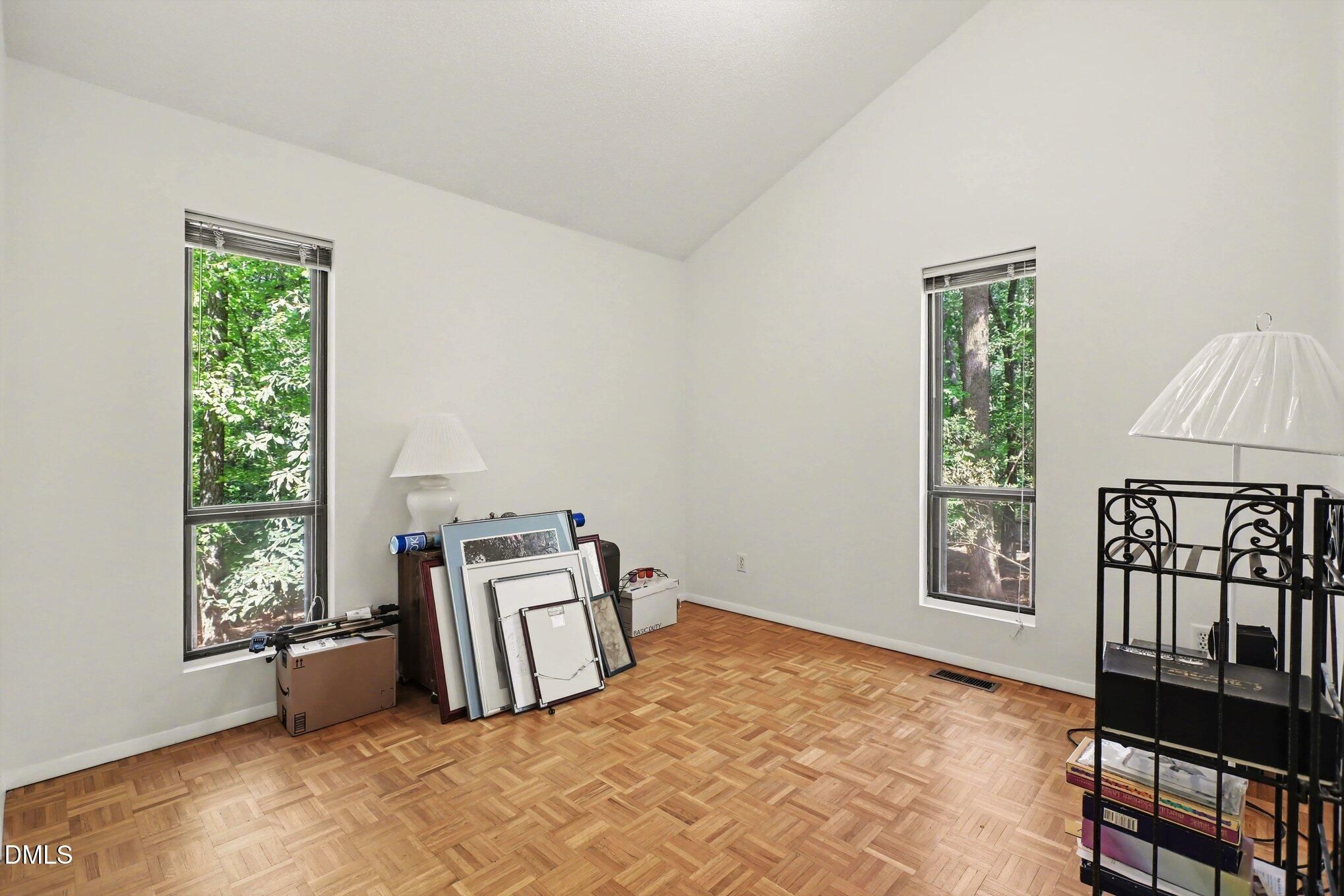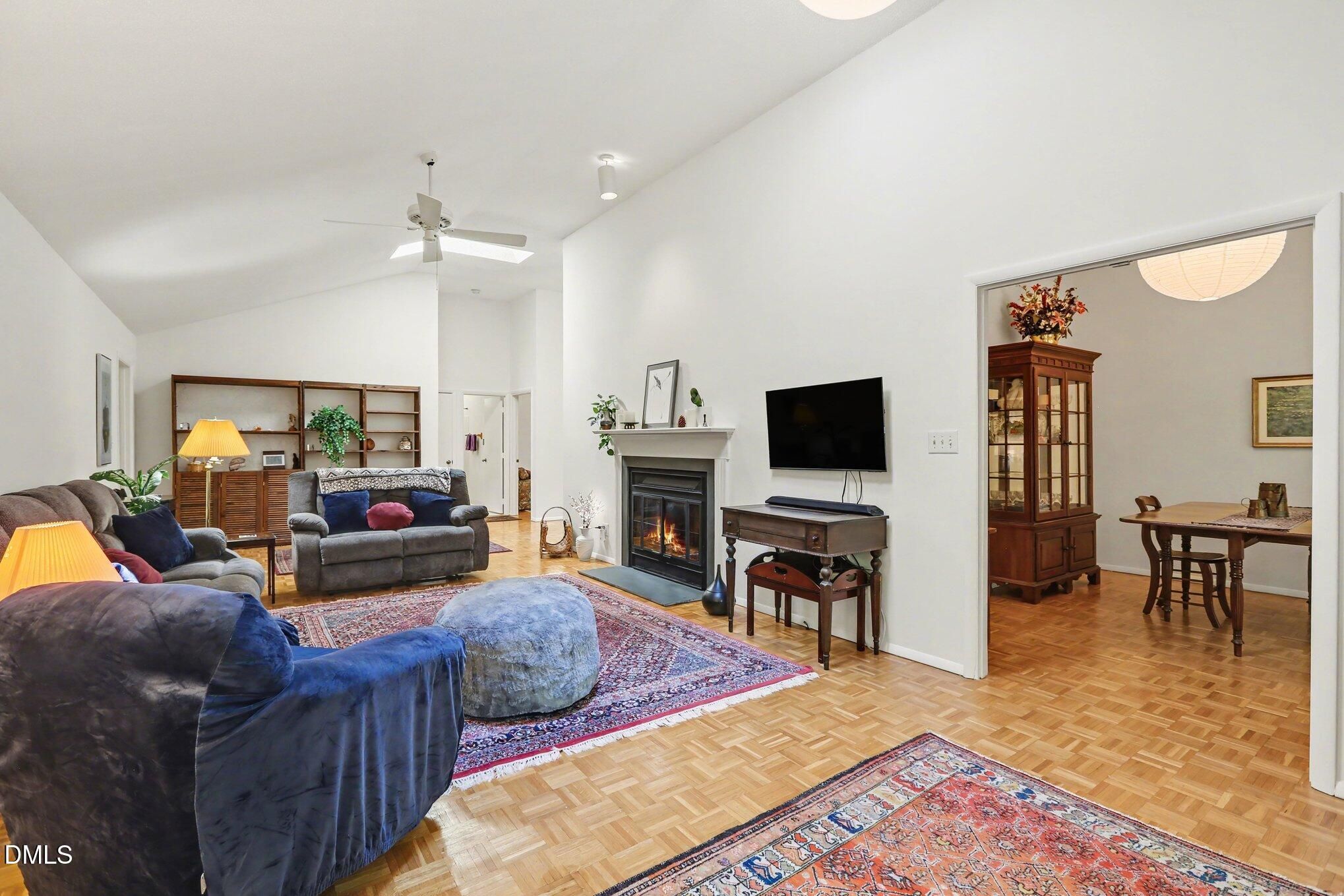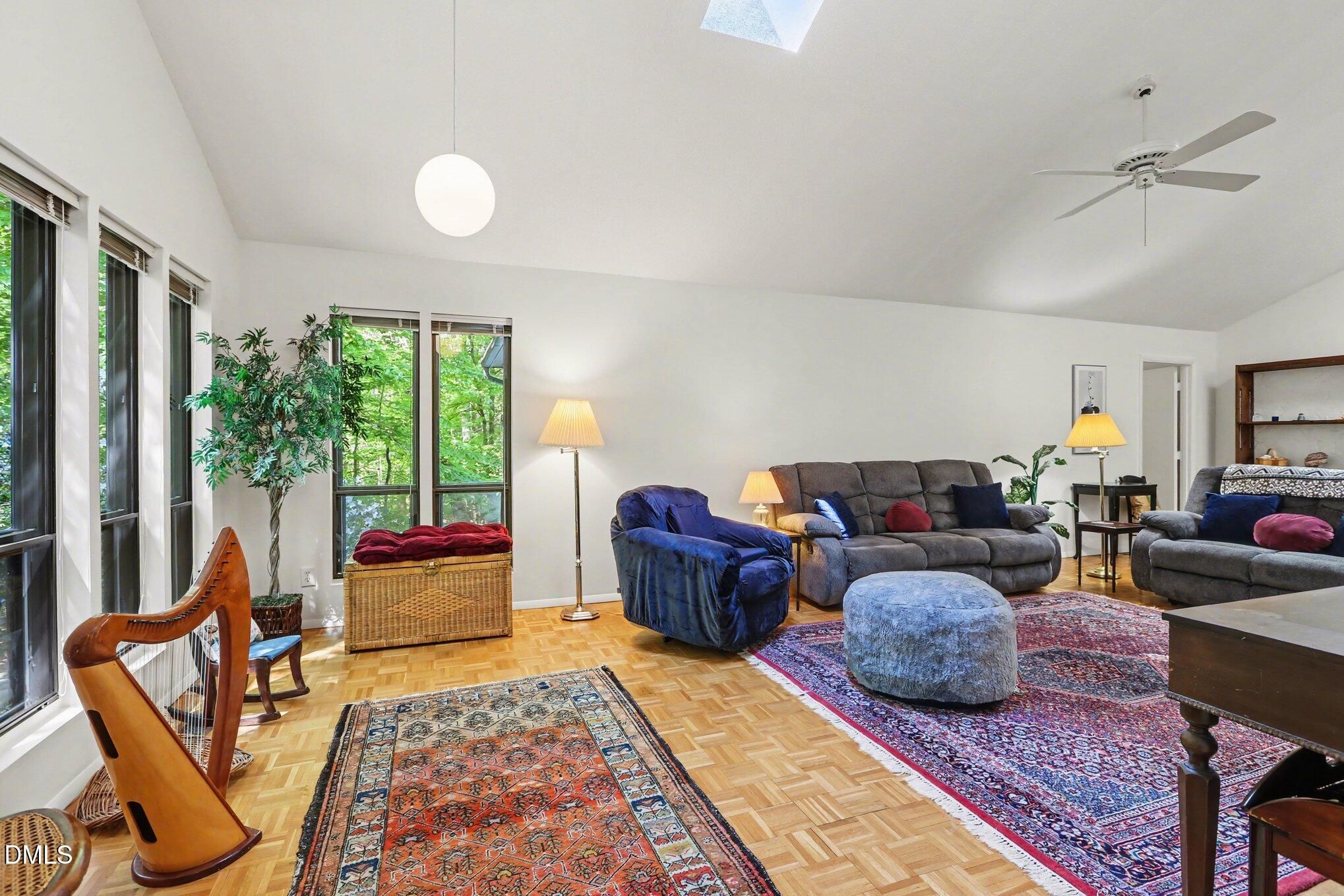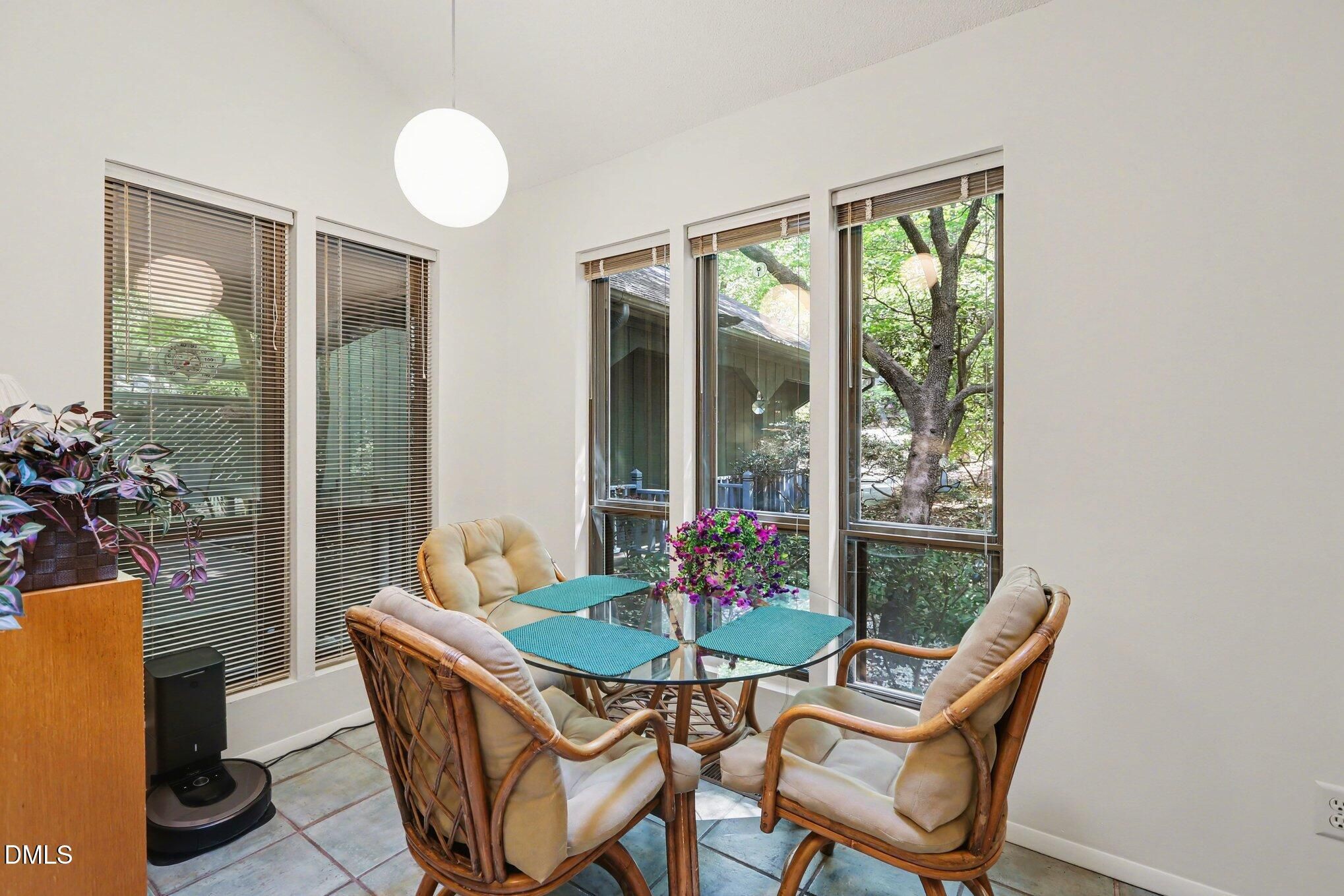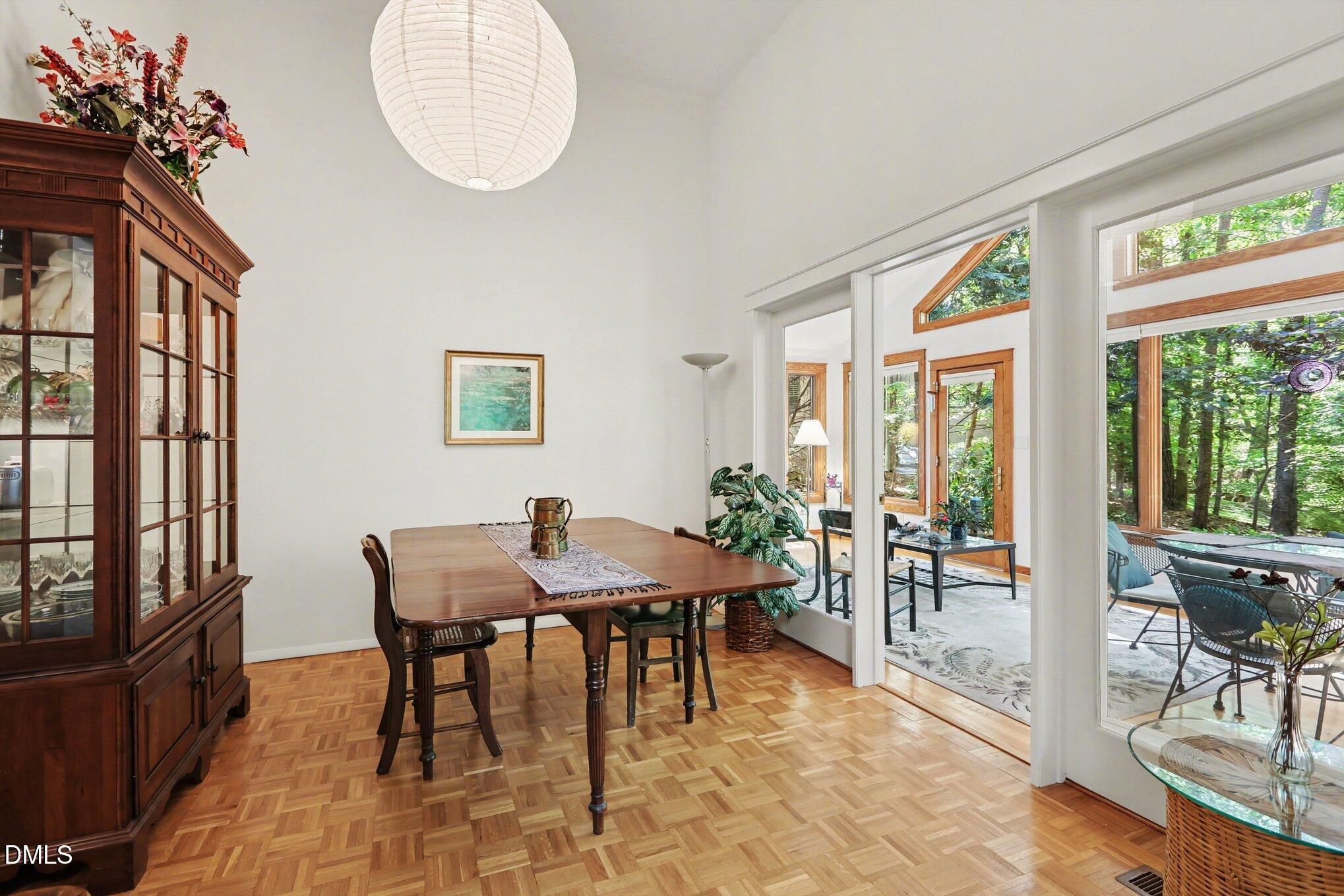 223 Windlestraw sits on a deep, wooded lot offering exceptional privacy and scenic views in the Fearrington Village Historic District. This one-level contemporary home features high ceilings, abundant natural light from expansive windows, and parquet wood floors. A front walkway leads to a deck with seating and a welcoming foyer that opens to a spacious living room with a fireplace, along with a separate dining room. The remodeled kitchen includes stainless-steel appliances, a breakfast area, and adjacent laundry room with ample pantry storage. The primary suite, located at the rear of the home, offers a private bath and two walk-in closets, complemented by two additional bedrooms and a full bath. A sunroom with three walls of windows overlooks the natural landscape. An oversized two-car garage with workshop space is connected by a covered walkway, and a lower-level workshop/storage area opens to the backyard. The mature landscaping - featuring rhododendrons, camellias, azaleas, dogwoods, and a cherry tree - ensures seasonable color from late winter through summer, with brick walkways and a patio completing the setting.