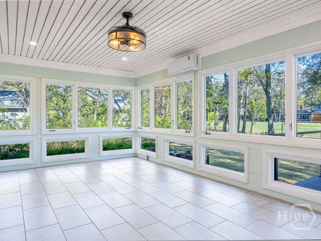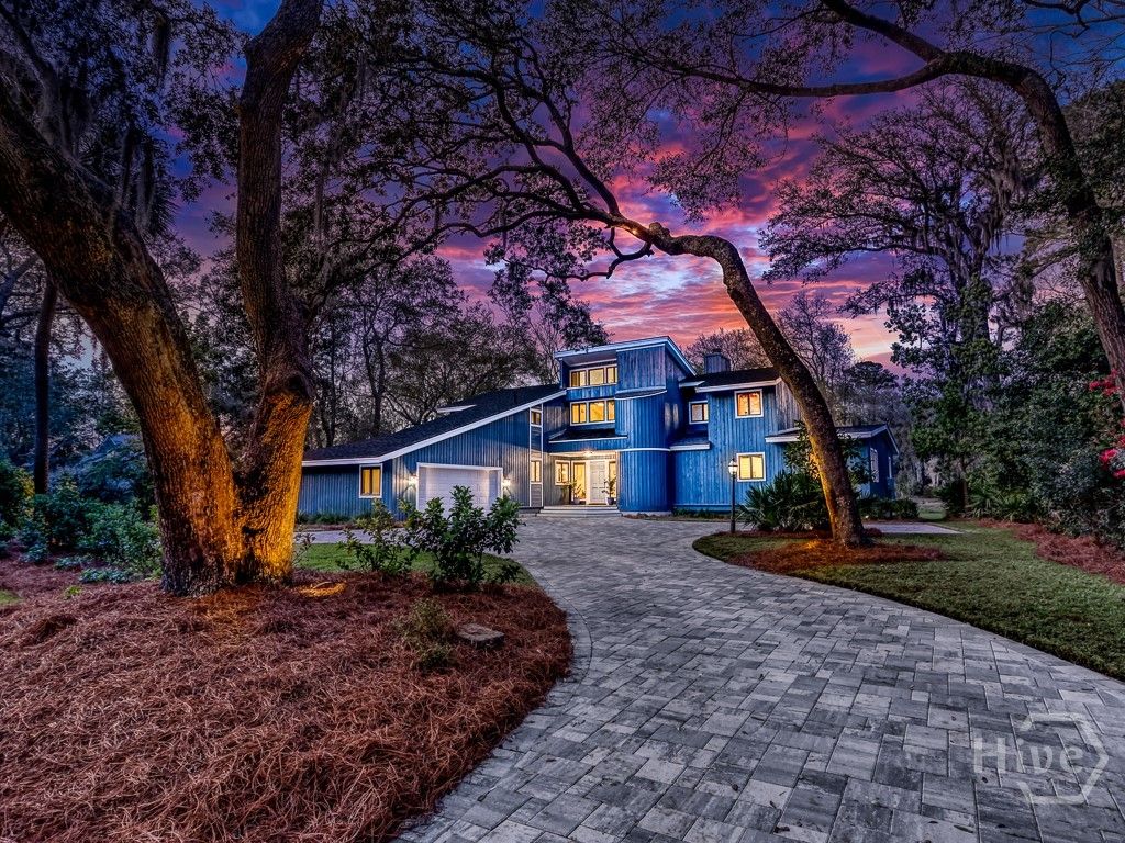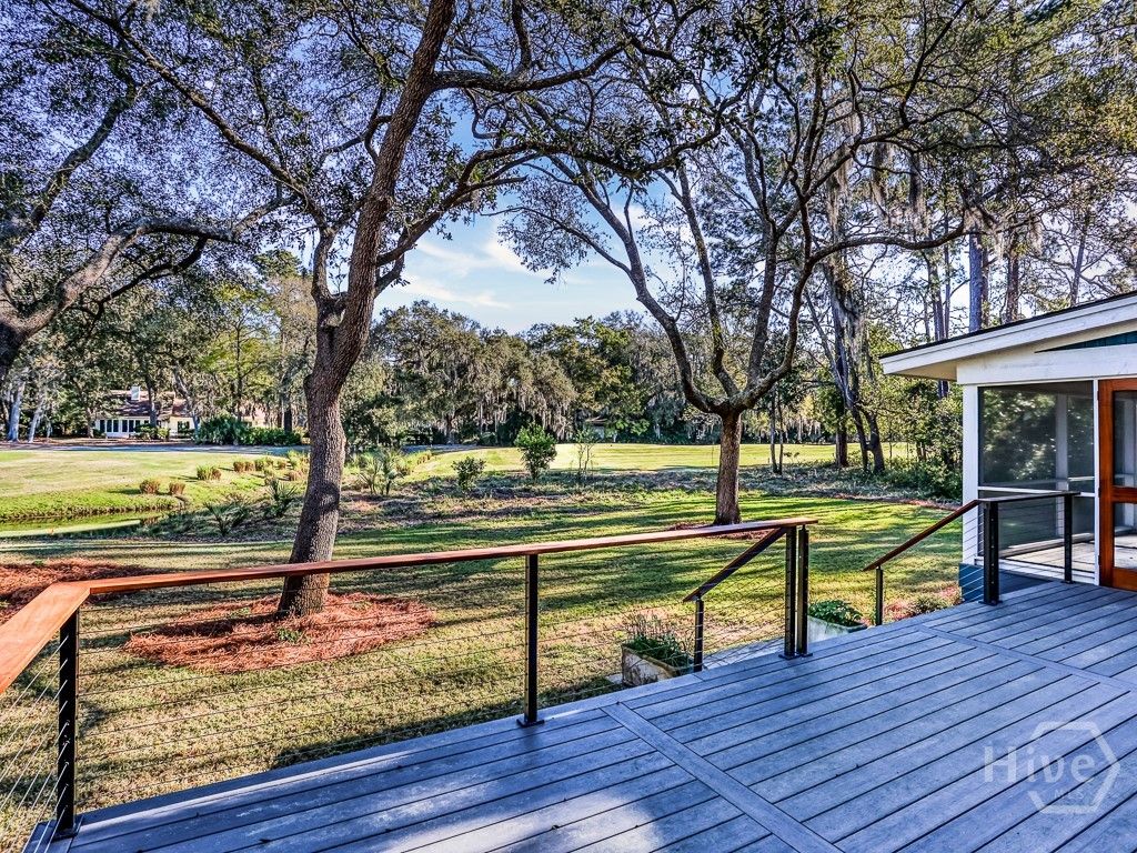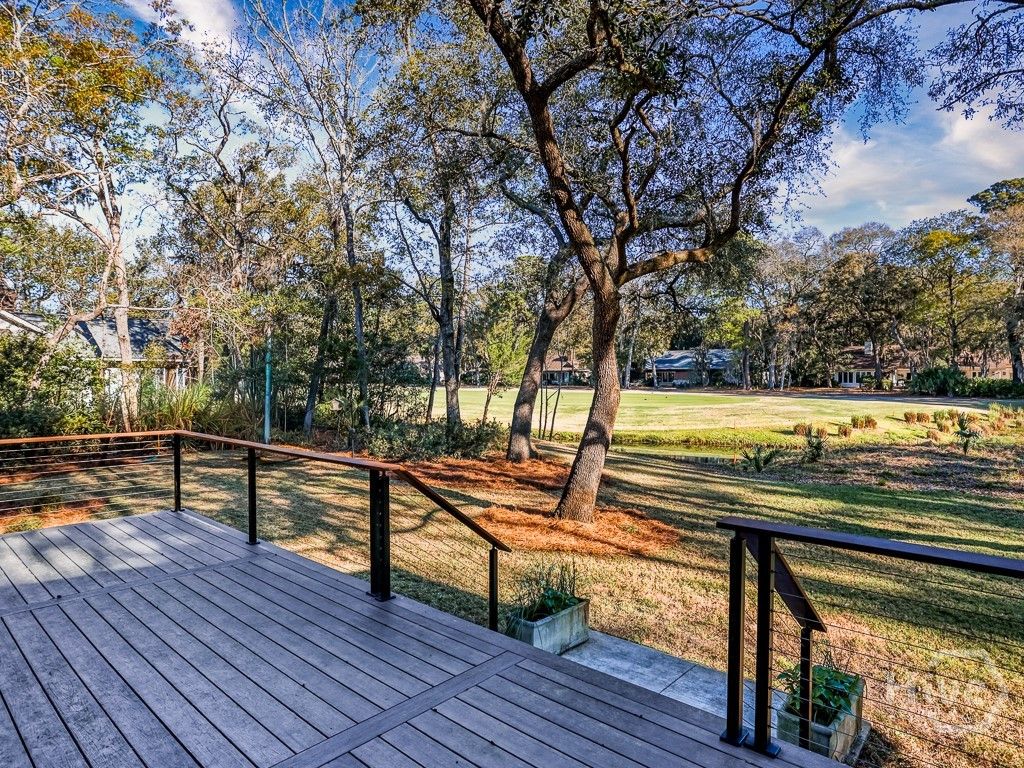 Double lot premium, move-in ready Landings home recently remodeled by Josh Waters Building & Design. The residence sits on over a half-acre of John Glenn landscaped property with quiet views of #2 Terrapin Point tee box & lagoon. A Monaco paved driveway circles the entry to an art deco homesite surrounded by ancient live oaks. The floorplan features heart pine floors throughout a renovated main level with new kitchen & wet bar, laundry room, powder room, guest bedroom with full size bath + an oversized primary suite with its own ensuite bathroom. Kitchen highlights include ceiling height backsplash tile, 48” Fulgor gas range, warming oven, Monogram refrigerator, marble & red oak tops & custom cabinetry; ensuite highlights include walk-in steam shower, standalone tub, Marsh brand double vanity and walk-in closet with quartzite topped island. 2 additional ensuite bedrooms upstairs complete the floor plan. A sunroom and 2 Timbertech laced porches (covered & non) extend hospitality space with views. All major home maintenance (roof, HVAC, 2 tankless gas water heaters, encapsulated crawlspace, paint) and bonuses (landscape lighting, irrigation, well) are new. Within the gated Landings community, the location provides daily lifestyle opportunities: 5 minute golf cart ride to Palmetto club for dining & club sports or to Delegal Marina and the iconic Intercoastal Waterways.