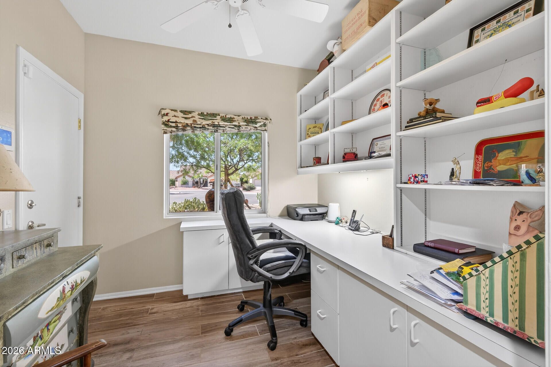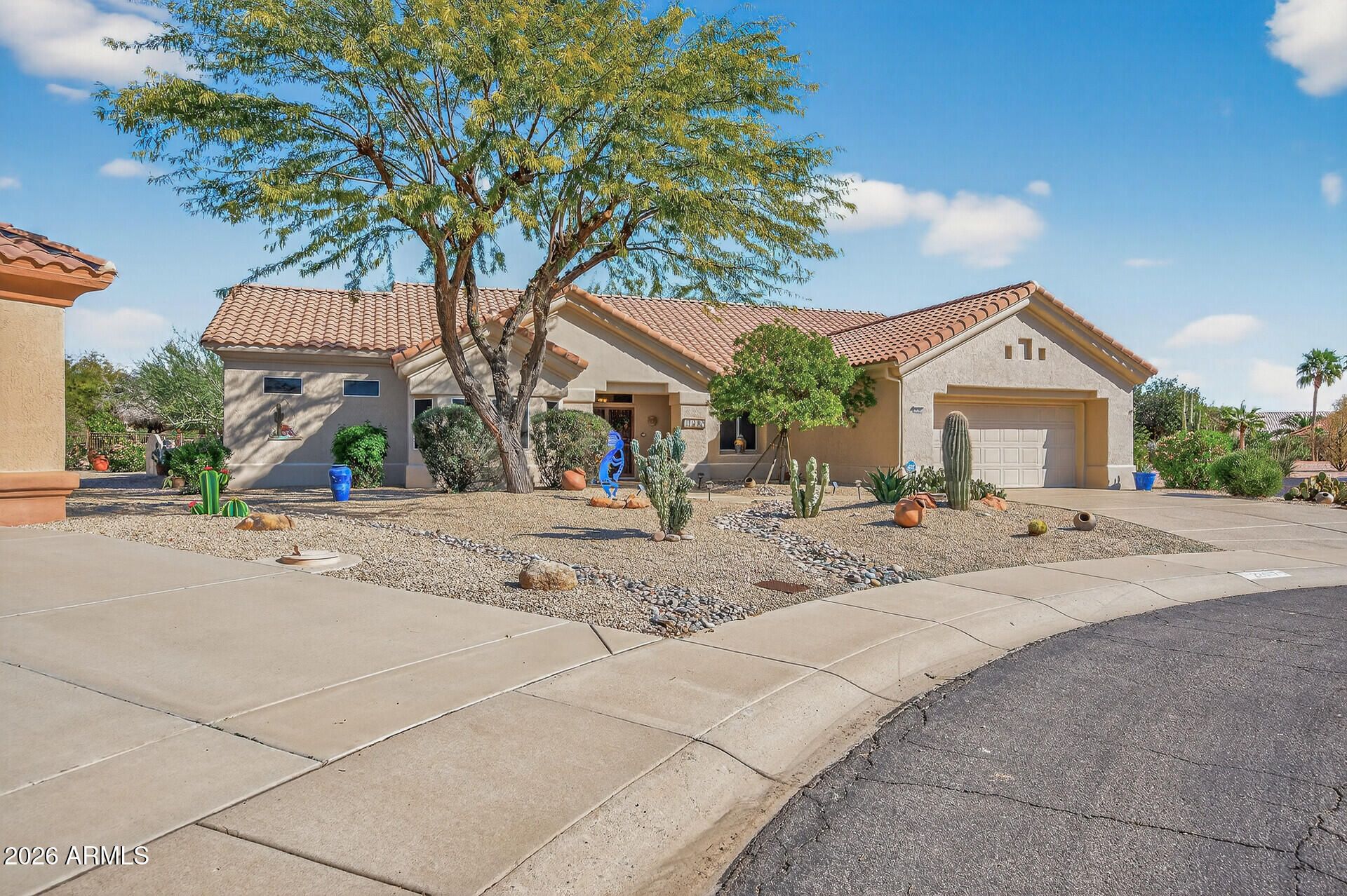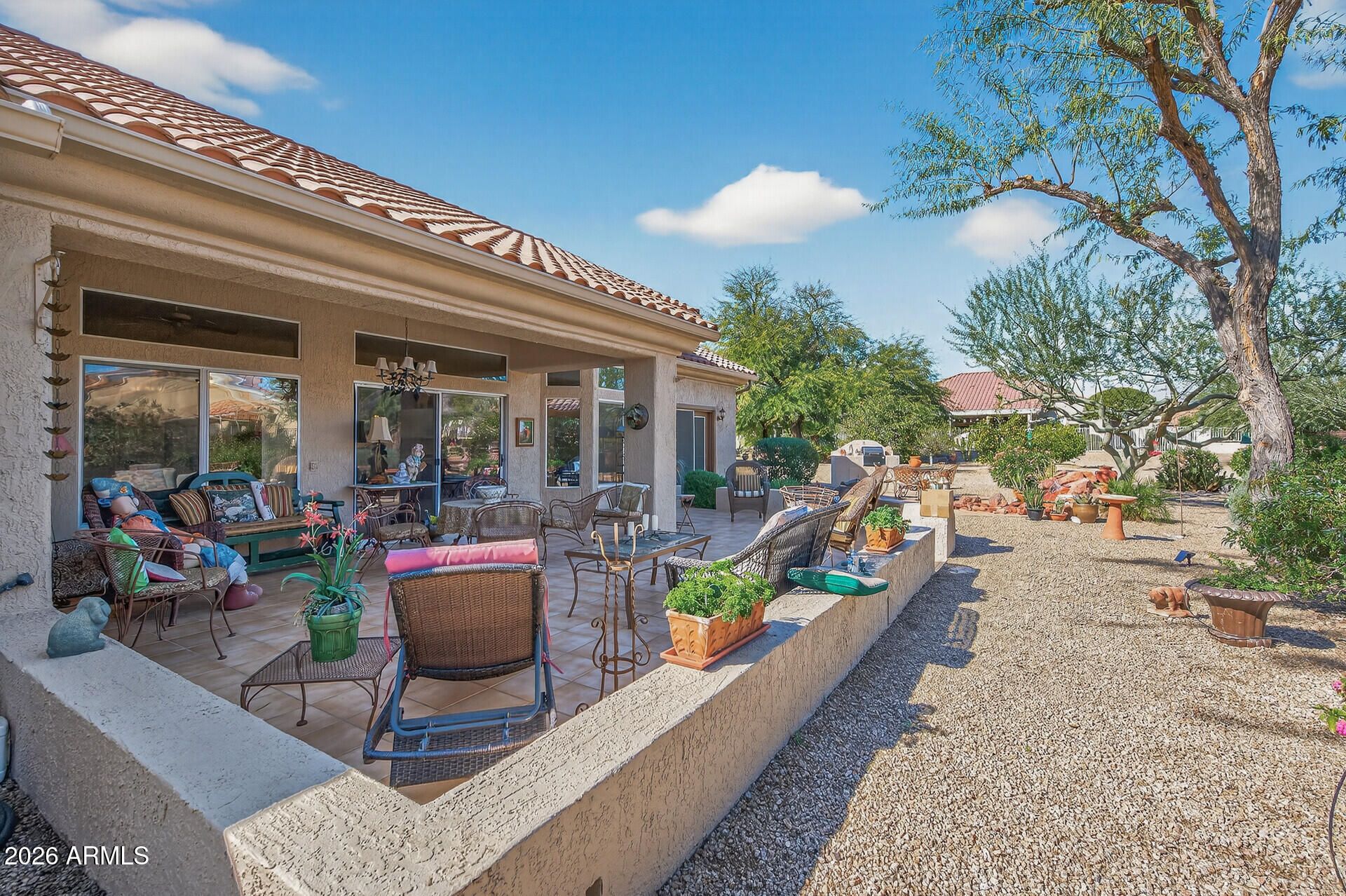 Beautifully maintained Chandler model on an exceptional cul-de-sac lot—nearly 1/3 acre! Original owners added a stunning 378 sq ft family room, creating wonderful space for everyday living and entertaining. The expansive backyard is an entertainer's dream with three patios, built-in grill, soothing fountain, and mature trees and flowering plants that bloom each spring. An inviting kitchen features a breakfast nook, gas range, two pantries and abundant storage. Private office included. Primary suite offers a bay window, dual closets including a walk-in, and spacious bath with granite counters. Guest bath also features granite. Whole-house soft water system and new HVAC in 2023. Lovingly cared for, and offering space, privacy, and the best of 55+ resort-style living in Sun City West, AZ!