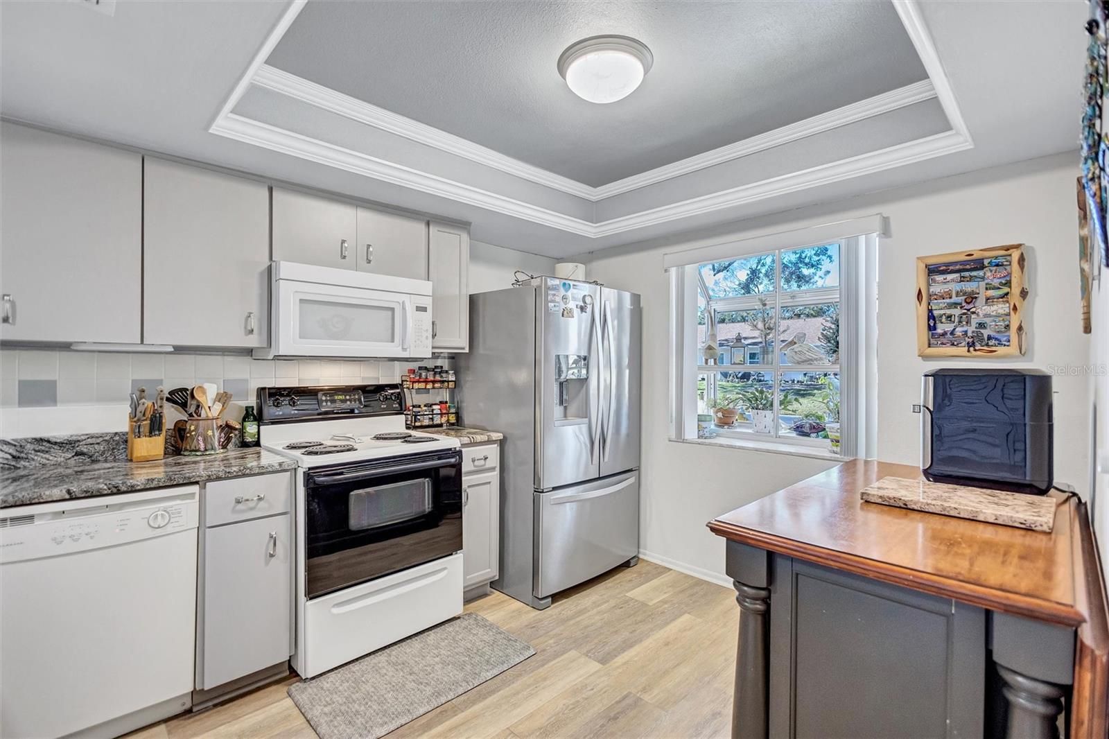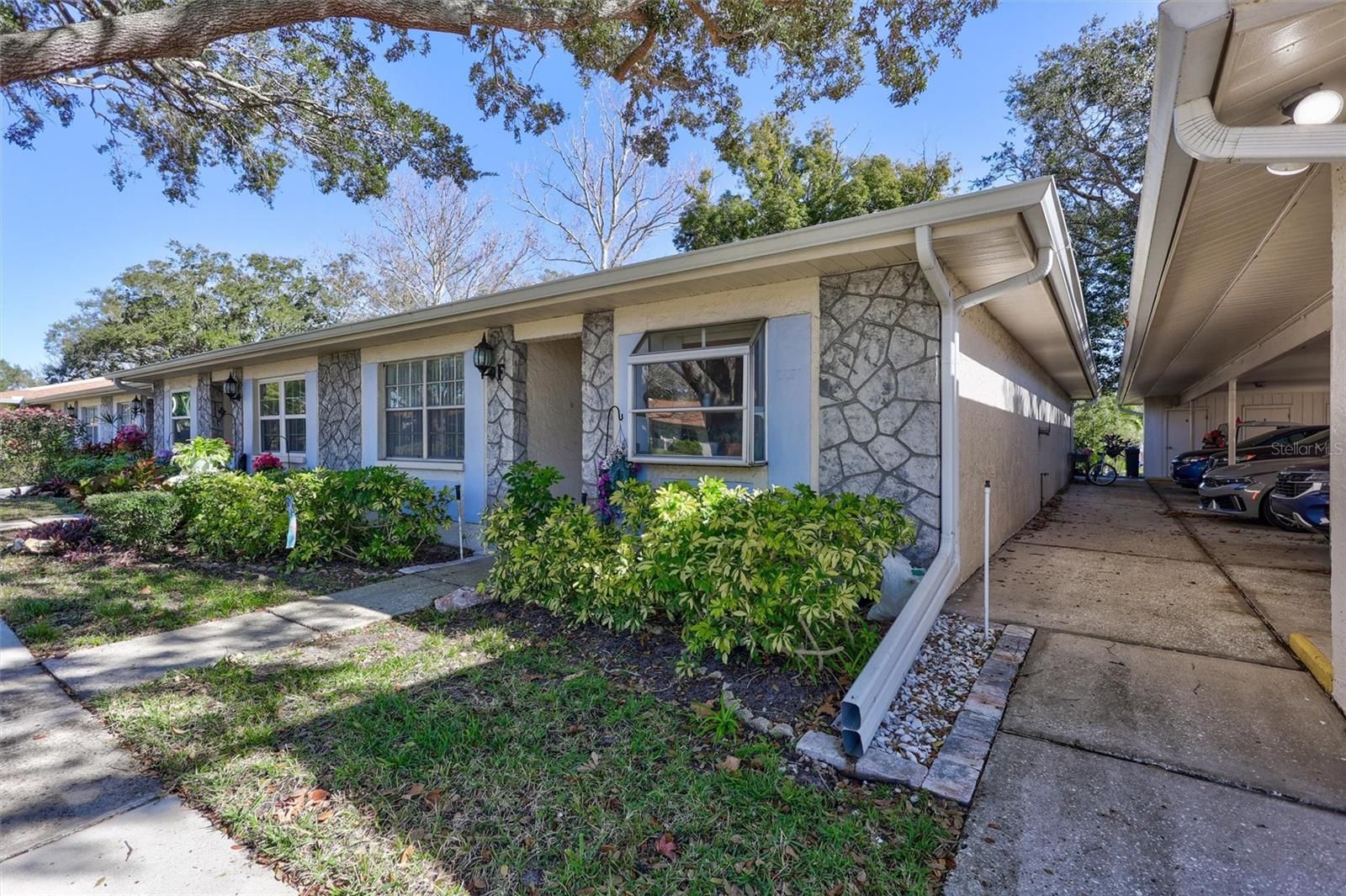 This end unit villa is right next to the covered carport and storage shed. A/C and hot water heater new in 2025, roof new 2024. It's move in ready with luxury vinyl wood plank flooring, fresh interior paint throughout, and all the appliances. Washer and dryer, are included. You will love the floorplan! Sunny kitchen with granite countertops and deep kitchen sink, pull out racks in the cabinets , pantry closet, & serving counter through to the oversize combined living & dining room space. 2nd bedroom in the front adjacent to the guest bathroom. The spacious master suite is at the back on the home. The master features a walk-in plus a double closet, as well as a suite big enough for two with dual vanity and step-in shower. Great natural light throughout including a skylight in the great room. The sunroom is next to the living area and opens out to a patio and with new pavers, new hurricane windows, private walkway to the carport. Gutters have leaf builders over both front and back. Highland Lakes is Palm Harbor`s premier 55+ community! The HOA fee includes free golf on 3 courses, heated pools & spa, tennis, pickleball & more sports, arts & crafts, entertainment & social events, Lake Tarpon amenities, hobby & interest groups, professional management, and more. Enjoy living within minutes of Gulf coast beaches, parks & trails, a loads of restaurants & shopping.
