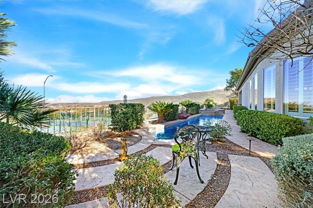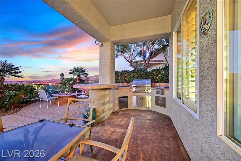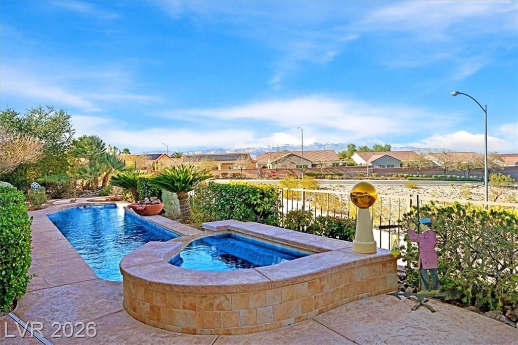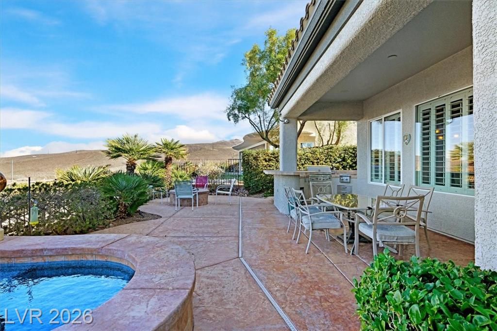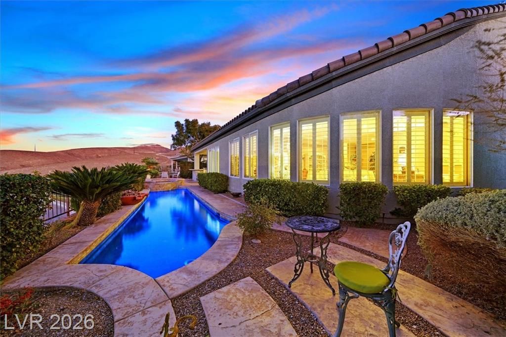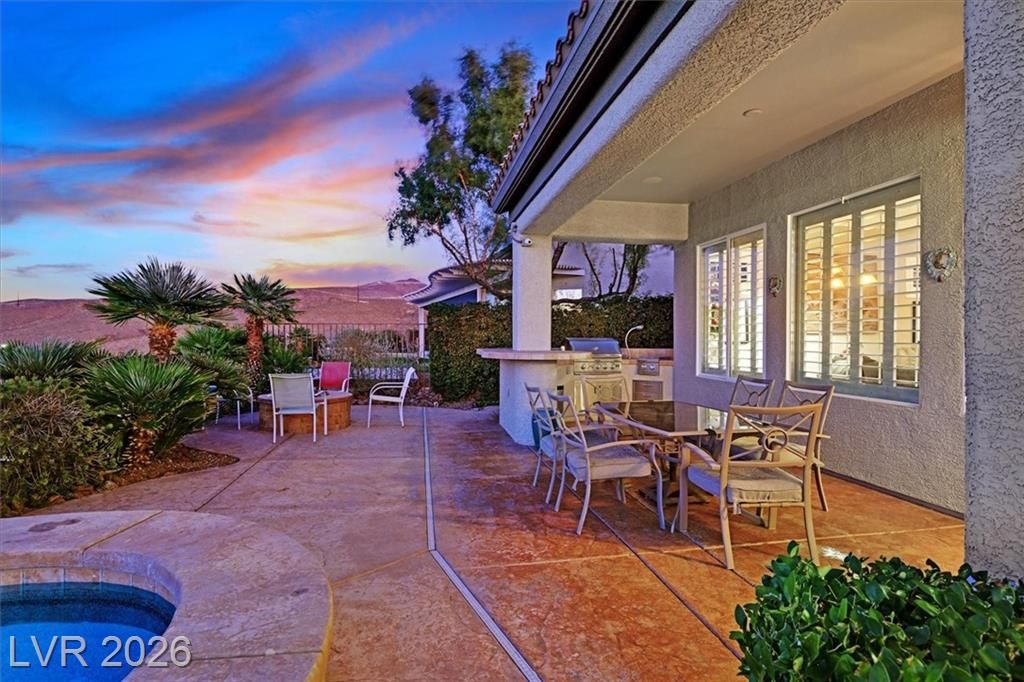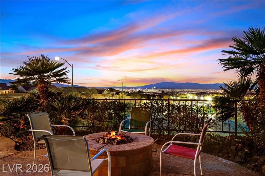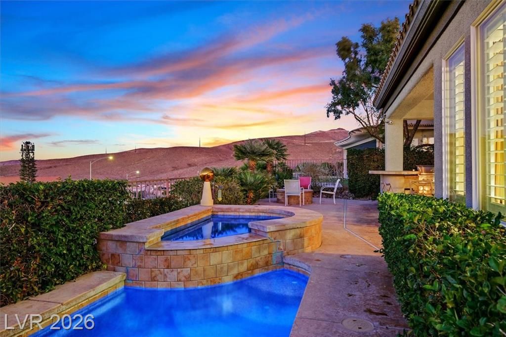This lovely, 4-bedroom Charleston model with STRIP & mtn views should definitely be on your must see list! A wonderful vacation home for the current owners which may be sold furnished and fully equipped at no additional cost for the next owners! Your spacious indoor kitchen is equipped with granite, stainless appliances along with tile flooring and shutters throughout! Come and see the stunning STRIP view at sunset!! You could watch the strip from your heated pool or spa, or while having a late night snack in your kitchen nook! If you choose, view the STRIP from your North facing covered patio, and cook steaks on your outdoor BBQ Kitchen! Wherever you catch the view, you will be glad you can call this wonderful house a HOME!