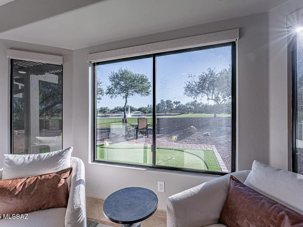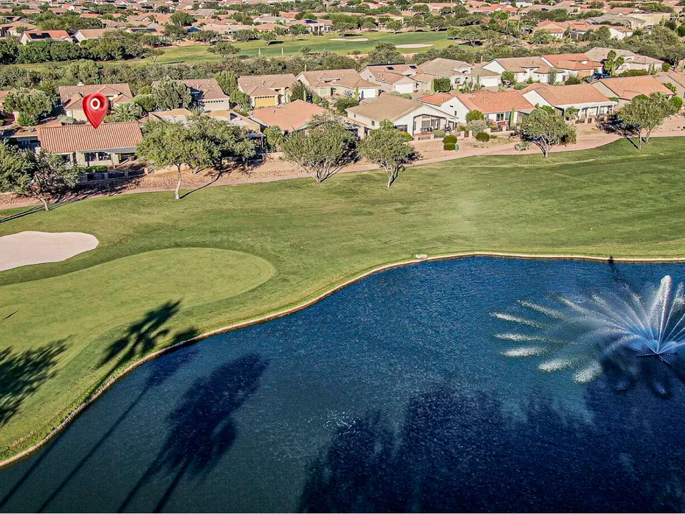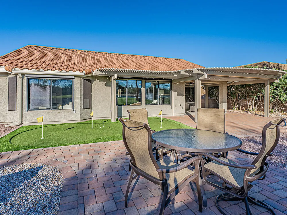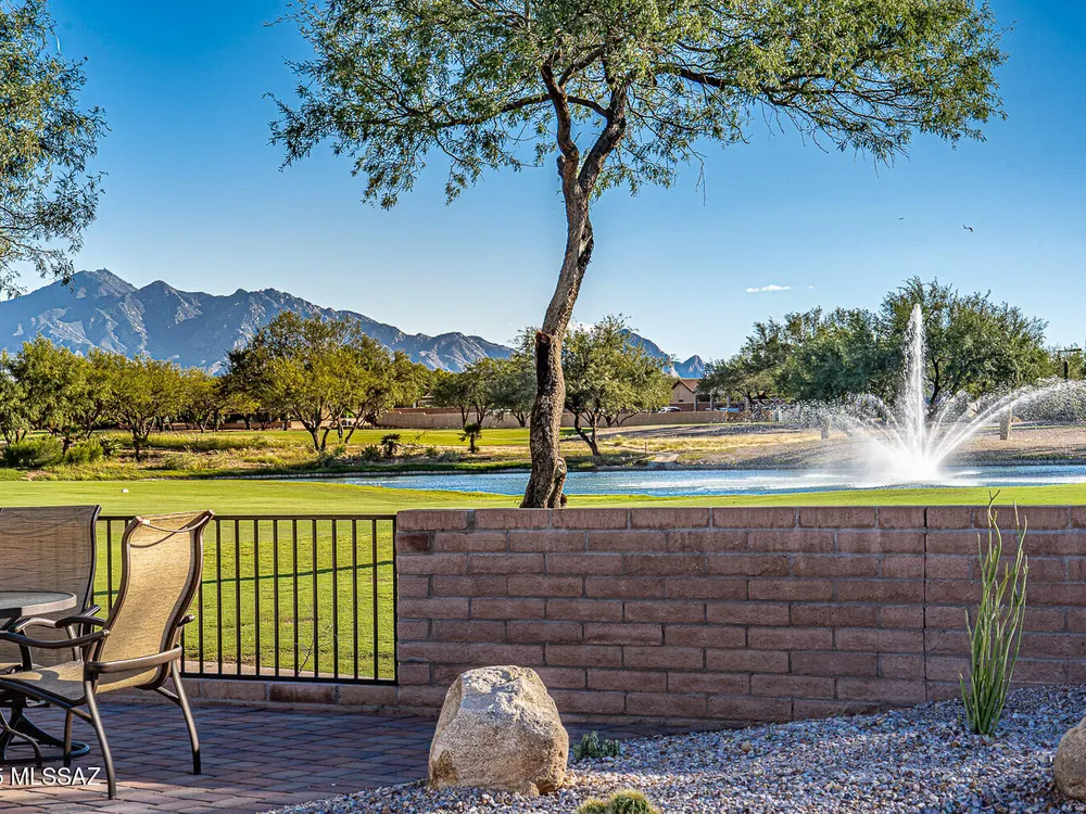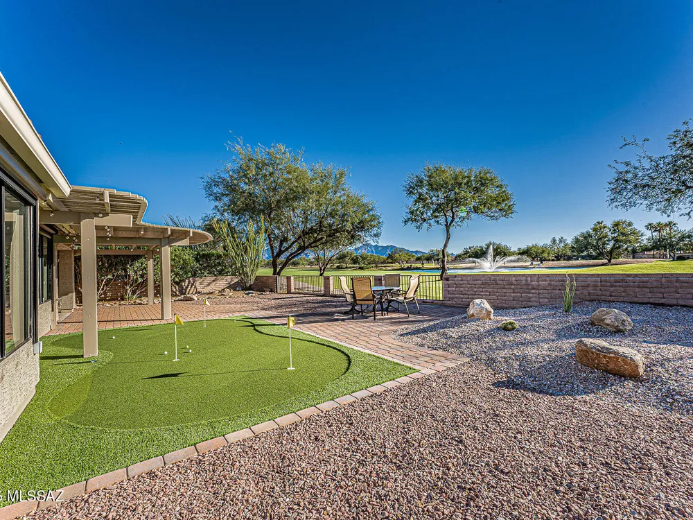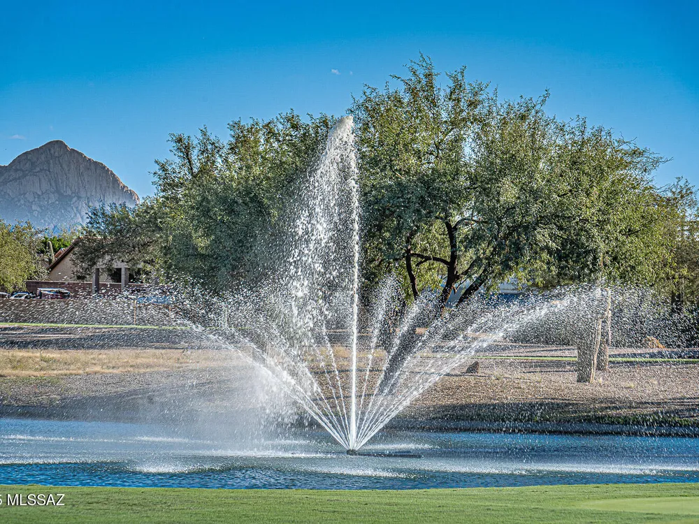 Fabulous views of mountains behind the golf course with the fountain, in the forefront, spraying plumes of water! You will find a covered and screened patio with electric screens as well as a paved patio area for outdoor dining while taking in the amazing vistas. Walking inside this beauty you will see upgrades throughout and all high-end, tastefully executed! From the unique tile floors, quartz countertops to the electric sunscreens on living room, main bedroom and den to the Putting green in the backyard, this home was designed for easy, pleasant living! A must see and then make this yours!