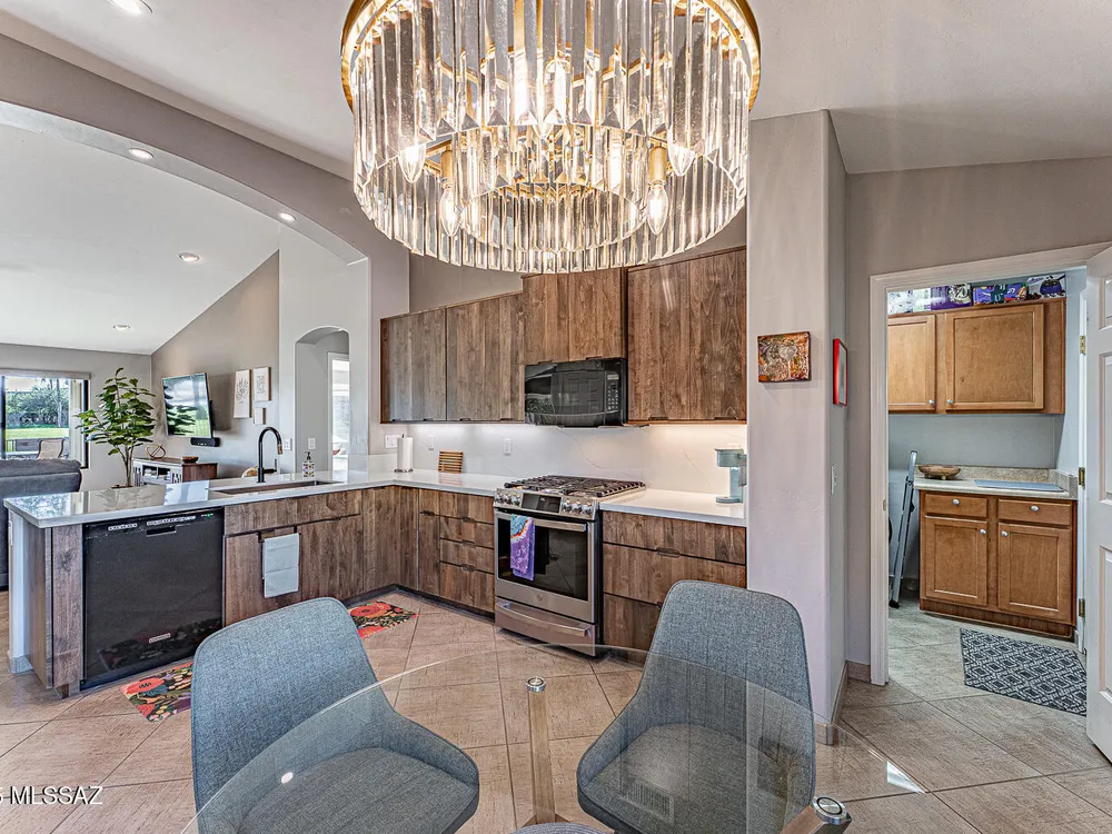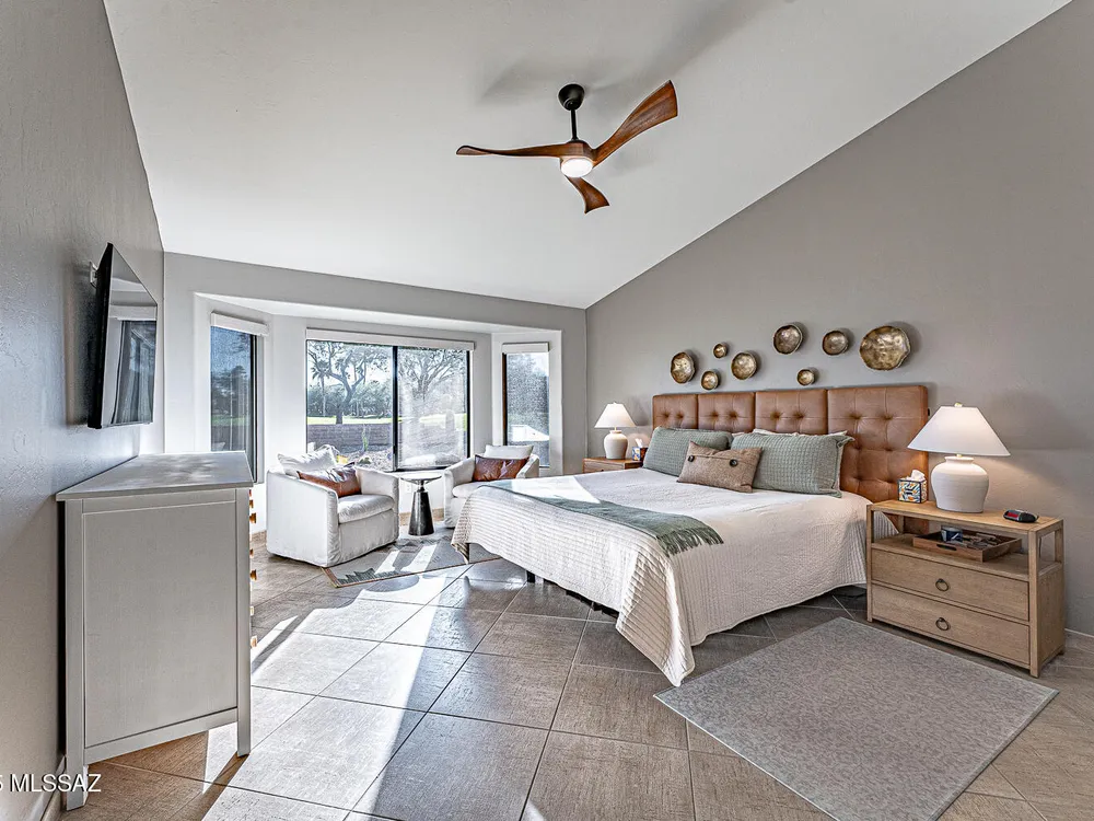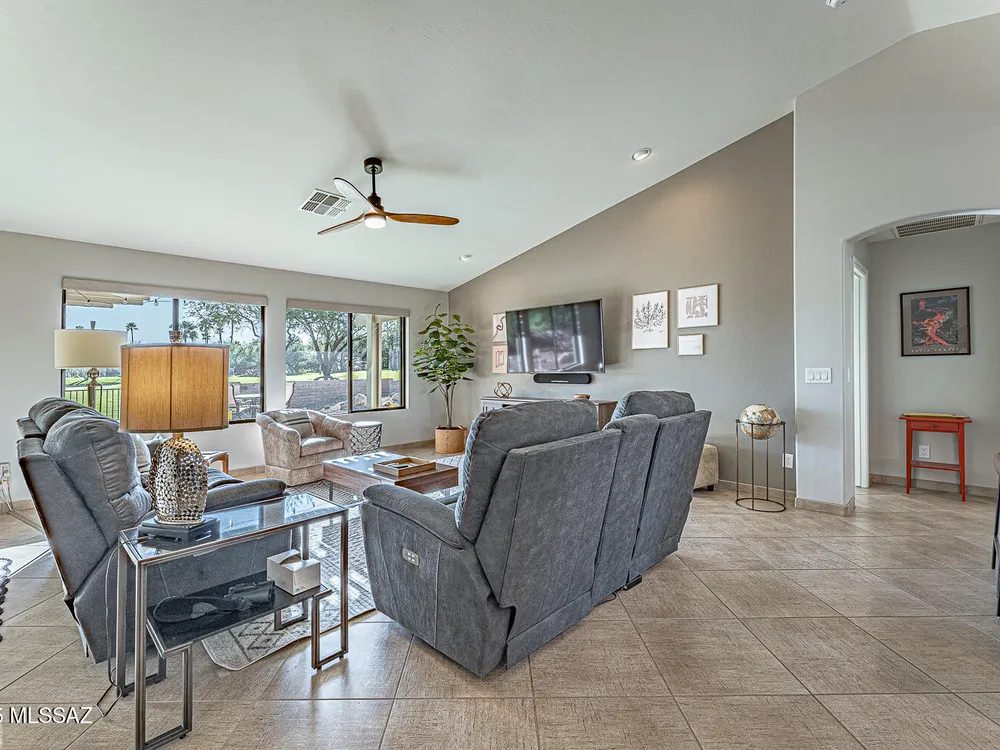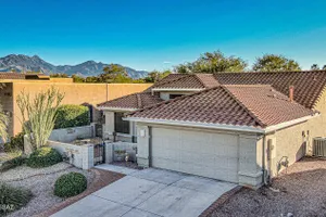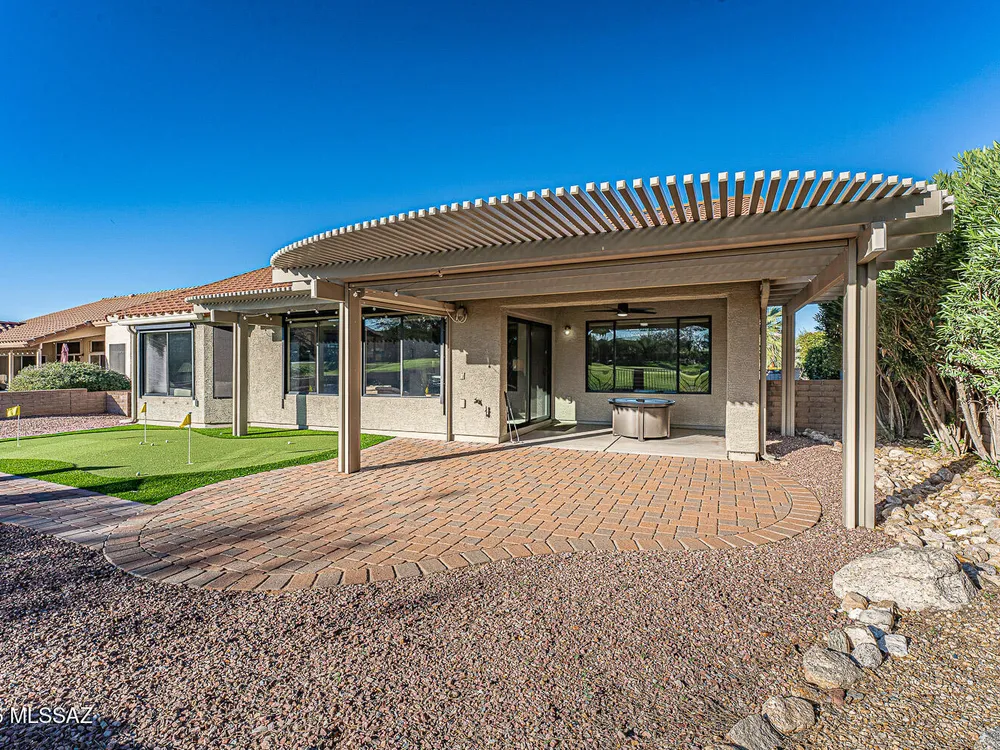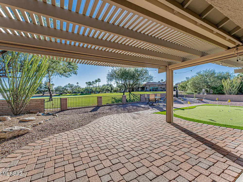 Fabulous views of mountains behind the golf course with the fountain, in the forefront, spraying plumes of water! You will find a covered and screened patio with electric screens as well as a paved patio area for outdoor dining while taking in the amazing vistas. Walking inside this beauty you will see upgrades throughout and all high-end, tastefully executed! From the unique tile floors, quartz countertops to the electric sunscreens on living room, main bedroom and den to the Putting green in the backyard, this home was designed for easy, pleasant living! A must see and then make this yours!