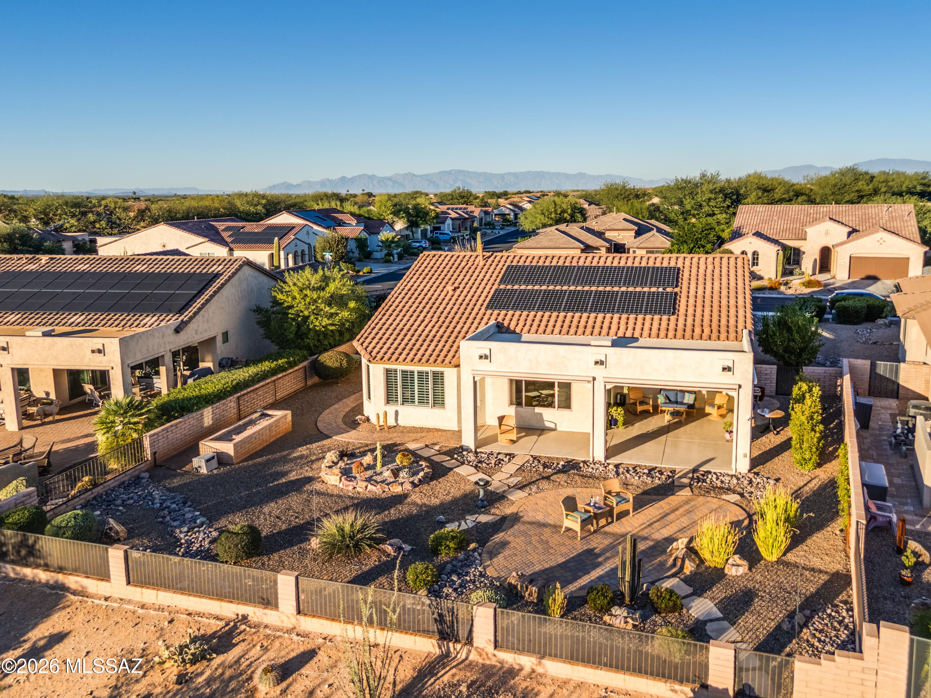 ****$15,000 price adjustment****Welcome to your dream oasis, where majestic mountains frame your life, offering breathtaking sunrise and sunset vistas from a coveted lot. This exquisite property features owned solar panels and an expansive patio, ideal for savoring the stunning surroundings and observing local wildlife. Inside, the thoughtful split floor plan boasts two spacious bedrooms, including a luxurious master suite with an ensuite bathroom and a generous walk-in closet. Designed for optimal flow, a conveniently located powder room near the den, kitchen, and great room enhances functionality. The open-concept great room, dining area, and kitchen bathe in natural light and offer views from every room.
