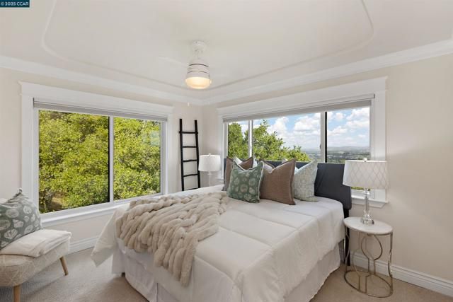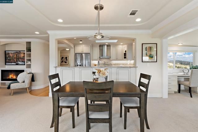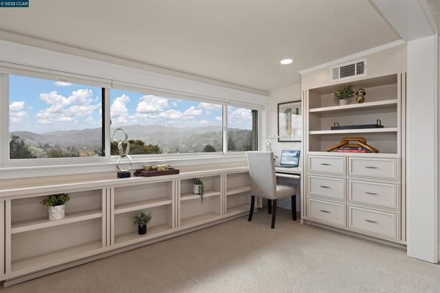 Best View in Rossmoor! Experience refined living with panoramic views of Mt. Diablo, the rolling hills of Rossmoor & downtown Walnut Creek from this extensively remodeled 2-bedroom, 2-bath home in Rossmoor’s 55+ community. Step inside to beautiful wood floors in the entry and kitchen, complemented by skylights, recessed lighting, and dual-pane windows that fill the home with natural light. The open-concept kitchen is designed for both entertaining and everyday living, featuring custom cabinetry, stone counters, stainless steel appliances, under-cabinet lighting, and windowed upper cabinets that flow seamlessly into the dining area. The living space is anchored by a cozy electric fireplace with elegant built-in cabinetry, while a versatile enclosed room offers the perfect spot with built-in office or hobby space. The spa-inspired primary bath showcases tile flooring and a large stall shower, while the second bath includes tile flooring and a walk-in jetted tub/shower for relaxation. Additional highlights include luxury vinyl plank flooring, plush new carpet, a conveniently located carport, and an extra storage unit. Enjoy Rossmoor’s vibrant gated lifestyle with golf, tennis, pickleball, bocce, hiking, fitness center, theater, dog park, hobby rooms, and 200+ clubs.