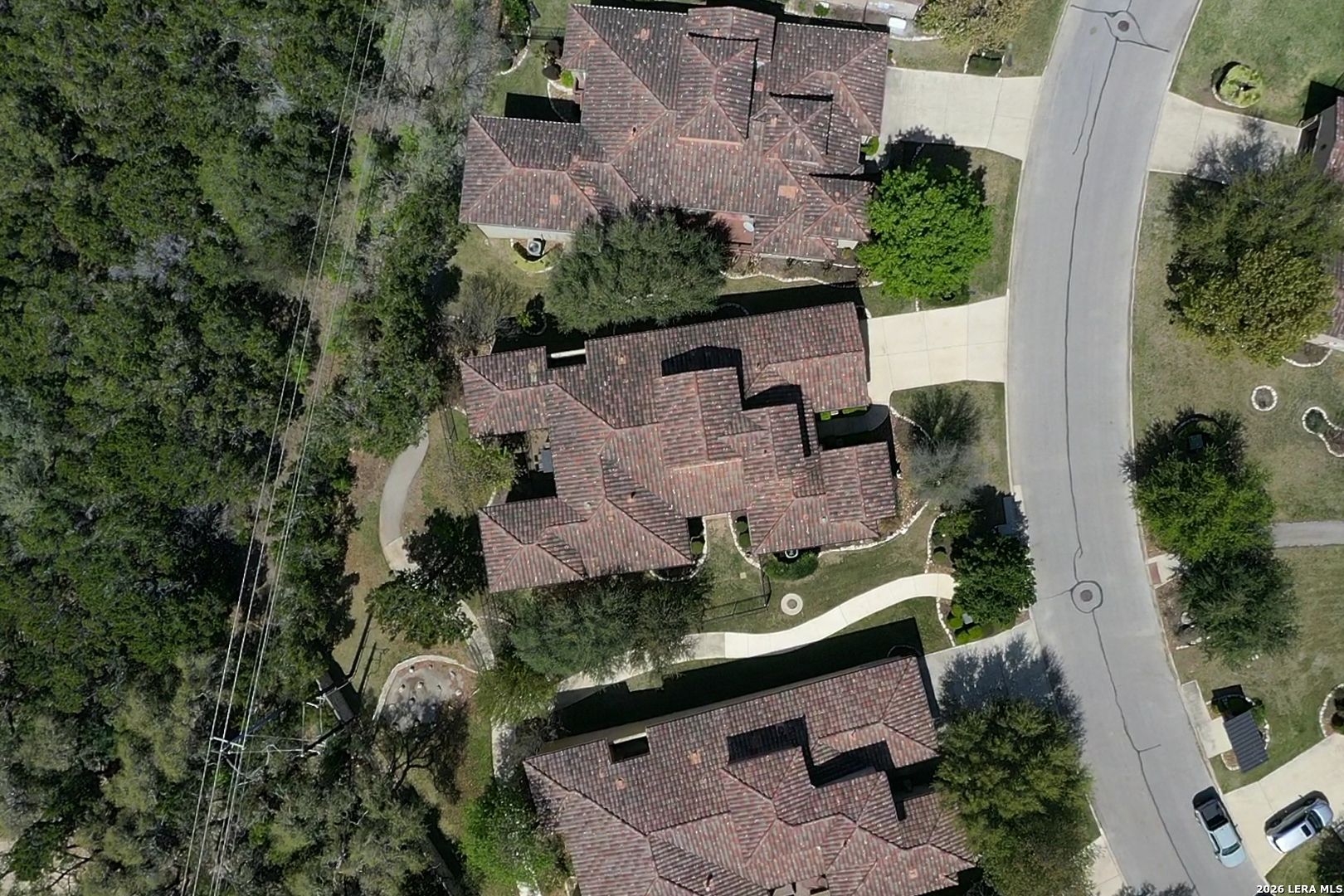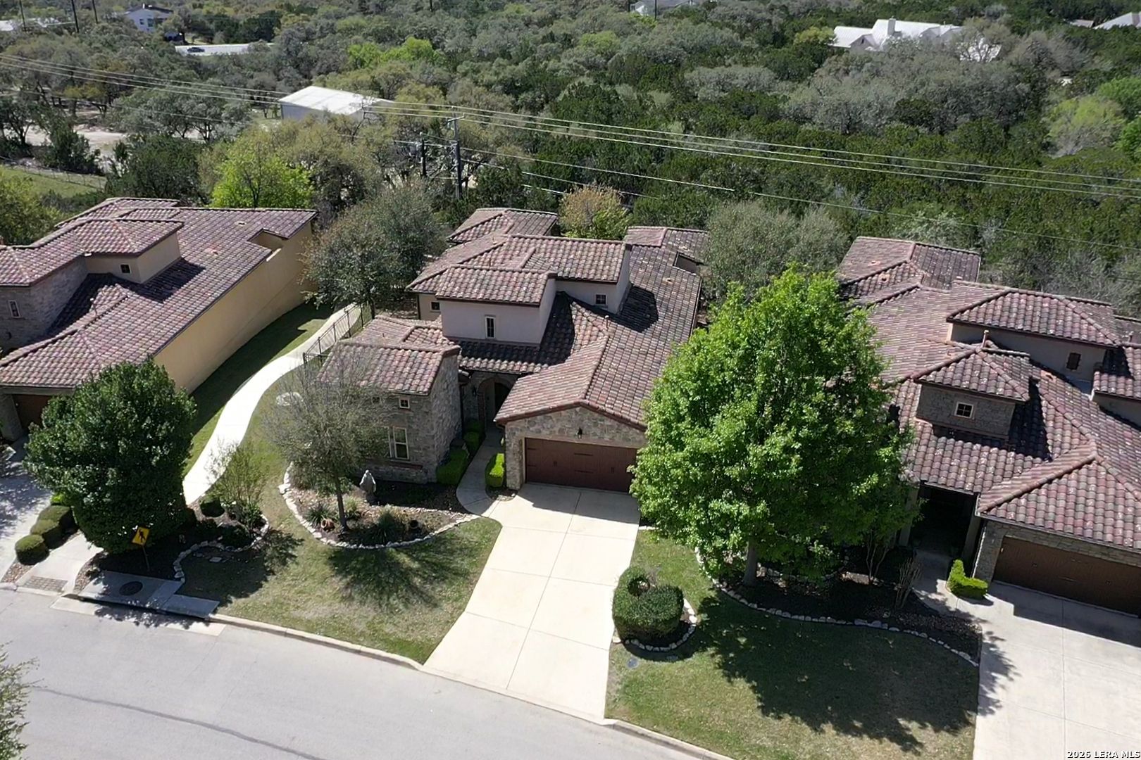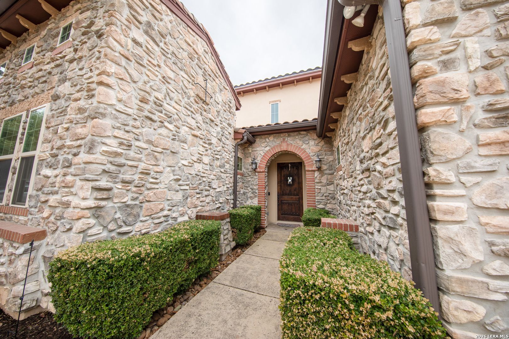 Located in the gated Campanas section of the Cibolo Canyons Resort Community, this beautifully maintained one-story Mediterranean-style home by Sitterle Homes backs to a peaceful greenbelt and offers elegant, low-maintenance living. The home welcomes you with 18-foot ceilings, arched architectural details, and abundant natural light that create an open and inviting atmosphere. Interior finishes include ceramic tile and wood flooring, granite countertops, custom cabinetry, and decorative iron accents throughout. Designed for both everyday comfort and entertaining, the chef's kitchen features stainless steel appliances, built-in double ovens, a wine refrigerator, and generous workspace. Enjoy outdoor living with three separate spaces including an elevated backyard patio with storage below, a private garden retreat with a stone feature wall, and a spacious covered loggia perfect for relaxing or hosting guests. Additional upgrades include spray foam insulation, custom plantation shutters, built-in 5.1 surround sound in the living room and patio, and a central vacuum system. HOA services include alarm monitoring, lawn care, and landscape maintenance, making this ideal for lock-and-leave living. Residents enjoy access to the 9,000+ sq ft Campanas clubhouse featuring a fitness center, resort-style pool, tennis court, pickleball courts, fire pit, ballroom, game room, and library.