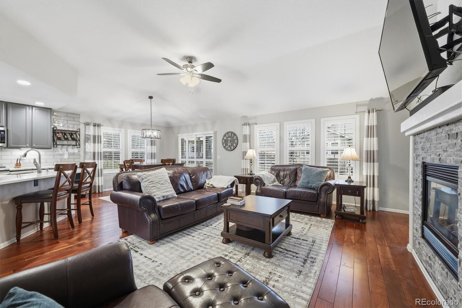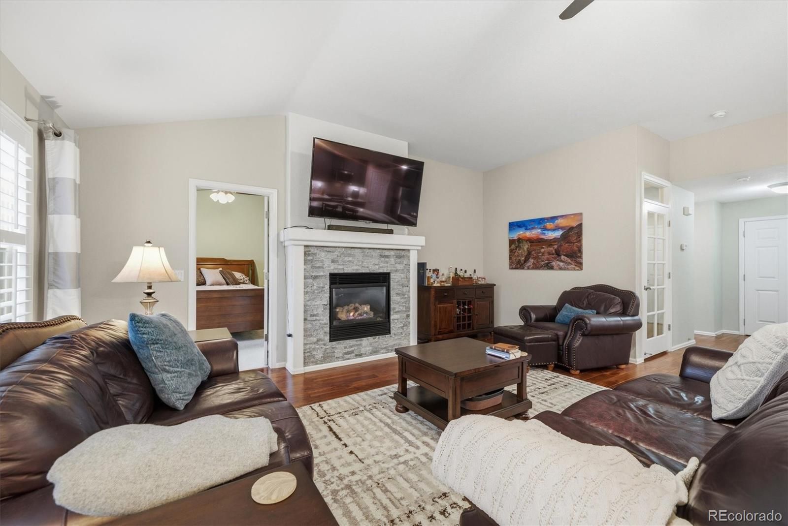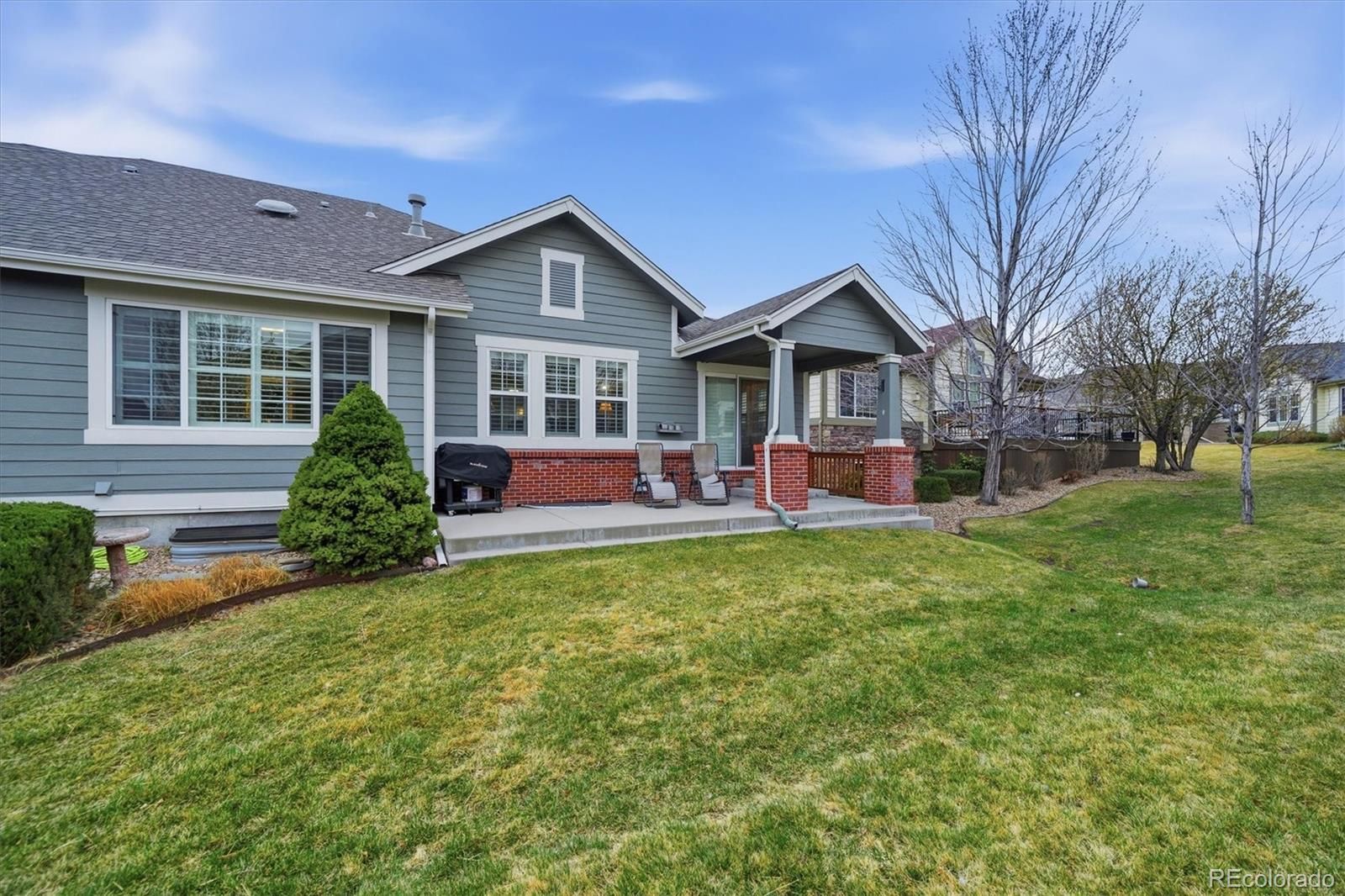 Welcome Home! This meticulously maintained 3 bedroom, 3 bathroom home in the highly sought-after 45+ community of Heritage Eagle Bend offers an open, functional floor plan with vaulted ceilings, wood-plank flooring, plantation shutters, and abundant natural light throughout. A bright den/office on the main level provides the perfect space for working from home or hobbies, while the cozy living room with stone-accented fireplace creates an inviting place to relax or entertain. The spacious kitchen is truly a show stopper, featuring ample cabinetry, quartz countertops, subway tile backsplash, top of the line stainless steel Kitchen Aid appliances, pantry, and a large center island with breakfast bar, ideal for everyday living and gatherings. The main-level primary suite offers a walk-in closet and private bath, providing comfort and convenience. The finished basement expands your living space with a large family room, wet bar, full bathroom, additional bedroom, and an oversized bonus/craft room—perfect for guests, entertaining, or multi-purpose use. Step outside to the covered patio and enjoy Colorado mornings or evening barbecues in the peaceful backyard setting. Located within walking distance from Heritage Eagle Bend Golf Club, residents enjoy resort-style amenities including the clubhouse, Eagles Nest Restaurant and Lounge, ballroom, meeting rooms, library, billiards, fitness center, indoor pool, sauna, hot tub, and locker rooms. Outdoor amenities include a pool, tennis, pickleball, bocce ball, and of course championship golf. This is low-maintenance, active-adult living at its best—don’t miss this opportunity to own in one of the area’s most desirable communities!
