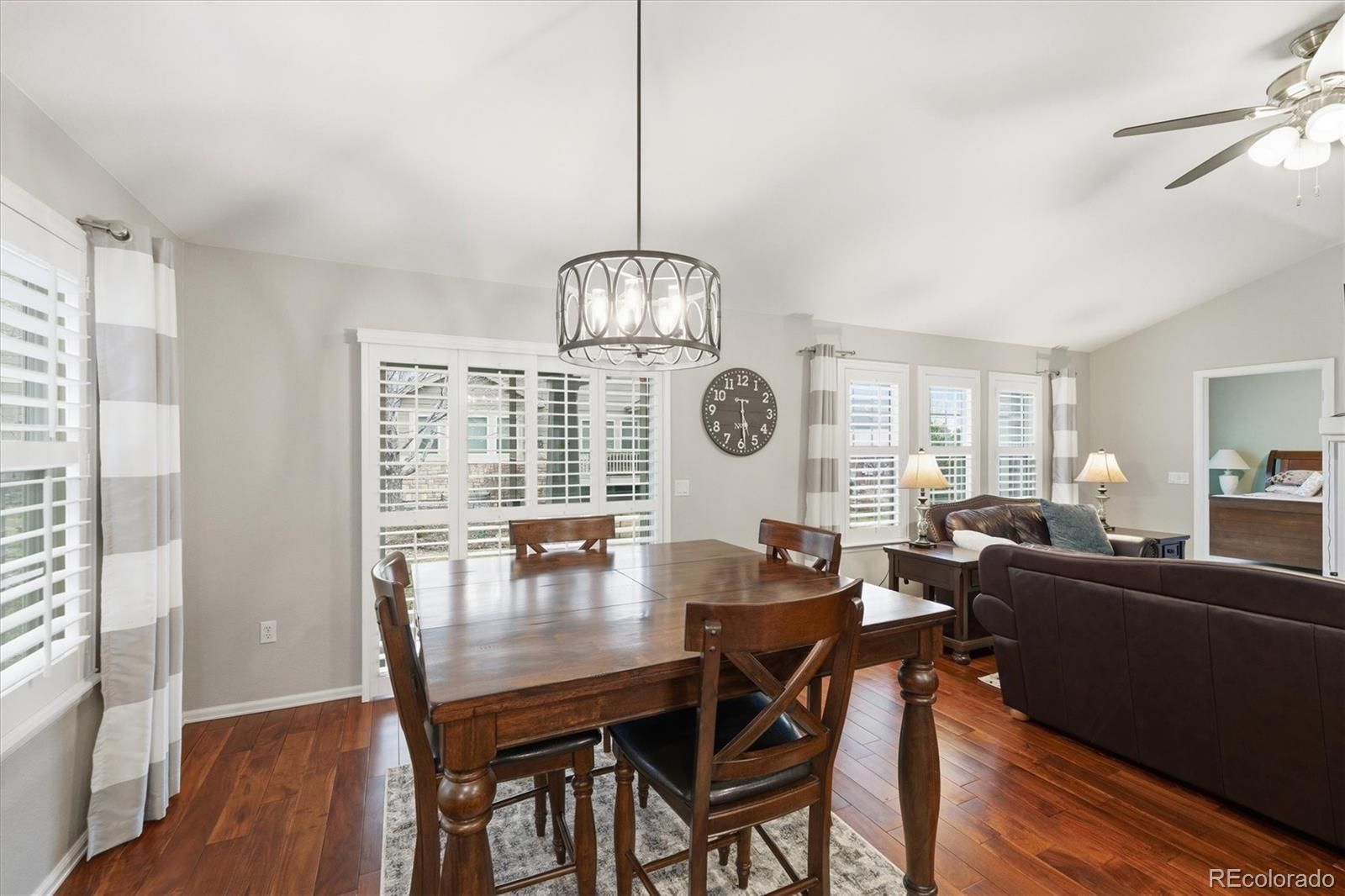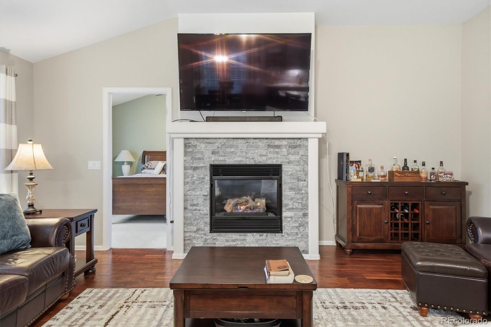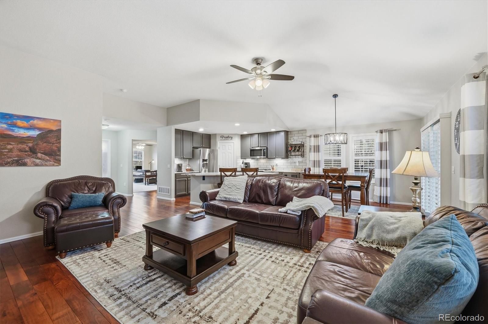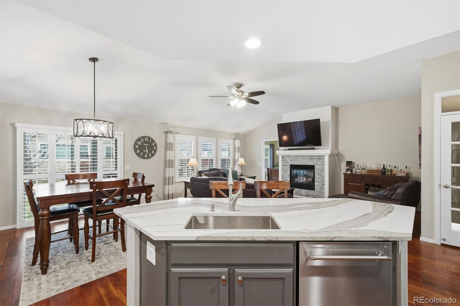 Welcome Home! This meticulously maintained 3 bedroom, 3 bathroom home in the highly sought-after 45+ community of Heritage Eagle Bend offers an open, functional floor plan with vaulted ceilings, wood-plank flooring, plantation shutters, and abundant natural light throughout. A bright den/office on the main level provides the perfect space for working from home or hobbies, while the cozy living room with stone-accented fireplace creates an inviting place to relax or entertain. The spacious kitchen is truly a show stopper, featuring ample cabinetry, quartz countertops, subway tile backsplash, top of the line stainless steel Kitchen Aid appliances, pantry, and a large center island with breakfast bar, ideal for everyday living and gatherings. The main-level primary suite offers a walk-in closet and private bath, providing comfort and convenience. The finished basement expands your living space with a large family room, wet bar, full bathroom, additional bedroom, and an oversized bonus/craft room—perfect for guests, entertaining, or multi-purpose use. Step outside to the covered patio and enjoy Colorado mornings or evening barbecues in the peaceful backyard setting. Located within walking distance from Heritage Eagle Bend Golf Club, residents enjoy resort-style amenities including the clubhouse, Eagles Nest Restaurant and Lounge, ballroom, meeting rooms, library, billiards, fitness center, indoor pool, sauna, hot tub, and locker rooms. Outdoor amenities include a pool, tennis, pickleball, bocce ball, and of course championship golf. This is low-maintenance, active-adult living at its best—don’t miss this opportunity to own in one of the area’s most desirable communities!