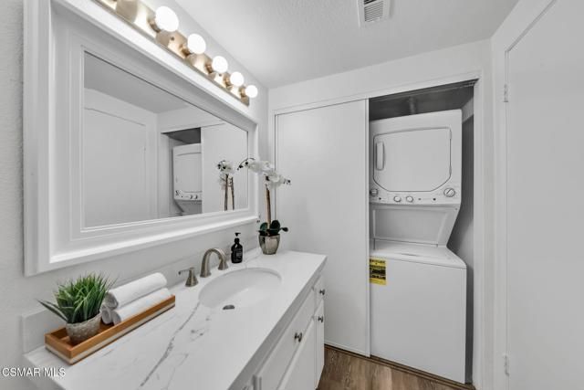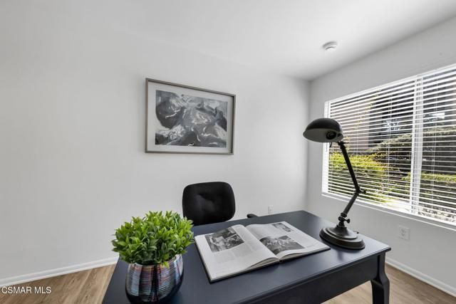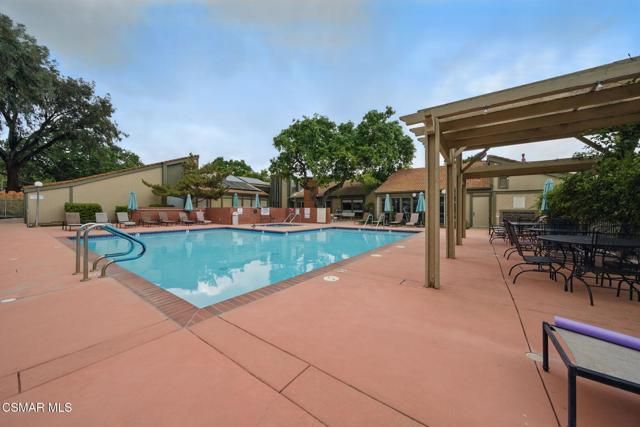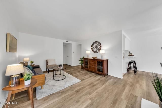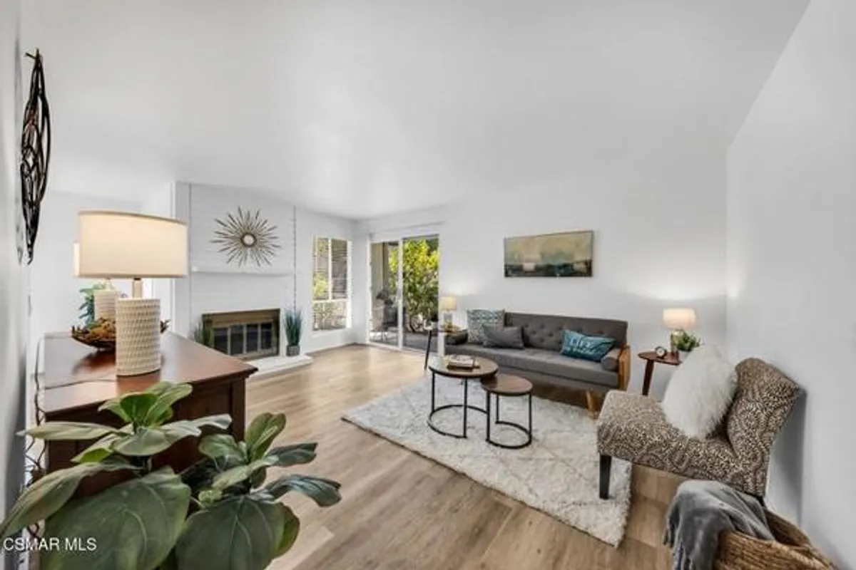 Welcome to this light and bright, single story, ground level, two bedroom, two bathroom home in a prime corner location at Oaknoll Villas, a 55+ owner-occupied, active senior community. This sparkling end unit has new luxury vinyl floors throughout, updated kitchen with quartz counter & bar, updated baths, new paint and steps away from the secret butterfly garden. The living room, filled with an abundance of light, has a fireplace and views to the lush patio area with mature plants, including 2 lemon trees and an orange hibiscus tree. From the living room, there is a separate dining area just off the kitchen. Down the hall, you have the secondary bedroom and bathroom with new quartz counter. At the end of the hall, there's a primary bedroom suite with walk-in closet, updated bathroom with laundry closet, and a large window for plenty of natural light. Features include newer HVAC, newer refrigerator, new dishwasher, and stackable washer & dryer. Oaknoll Villas has wonderful community amenities including pool, spa, clubhouse, gym, billiard room, card room, shuffleboard courts, yoga room, and dog park. The HOA also includes trash, cable/internet, complimentary plumbing service, plenty of guest parking and landscape maintenance. This desirable community is centrally located and close to shops, restaurants, nearby parks, Conejo Valley Botanical Garden, The Oaks Mall and Hillcrest Center for the Arts.