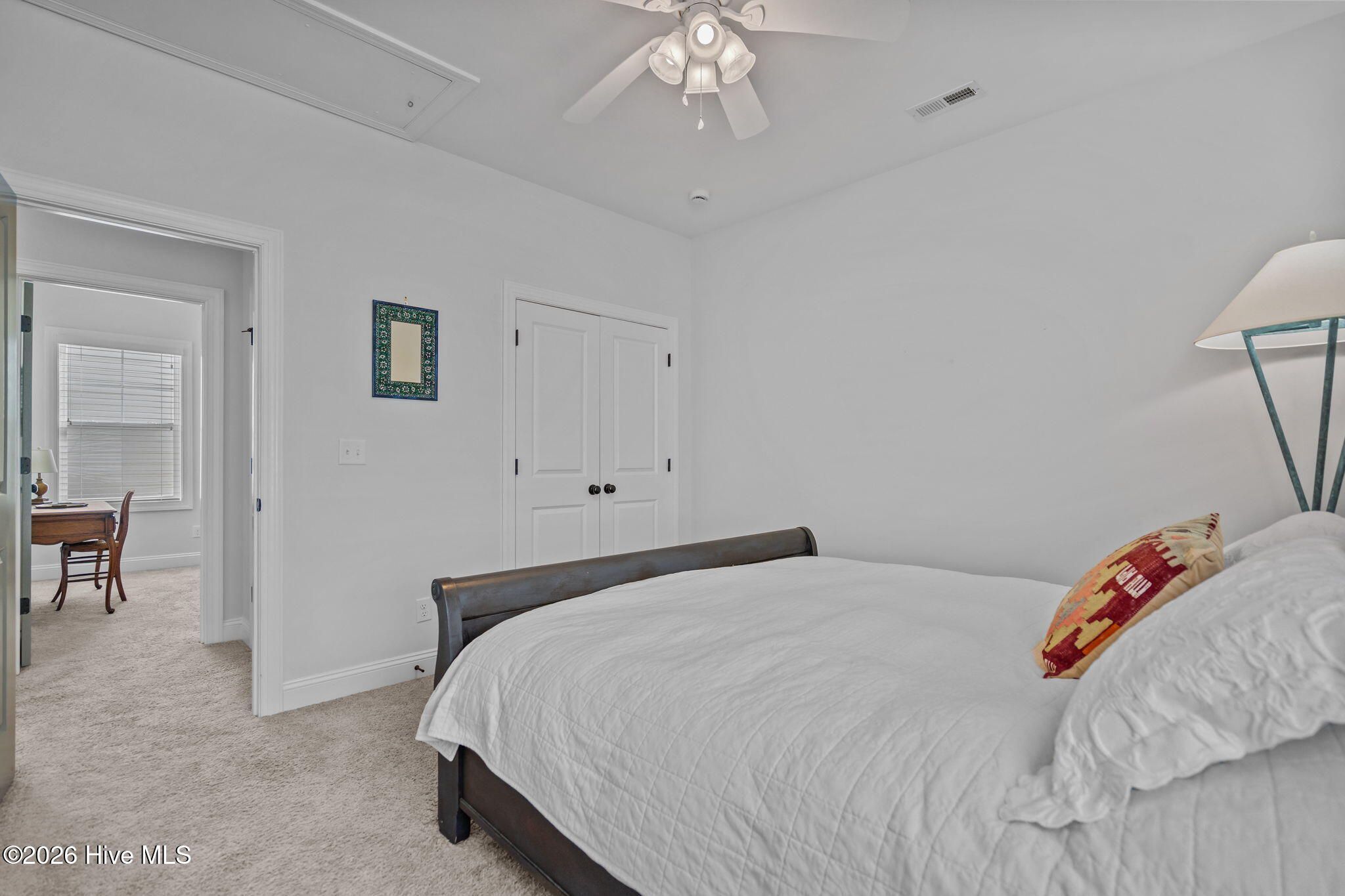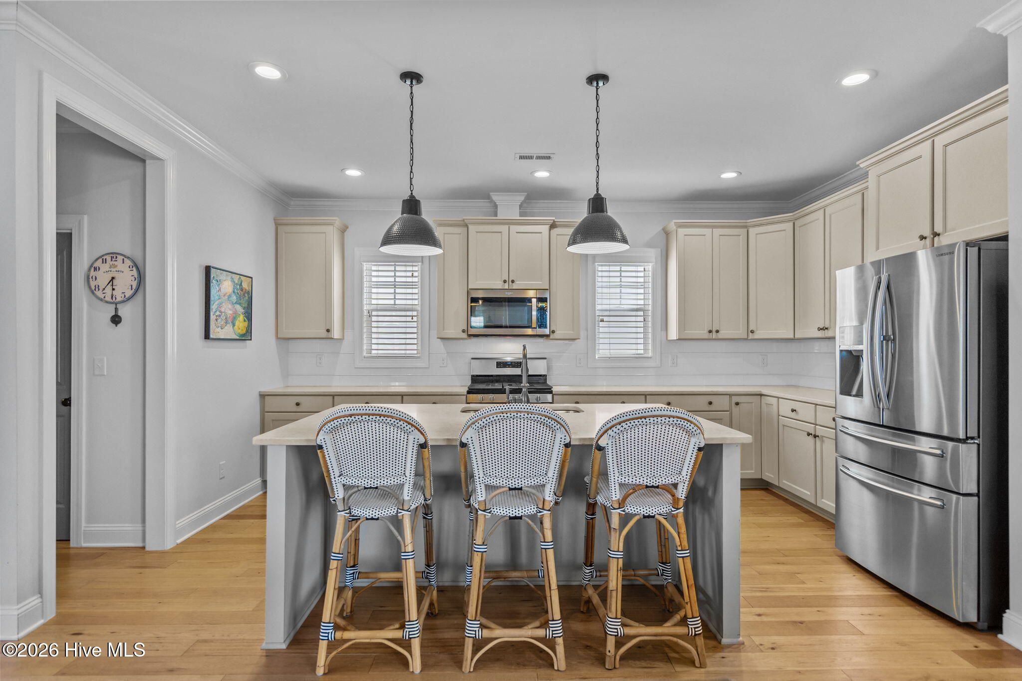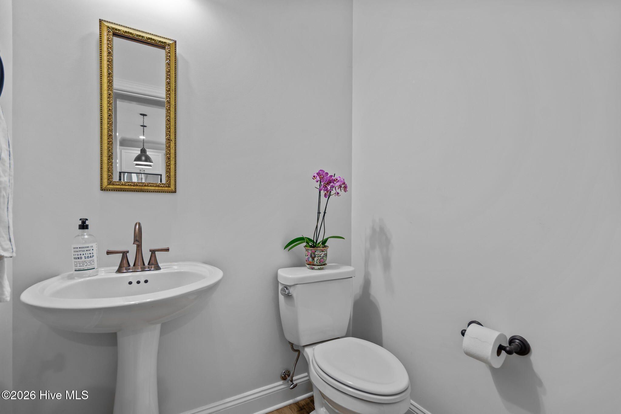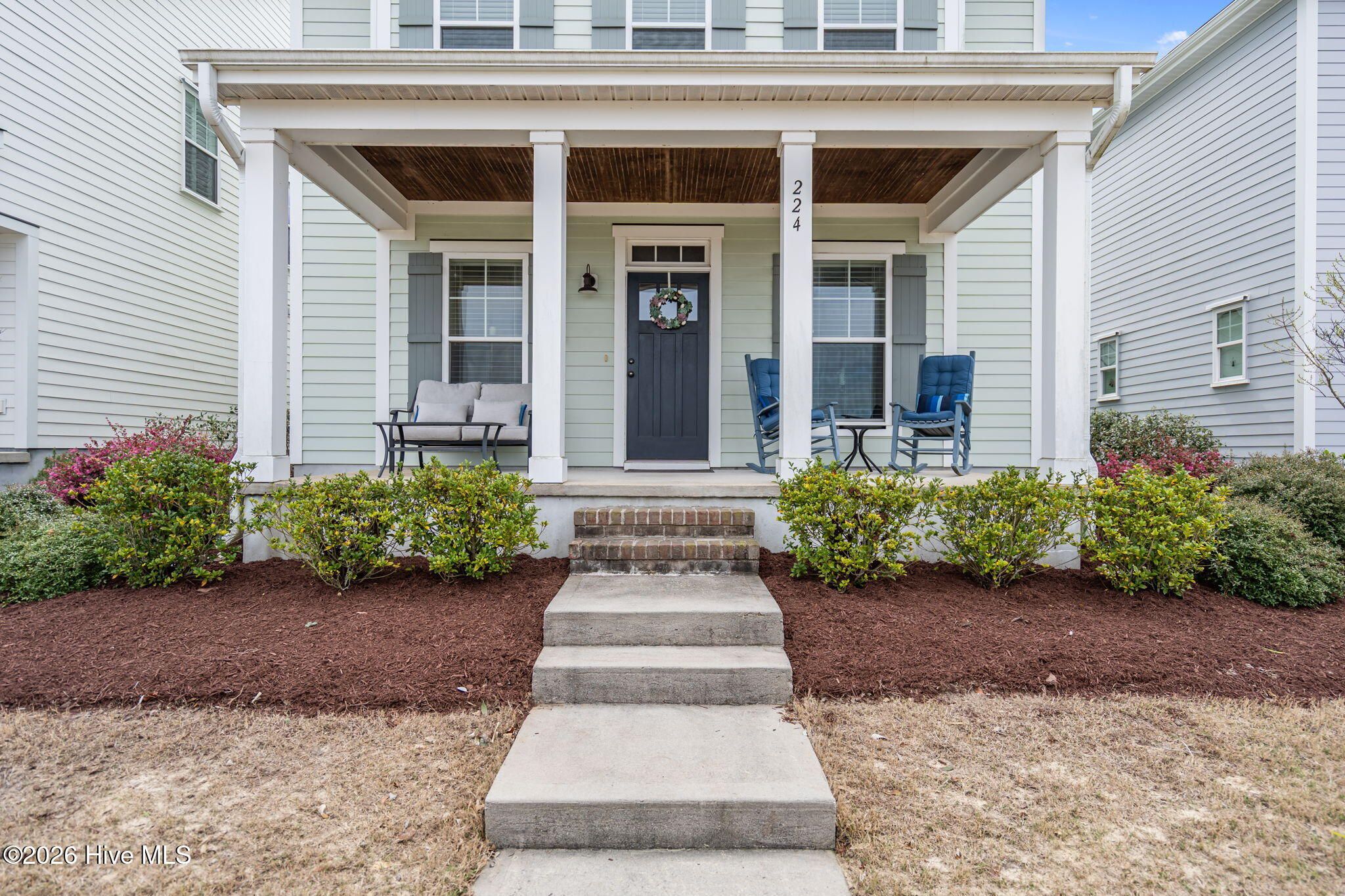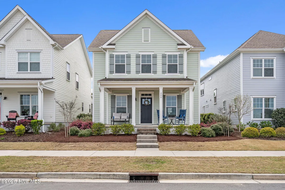 Welcome to 224 Trisail Terrace, where lake views and easy coastal living come together in the heart of Riverlights. Start your mornings or wind down your evenings on the charming rocking chair front porch, perfectly positioned to overlook the water. Step inside to a welcoming foyer that opens into a bright, airy living space designed for both everyday living and entertaining. The formal dining room sits just off the entry, offering beautiful lake views and flowing seamlessly into the living room, complete with a cozy gas fireplace. The kitchen is both functional and inviting, featuring generous counter space, a gas stove, French door refrigerator, and an oversized pantry to keep everything organized. Just off the main living area, a cozy back porch offers the perfect spot to relax, read, or gather with friends. The main level also includes a dedicated office or study, a laundry room, and a convenient half bath. Upstairs, the primary suite is a true retreat where you can wake up to peaceful water views each day. With two closets and a spacious en suite bath featuring a double vanity and a tiled walk-in shower with bench, it's designed for comfort and ease. Two additional bedrooms and a guest bath with double vanity complete the second level. Additional features include a two-car garage, a practical mudroom entry, and an updated Bosch HVAC system with Media Air Cleaner designed to support cleaner indoor air. Living in Riverlights means more than just owning a home, it's a lifestyle. Enjoy access to two pools, two fitness centers, miles of scenic walking and biking trails, pickleball courts, a dog park, playground, and a riverfront pier overlooking the Cape Fear River. All of this, just minutes from beaches, shopping, and dining.