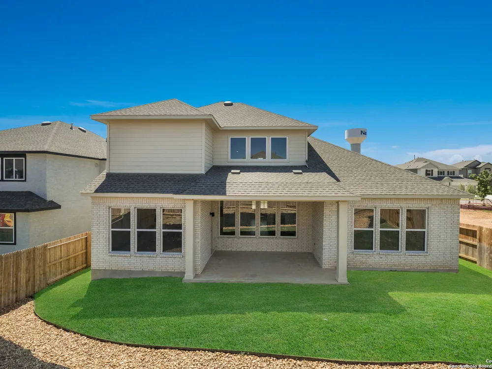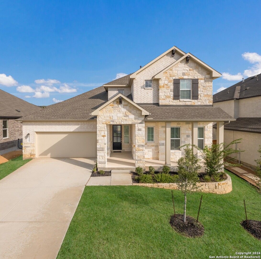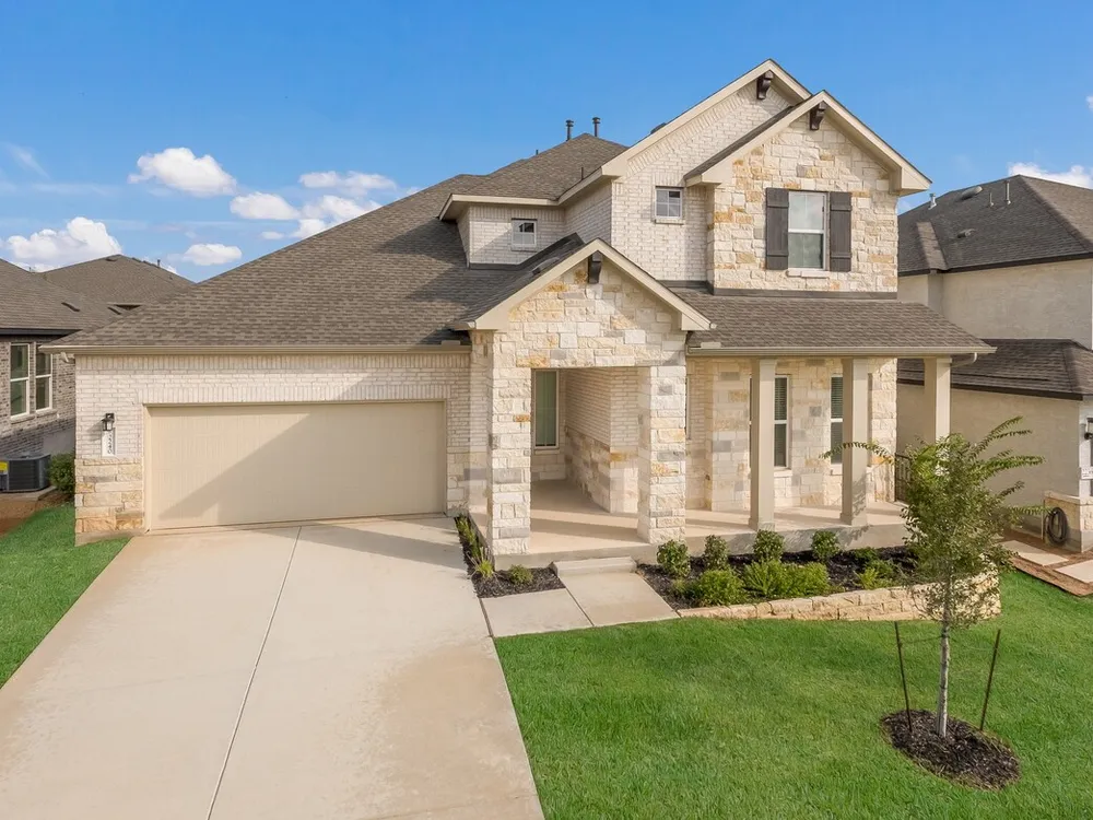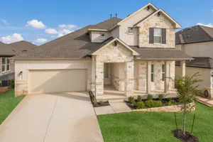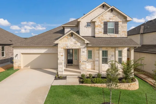 ** MOVE-IN READY! ** This hill country style home boasts a charming front porch with a luxurious 8' front door. The primary bedroom and a second bedroom are conveniently located on the first level, along with two full bathrooms. The plan features 8' tall interior doors and 10' ceilings on the first level, with the family room showcasing impressive 20' ceilings and a fireplace. The island kitchen offers built-in stainless steel appliances and a gas cooktop, while the dining room is extended 3' for larger gatherings. Outside, the extended covered patio includes a ceiling fan and gas stub out for future grilling. Upstairs, you'll find 2 bedrooms, a game room, and a separate media room. Situated in the desirable Veramendi community, with nearly 500 acres of parks, a community pool, and more. Ideal for active lifestyles and family living!