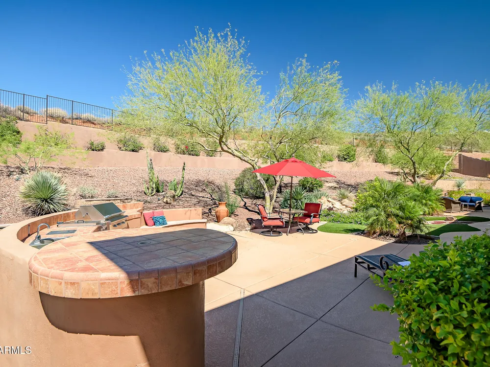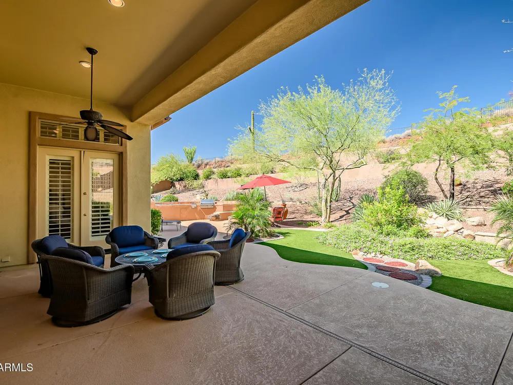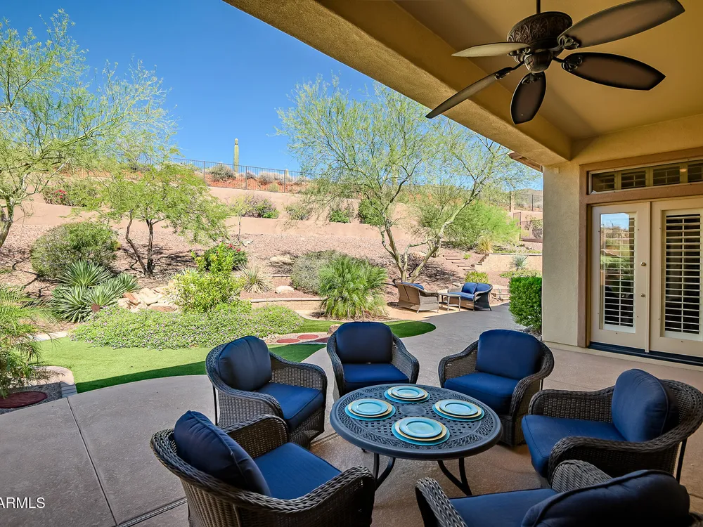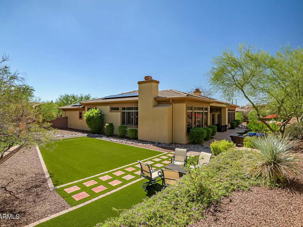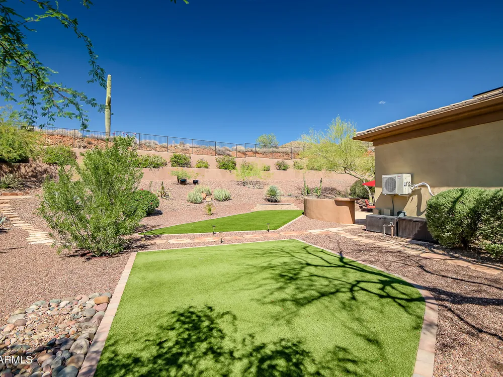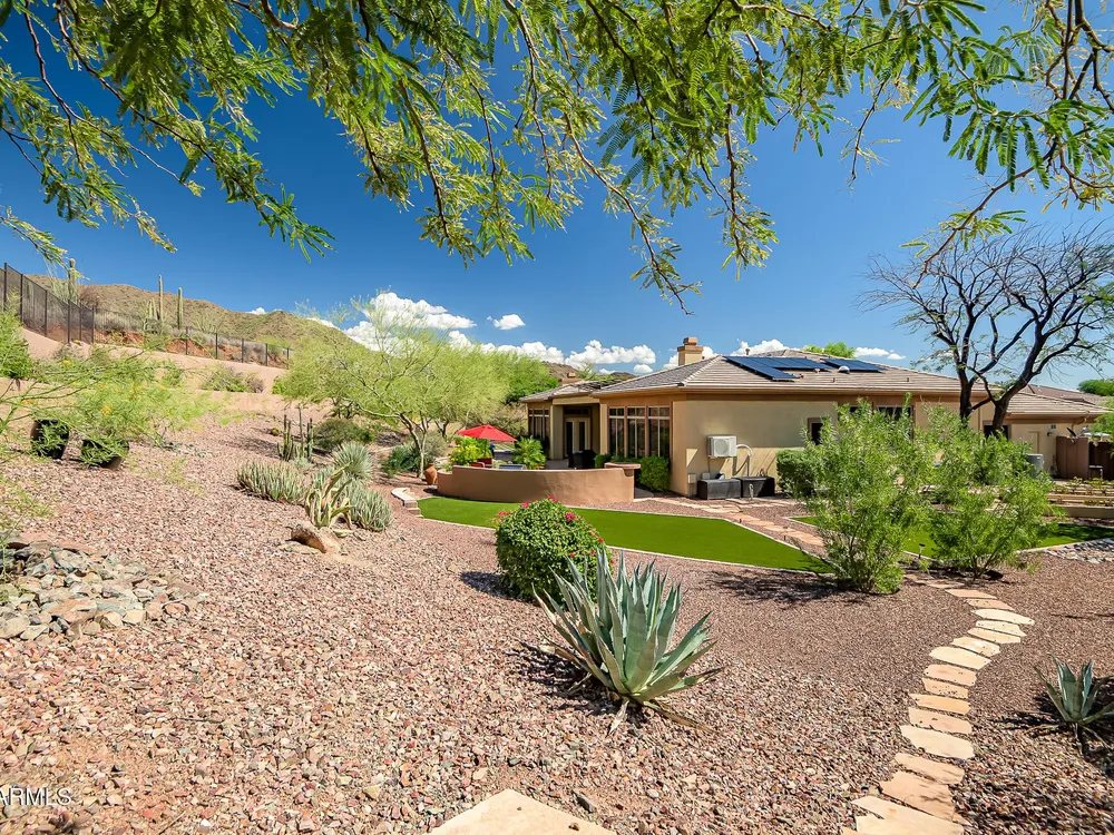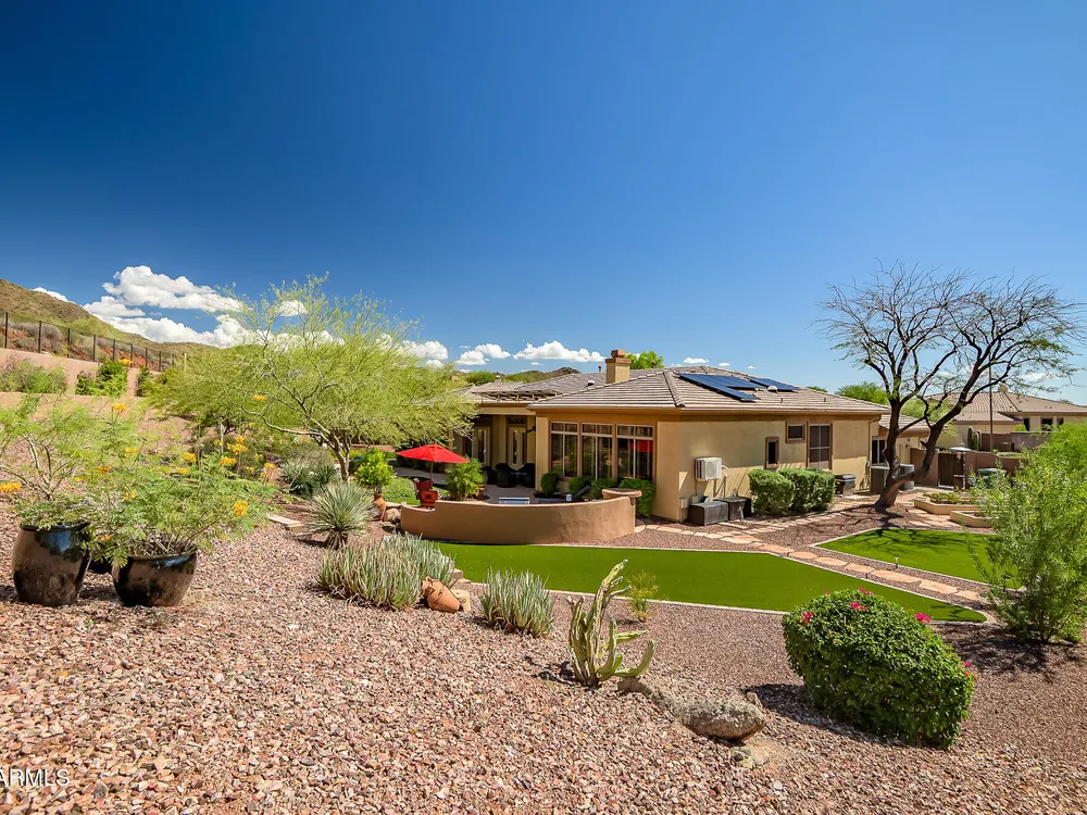 Solar panels are owned, less than 2 years old, and convey to new owner. Two updated Trane Air Conditioning systems 7 years old. Roof replaced less than 2 years ago. Kitchen appliances less than 2 years old except microwave. Roof replaced less than 2 years ago. Stunning Amherst model on huge oversized lot backing to natural desert with total privacy! Located in one of the most quiet and peaceful neighborhoods in Anthem Country Club, home its on over a half acre lot, room to build a guest casita, bocce-ball court, putting green, expansive garden, etc., the opportunities to create your own private outdoor resort are endless!! Existing garage can be easily converted back to 3-car or keep it as a utility/work room. There is a pool in the backyard that was filled in by the current owners but may be brought back to life. Backyard has been expanded with beautiful synthetic green grass all around. This beautiful estate property also features elegant interior upgrades that include polished travertine flooring throughout (currently covered by floated LVT that can easily be removed), solar tubes, plantation shutters, crown molding, rich custom cabinetry with slide out shelving, custom walk in pantry, custom kitchen island, custom built in art display wall, custom built in office shelving, custom lighting and paint everywhere. This floor plan includes a dedicated office and the optional "Garden Room" which can be used a 4th bedroom or second office and has French doors to the front courtyard. Your backyard living space greets you with a potential pool, waterfall, covered patio, built-in BBQ kitchen island, fire pit and incredible spacious privacy! Country Club Lifestyle with Resort Style Amenities...Anthem Country Club is managed by Club Corp which offers many great benefits to members that reciprocate around the world! Two 18 hole golf courses, Persimmons and Ironwood, designed by Greg Nash. 2 Pro shops, 2 sets of men's and women's lounges / locker rooms, 2 member restaurants, 2 gyms, 2 pools, 2 spas, several tennis courts, Gorgeous Ball Room for ongoing Member events and private events venues available as well, 2 Impressive guard gated entrances, all surrounded by breathtaking mountain and golf course views...you will love being a member of the Anthem Golf & Country Club!