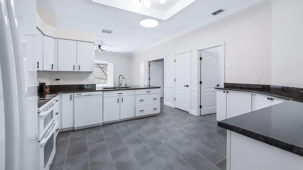 Ideally located in a popular guard gated 55+ Resort community, with over 2,100 sq. ft. of contemporary living this home combines the finest finishes with multiple upgrades. This exquisite 3 Bedroom 2 Bath home can adapt to any lifestyle. With Ceramic Plank Tile flooring throughout and large windows, this home offers an open, airy floor plan with lots of natural light for your enjoyment and that is perfect for entertaining family and friends. As you walk through the front door you will be greeted with a spacious living room and formal dining room graced with high ceilings, crown molding, and chair rail all painted in neutral colors. As you move on the modernized updated spacious kitchen you will find an abundance of cabinets, granite countertops, new tile, skylight, and pendant lighting. The kitchen is also graced with a Range with a double oven, Dishwasher, Microwave, garbage disposal and Refrigerator. The Office/Den/Study which can easily be converted to a 3rd bedroom and has been newly tiled with a walk in closet. The heart of the home is the open, bright, and spacious Family Room, Kitchen, Florida Room, and Screened in Lanai overlooks the golf course lot. This home boasts, New Tile throughout with 4” Baseboards, Crown Molding, Chair Rail, Newer Washer and Dryer, Newer Hot Water Heater, Water Softener, and Newer Ceiling Fans, Water Softener, Freshly Painted. The large bright primary ensuite hosts a large closet and sliders leading out to the Florida Room. The primary bathroom boasts his and her sinks, quartz counter tops, a walk- in closet, walk in tub and walk in shower. The 2nd bedroom is large and has a new ceiling fan. The 2nd bathroom is strategically placed next to the 2nd bedroom. The 2nd bathroom has been renovated with a newly tiled shower, vanity, tile, and the walls have been ½ way tiled up for that new fashionable look. The garage has a sink for those outdoor clean ups before going into the home. Kings Ridge enhances easy shopping by driving your golf cart to Publix, Restaurants, Salons, Pet Supply and Groomer, Liquor Store, Ice Cream, McDonalds, Banking, UPS, Gas Station, etc. Discover the epitome of comfortable active lifestyle living in Kings Ridge. Kings Ridge boasts 2 Golf Courses, 3 Pools, Hot/Cold Tubs, Dry Saunas, Steam Rooms, 2 Gyms, Tennis Courts, Pickleball Courts, Bocca Ball & Shuffleboard, and Basketball Courts. The Multi-Million Dollar Club House, is the heart of activities with Entertainment, Dances, Social Events, Games, Travel Clubs, etc. The monthly maintenance fees include lawn care, home phone, maintenance and trimming of shrubs, irrigation and replacement of sprinkler heads, basic cable TV and internet, and road maintenance, and exterior painting every seven years. WELCOME TO A WELCOMING HAVEN CALLED HOME!