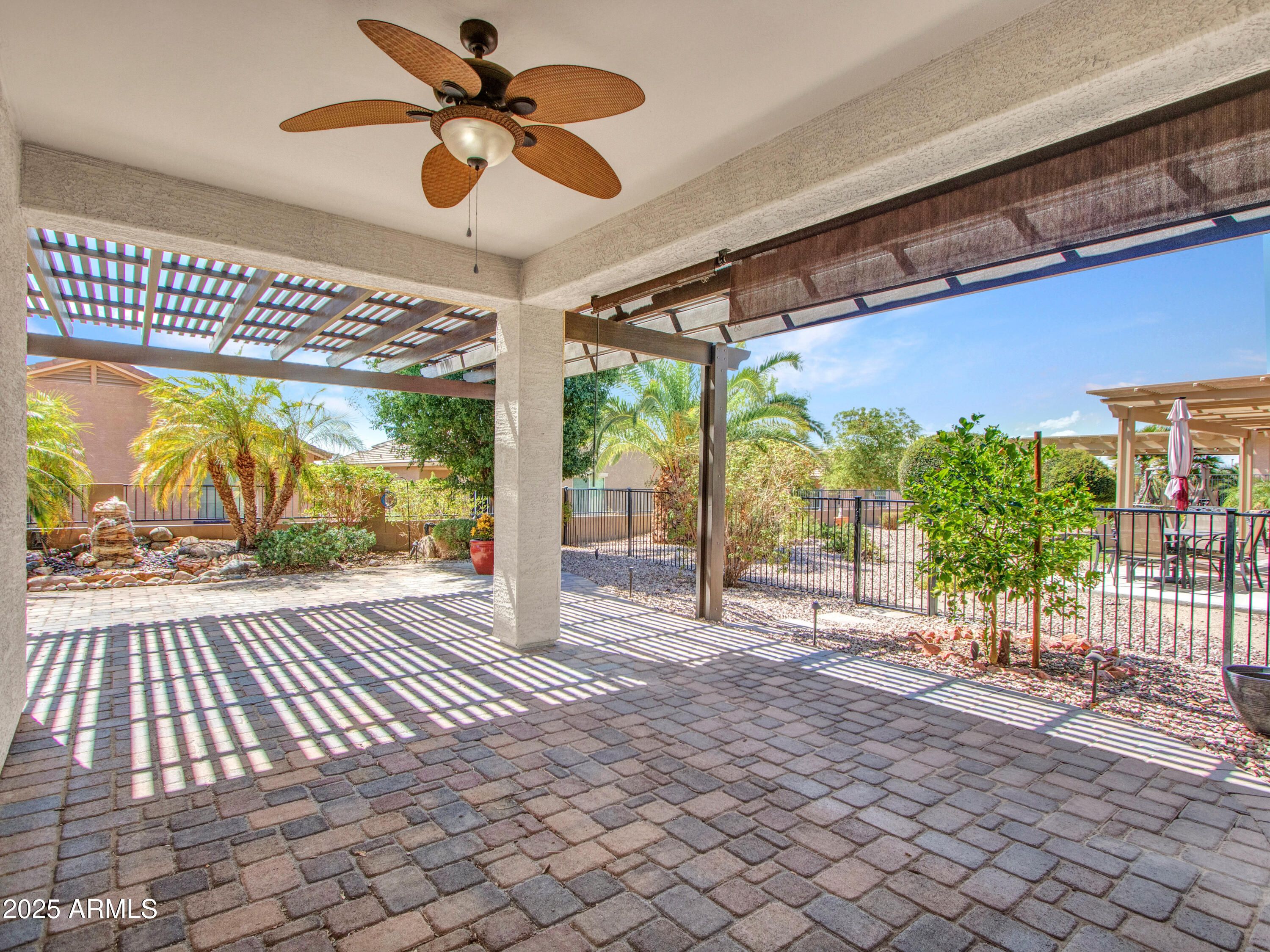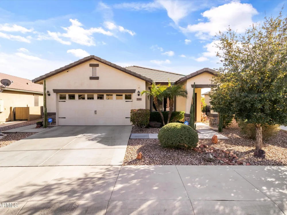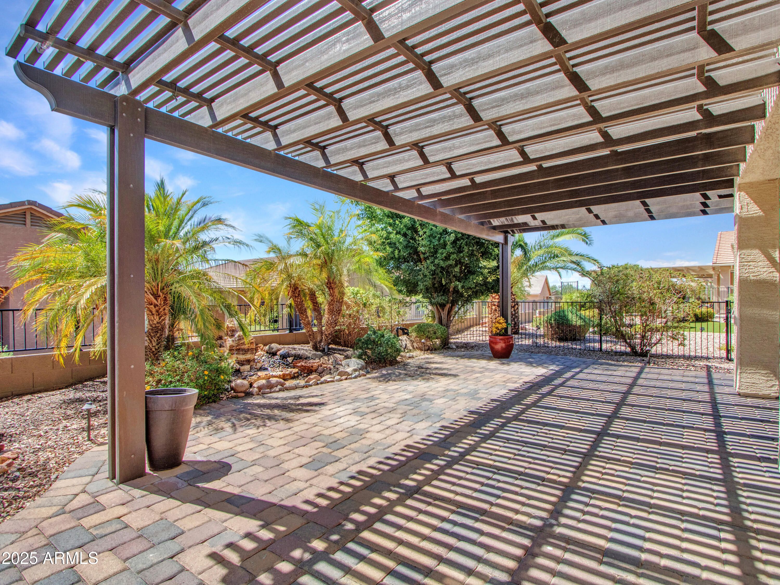 Beautifully upgraded home in the desirable Sundance Active Adult 55+ community. This open-concept floor plan features a gourmet kitchen with stainless steel appliances, double oven range, granite countertops, upgraded cabinetry, and pull-out shelving. The spacious living area includes a stone accent wall and French doors, while custom closet organizers offer practical storage throughout. A whole-home water filtration system adds comfort and convenience. Enjoy outdoor living on the large paver patio with pergola, surrounded by lighted, professionally landscaped grounds that provide privacy and the perfect spot to enjoy Arizona's colorful sunsets. Thoughtfully maintained and move-in ready, this home combines comfort, style, and functionality in a peaceful resort-style setting. This thoughtfully designed home has been maintained with care and includes features that enhance both daily living and entertaining. The kitchen is a true centerpiece with its double oven range, granite counters, and abundant cabinetry. Throughout the home, upgrades such as custom storage systems and quality finishes set it apart. Outdoors, the pergola-covered patio offers shade and comfort, complemented by a built-in sound system and professionally landscaped yard with accent lighting. The result is a private retreat that extends your living space. In the Sundance community, residents enjoy neighborhood amenities along with quick access to shopping, dining, and major highways. Conveniently located near major new shopping and dining options, offering everything from warehouse clubs, popular restaurants, to the new THE LANDING, a premier destination for all things recreation, entertainment, & shopping just a few minutes drive away.