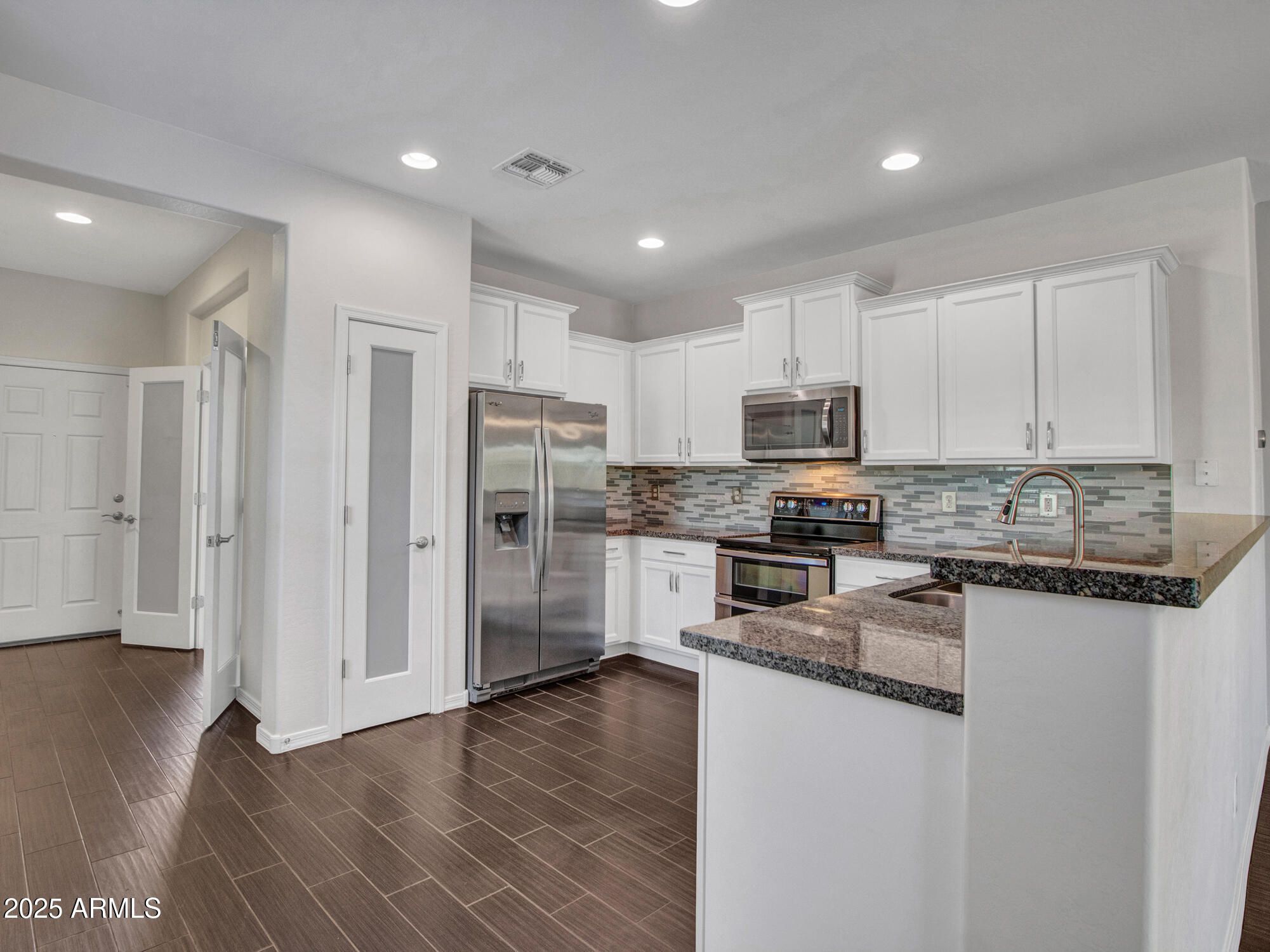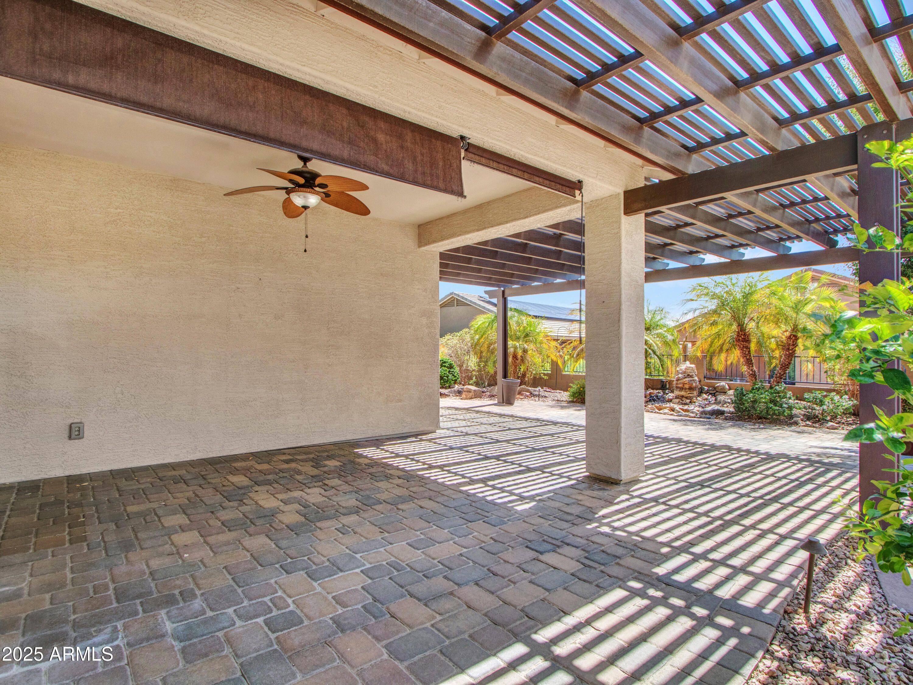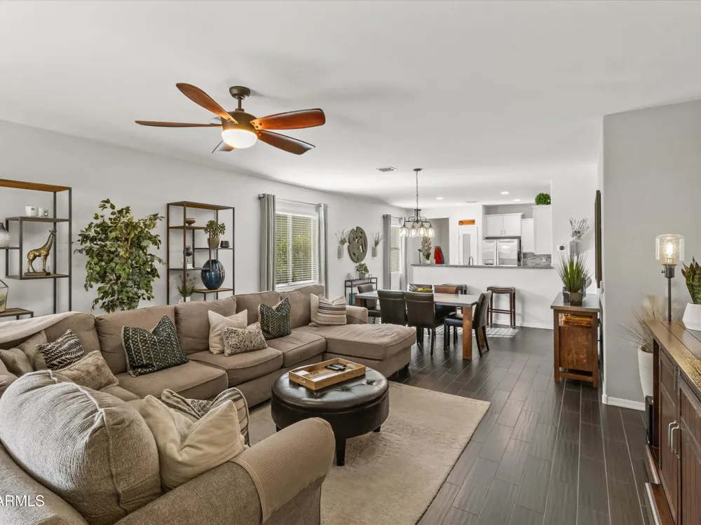 Beautifully upgraded home in the desirable Sundance Active Adult 55+ community. This open-concept floor plan features a gourmet kitchen with stainless steel appliances, double oven range, granite countertops, upgraded cabinetry, and pull-out shelving. The spacious living area includes a stone accent wall and French doors, while custom closet organizers offer practical storage throughout. A whole-home water filtration system adds comfort and convenience. Enjoy outdoor living on the large paver patio with pergola, surrounded by lighted, professionally landscaped grounds that provide privacy and the perfect spot to enjoy Arizona's colorful sunsets. Thoughtfully maintained and move-in ready, this home combines comfort, style, and functionality in a peaceful resort-style setting. This thoughtfully designed home has been maintained with care and includes features that enhance both daily living and entertaining. The kitchen is a true centerpiece with its double oven range, granite counters, and abundant cabinetry. Throughout the home, upgrades such as custom storage systems and quality finishes set it apart. Outdoors, the pergola-covered patio offers shade and comfort, complemented by a built-in sound system and professionally landscaped yard with accent lighting. The result is a private retreat that extends your living space. In the Sundance community, residents enjoy neighborhood amenities along with quick access to shopping, dining, and major highways. Conveniently located near major new shopping and dining options, offering everything from warehouse clubs, popular restaurants, to the new THE LANDING, a premier destination for all things recreation, entertainment, & shopping just a few minutes drive away.