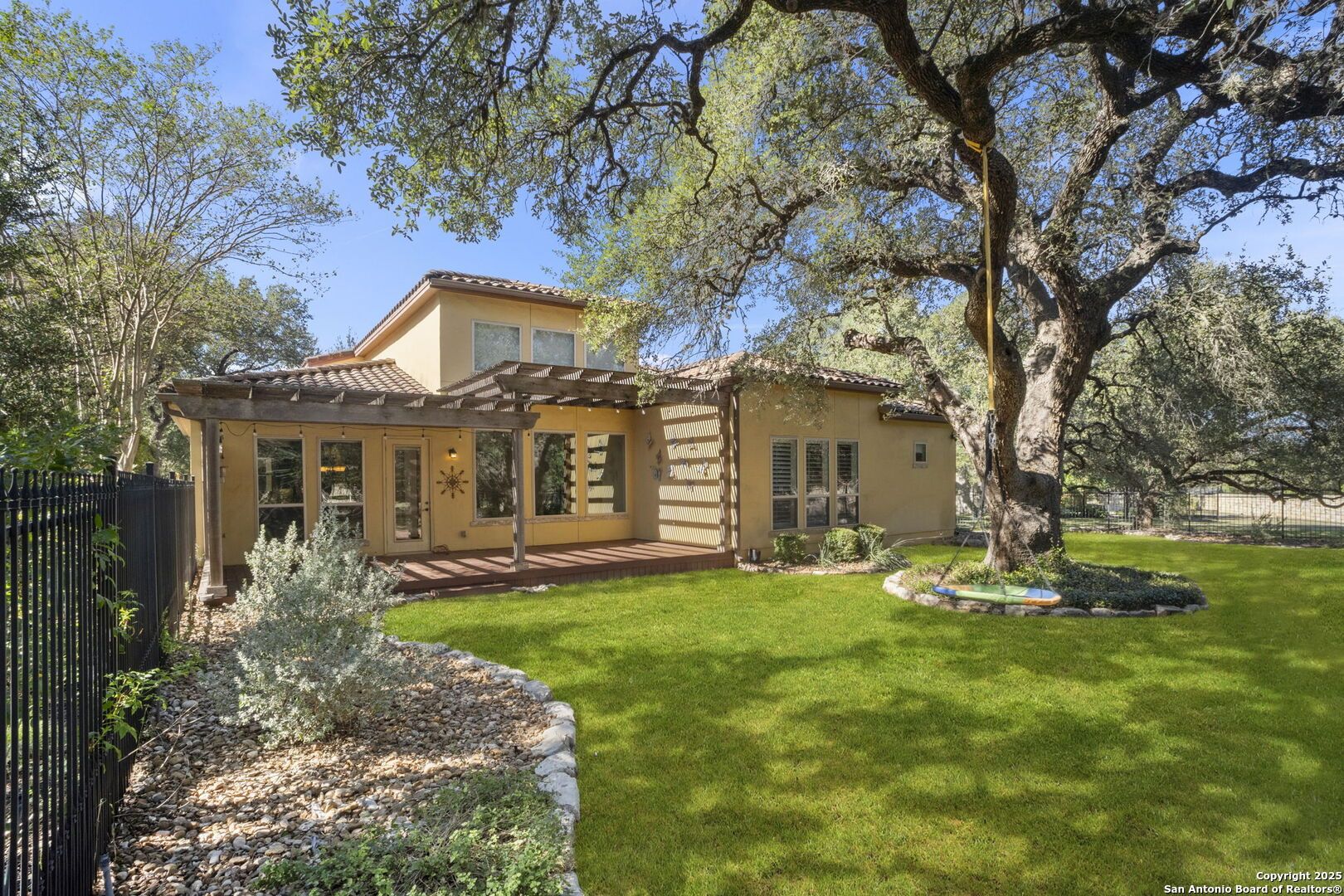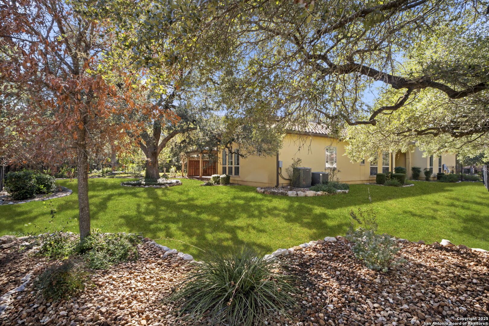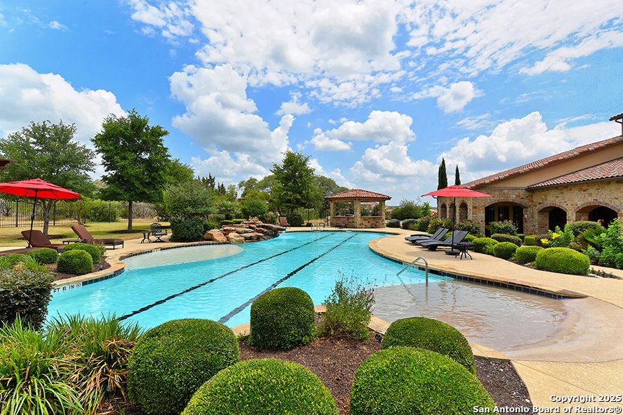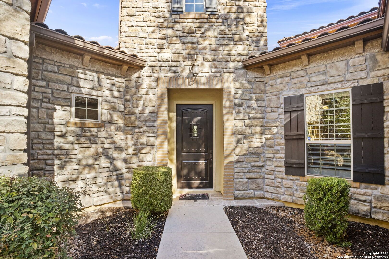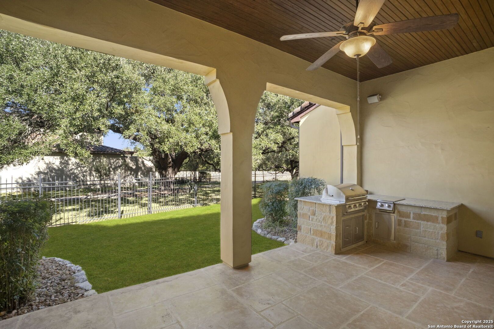 Welcome to 22426 Viajes - a stunning Sitterle-built home in the prestigious gated enclave of Campanas at Cibolo Canyons. This elegant 4-bedroom, 4-bath residence offers 3,765 square feet of refined living space, showcasing timeless craftsmanship and exceptional attention to detail throughout.From the moment you enter, a barrel-ceiling foyer sets the tone for sophistication, leading into a thoughtfully designed floor plan perfect for entertaining, relaxing, and everyday living. The home features travertine and hardwood flooring, custom built-ins, and granite countertops, with plantation shutters enhancing each bedroom.The chef's kitchen is a true centerpiece, equipped with a KitchenAid built-in refrigerator, JennAir stainless steel appliances, double ovens, gas range with pot filler, and two pantries. A large island, built-in desk, and breakfast area with buffet cabinetry create a seamless blend of style and function. The wine pantry with an ornate iron scrolled door adds a sophisticated touch.The owner's suite serves as a private retreat with wood floors, a recessed ceiling, and a spa-inspired bath featuring dual vanities, a makeup area, soaking tub, travertine shower, and two expansive walk-in closets. The split floor plan ensures privacy, with each secondary bedroom offering its own full bath. One bedroom includes custom shelving, making it an ideal home office or study. The living room impresses with its soaring ceilings, surround sound, abundant natural light, and custom built-in cabinetry. A flex room with exposed beam detailing and wood floors offers versatility-perfect for a dining area, library, bar/lounge, or home gym.Step outside to a private backyard oasis shaded by mature oak trees, featuring a sprinkler system and two covered patios, one with a built-in cooking station and granite countertops-ideal for outdoor entertaining.The HOA at Campanas provides a comprehensive, year-round landscape maintenance program included with homeownership. Services include weekly mowing, edging, weeding, trash pickup, and power-blowing of curbs and walkways during peak seasons, with bi-weekly service in winter months. All beds are weeded monthly, and shrubs and plant material (both under and over 6 feet) receive scheduled trimming throughout the year, along with bed cultivation and chemical weed treatments. Tree suckers under six feet are removed as needed. The HOA also monitors irrigation monthly, provides seasonal turf fertilization, shrub fertilization, annual color installation, and crepe myrtle pruning. Turf pre-emergent and post-emergent weed control are applied at specific intervals, and ant insecticide treatments are included through WW Pest as necessary. Front yard beds are re-mulched seasonally. Altogether, the program ensures consistent, professional landscape care without homeowners needing to manage any exterior yard work themselves.Residents of Campanas enjoy a lock-and-leave lifestyle with HOA-covered lawn care, landscaping, and home security monitoring, plus access to the Campanas Clubhouse, which offers a resort-style pool, gym, library, game room, pickleball and tennis courts, and scenic walking trails. Homeowners also enjoy privileges at the Cibolo Canyons Amenity Centers, featuring a lazy river, additional pools, fitness facilities, and social gathering spaces.Located just minutes from top-rated schools, shopping, medical centers, and the JW Marriott San Antonio Hill Country Resort & Spa-home to TPC San Antonio's two championship golf courses-this home offers luxury, comfort, and convenience in one exquisite package.Move-in ready and beautifully maintained-your Hill Country lifestyle awaits.