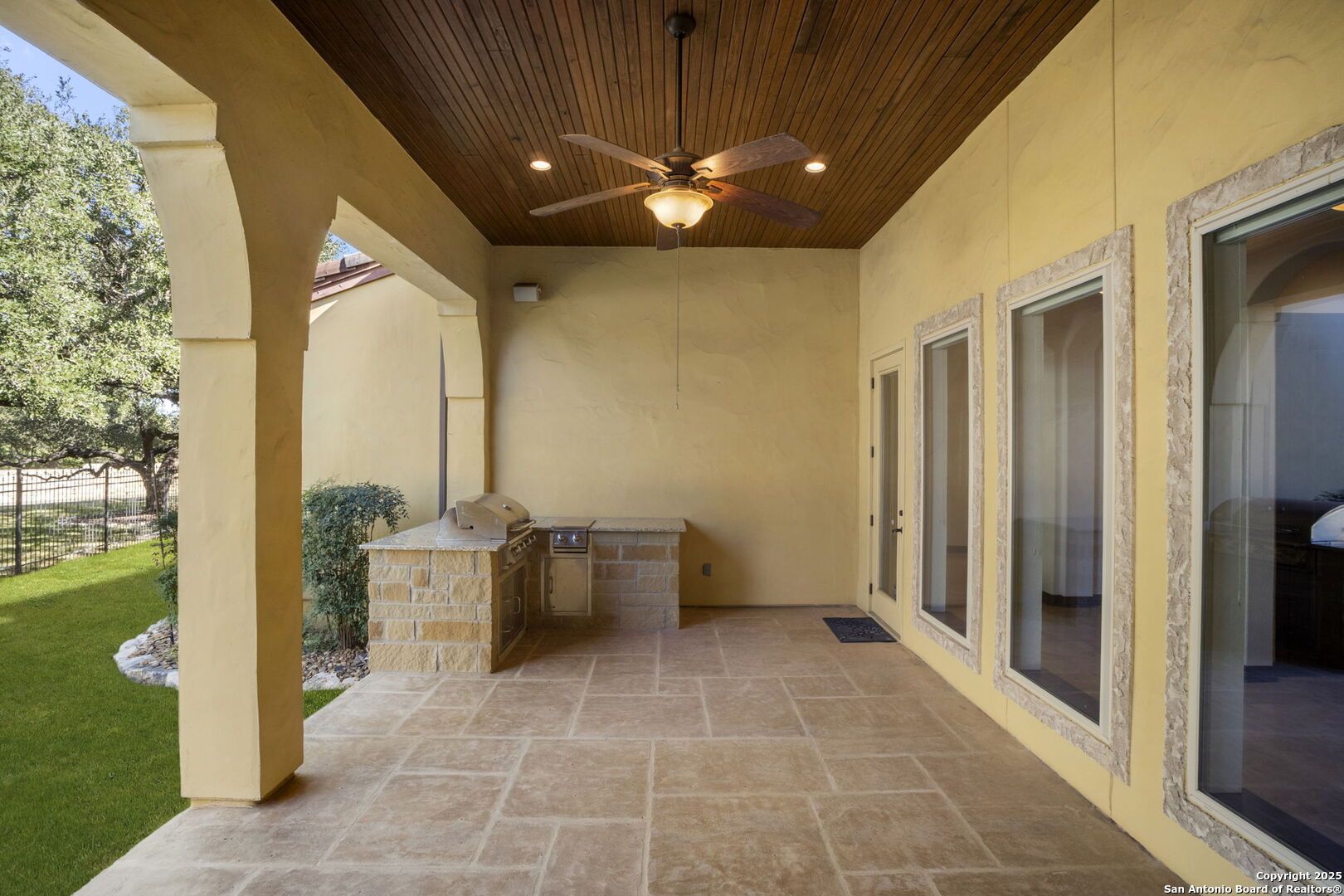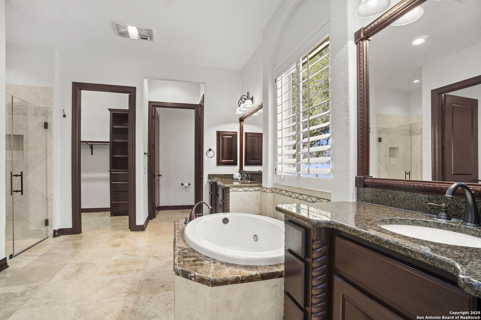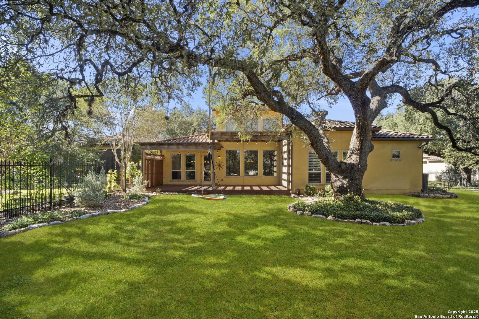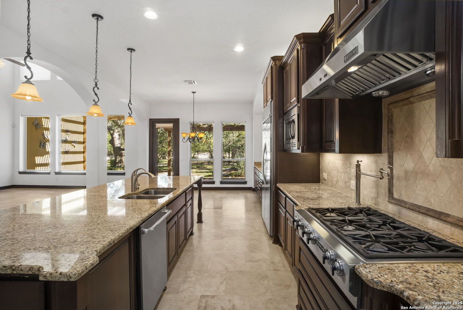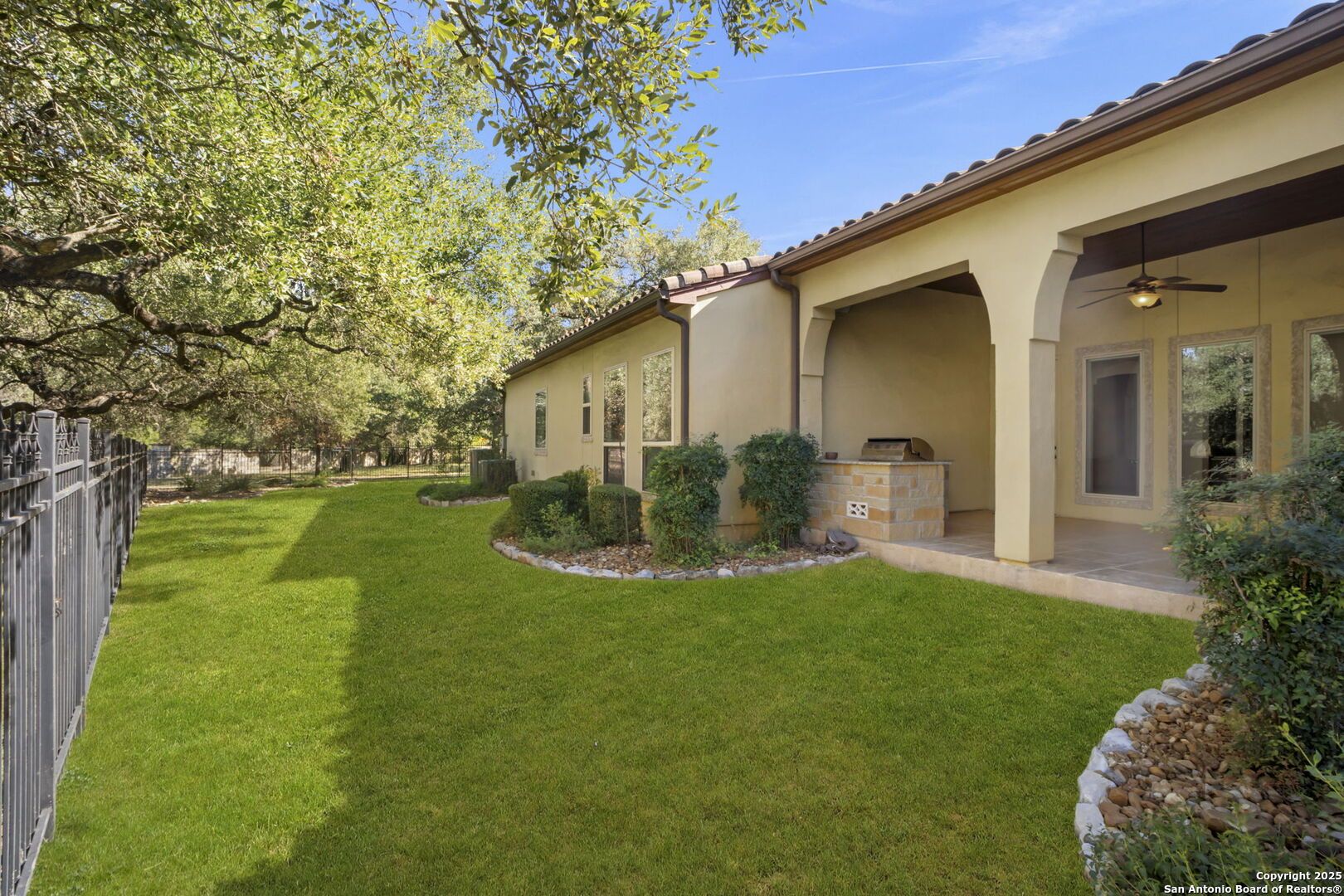 Welcome to 22426 Viajes - a stunning Sitterle-built home in the prestigious gated enclave of Campanas at Cibolo Canyons. This elegant 4-bedroom, 4-bath residence offers 3,765 square feet of refined living space, showcasing timeless craftsmanship and exceptional attention to detail throughout.From the moment you enter, a barrel-ceiling foyer sets the tone for sophistication, leading into a thoughtfully designed floor plan perfect for entertaining, relaxing, and everyday living. The home features travertine and hardwood flooring, custom built-ins, and granite countertops, with plantation shutters enhancing each bedroom.The chef's kitchen is a true centerpiece, equipped with a KitchenAid built-in refrigerator, JennAir stainless steel appliances, double ovens, gas range with pot filler, and two pantries. A large island, built-in desk, and breakfast area with buffet cabinetry create a seamless blend of style and function. The wine pantry with an ornate iron scrolled door adds a sophisticated touch.The owner's suite serves as a private retreat with wood floors, a recessed ceiling, and a spa-inspired bath featuring dual vanities, a makeup area, soaking tub, travertine shower, and two expansive walk-in closets. The split floor plan ensures privacy, with each secondary bedroom offering its own full bath. One bedroom includes custom shelving, making it an ideal home office or study. The living room impresses with its soaring ceilings, surround sound, abundant natural light, and custom built-in cabinetry. A flex room with exposed beam detailing and wood floors offers versatility-perfect for a dining area, library, bar/lounge, or home gym.Step outside to a private backyard oasis shaded by mature oak trees, featuring a sprinkler system and two covered patios, one with a built-in cooking station and granite countertops-ideal for outdoor entertaining.The HOA at Campanas provides a comprehensive, year-round landscape maintenance program included with homeownership. Services include weekly mowing, edging, weeding, trash pickup, and power-blowing of curbs and walkways during peak seasons, with bi-weekly service in winter months. All beds are weeded monthly, and shrubs and plant material (both under and over 6 feet) receive scheduled trimming throughout the year, along with bed cultivation and chemical weed treatments. Tree suckers under six feet are removed as needed. The HOA also monitors irrigation monthly, provides seasonal turf fertilization, shrub fertilization, annual color installation, and crepe myrtle pruning. Turf pre-emergent and post-emergent weed control are applied at specific intervals, and ant insecticide treatments are included through WW Pest as necessary. Front yard beds are re-mulched seasonally. Altogether, the program ensures consistent, professional landscape care without homeowners needing to manage any exterior yard work themselves.Residents of Campanas enjoy a lock-and-leave lifestyle with HOA-covered lawn care, landscaping, and home security monitoring, plus access to the Campanas Clubhouse, which offers a resort-style pool, gym, library, game room, pickleball and tennis courts, and scenic walking trails. Homeowners also enjoy privileges at the Cibolo Canyons Amenity Centers, featuring a lazy river, additional pools, fitness facilities, and social gathering spaces.Located just minutes from top-rated schools, shopping, medical centers, and the JW Marriott San Antonio Hill Country Resort & Spa-home to TPC San Antonio's two championship golf courses-this home offers luxury, comfort, and convenience in one exquisite package.Move-in ready and beautifully maintained-your Hill Country lifestyle awaits.