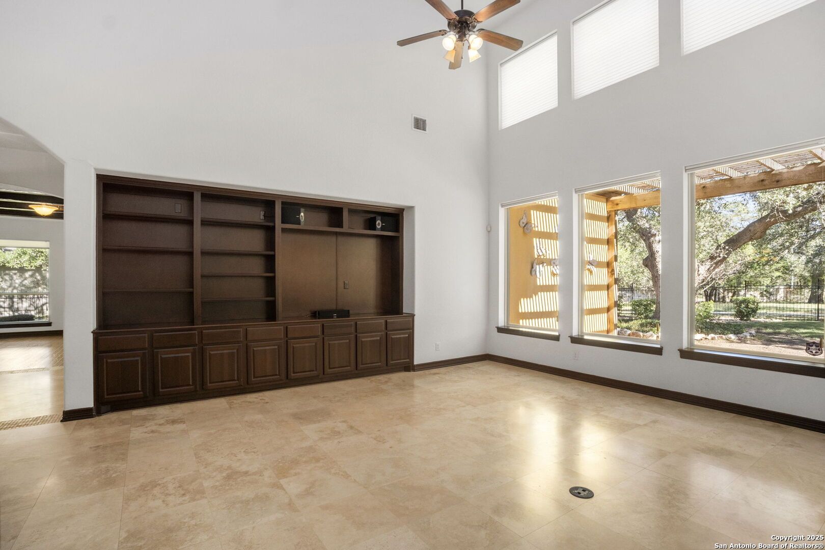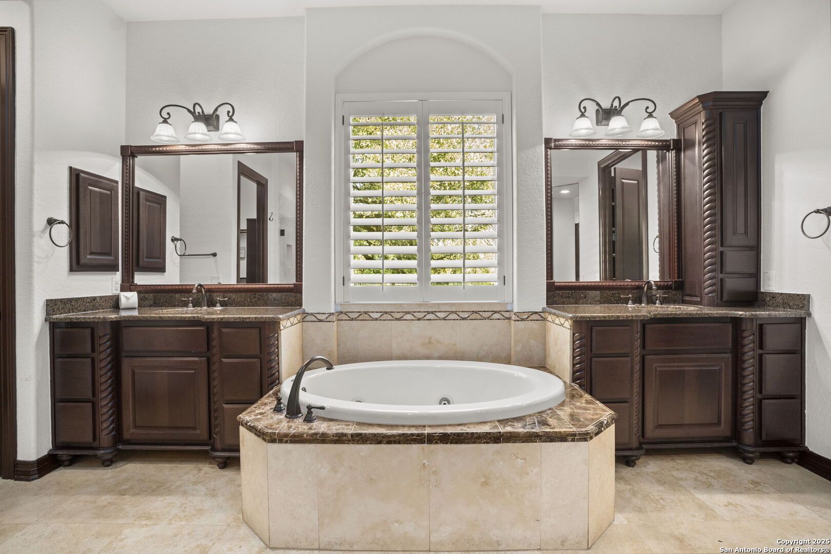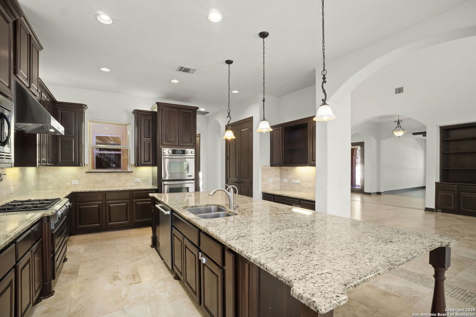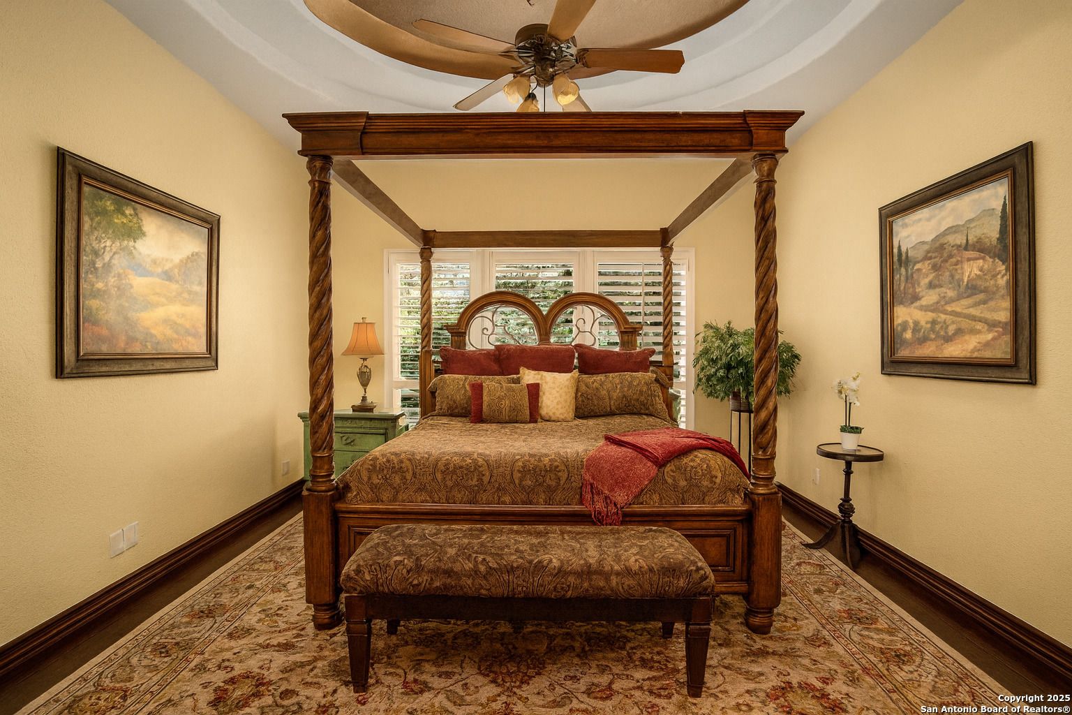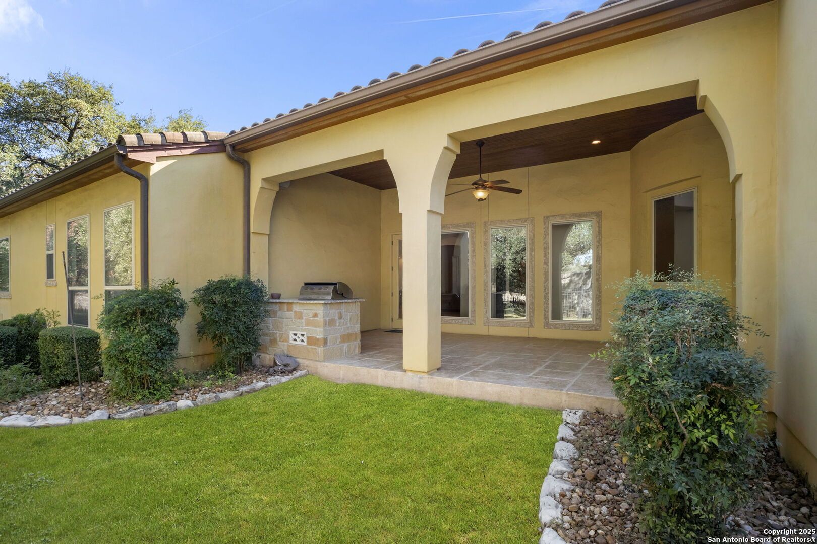 Welcome to 22426 Viajes - a stunning Sitterle-built home in the prestigious gated enclave of Campanas at Cibolo Canyons. This elegant 4-bedroom, 4-bath residence offers 3,765 square feet of refined living space, showcasing timeless craftsmanship and exceptional attention to detail throughout.From the moment you enter, a barrel-ceiling foyer sets the tone for sophistication, leading into a thoughtfully designed floor plan perfect for entertaining, relaxing, and everyday living. The home features travertine and hardwood flooring, custom built-ins, and granite countertops, with plantation shutters enhancing each bedroom.The chef's kitchen is a true centerpiece, equipped with a KitchenAid built-in refrigerator, JennAir stainless steel appliances, double ovens, gas range with pot filler, and two pantries. A large island, built-in desk, and breakfast area with buffet cabinetry create a seamless blend of style and function. The wine pantry with an ornate iron scrolled door adds a sophisticated touch.The owner's suite serves as a private retreat with wood floors, a recessed ceiling, and a spa-inspired bath featuring dual vanities, a makeup area, soaking tub, travertine shower, and two expansive walk-in closets. The split floor plan ensures privacy, with each secondary bedroom offering its own full bath. One bedroom includes custom shelving, making it an ideal home office or study. The living room impresses with its soaring ceilings, surround sound, abundant natural light, and custom built-in cabinetry. A flex room with exposed beam detailing and wood floors offers versatility-perfect for a dining area, library, bar/lounge, or home gym.Step outside to a private backyard oasis shaded by mature oak trees, featuring a sprinkler system and two covered patios, one with a built-in cooking station and granite countertops-ideal for outdoor entertaining.The HOA at Campanas provides a comprehensive, year-round landscape maintenance program included with homeownership. Services include weekly mowing, edging, weeding, trash pickup, and power-blowing of curbs and walkways during peak seasons, with bi-weekly service in winter months. All beds are weeded monthly, and shrubs and plant material (both under and over 6 feet) receive scheduled trimming throughout the year, along with bed cultivation and chemical weed treatments. Tree suckers under six feet are removed as needed. The HOA also monitors irrigation monthly, provides seasonal turf fertilization, shrub fertilization, annual color installation, and crepe myrtle pruning. Turf pre-emergent and post-emergent weed control are applied at specific intervals, and ant insecticide treatments are included through WW Pest as necessary. Front yard beds are re-mulched seasonally. Altogether, the program ensures consistent, professional landscape care without homeowners needing to manage any exterior yard work themselves.Residents of Campanas enjoy a lock-and-leave lifestyle with HOA-covered lawn care, landscaping, and home security monitoring, plus access to the Campanas Clubhouse, which offers a resort-style pool, gym, library, game room, pickleball and tennis courts, and scenic walking trails. Homeowners also enjoy privileges at the Cibolo Canyons Amenity Centers, featuring a lazy river, additional pools, fitness facilities, and social gathering spaces.Located just minutes from top-rated schools, shopping, medical centers, and the JW Marriott San Antonio Hill Country Resort & Spa-home to TPC San Antonio's two championship golf courses-this home offers luxury, comfort, and convenience in one exquisite package.Move-in ready and beautifully maintained-your Hill Country lifestyle awaits.